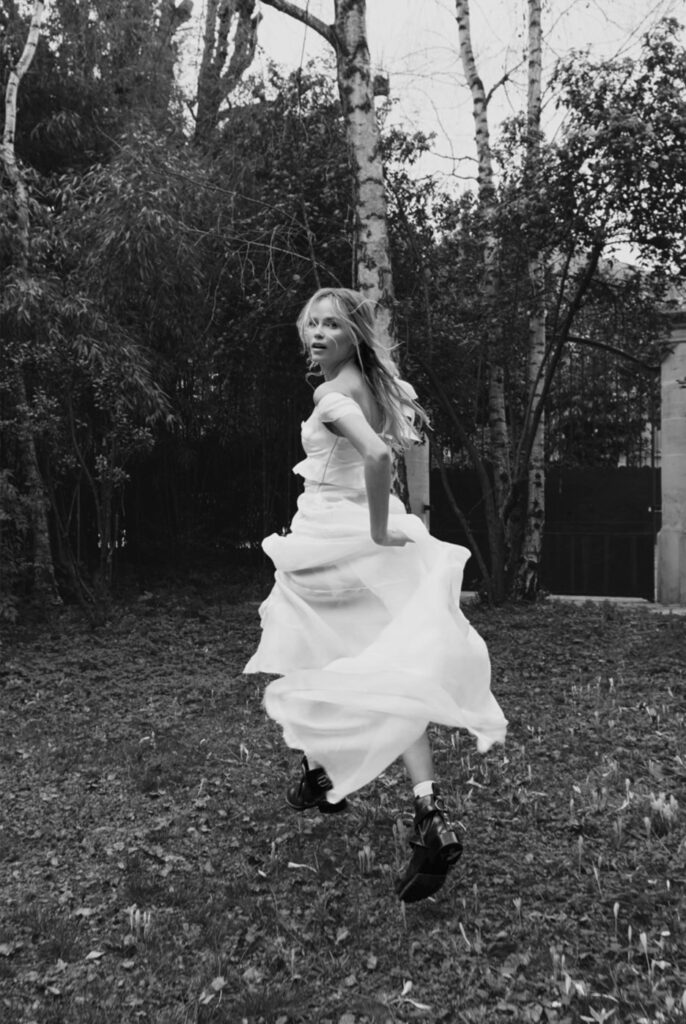 После этого молодожены сбежали от гостей, гуляли вдвоем по местам первых свиданий, зашли в ресторан, где они познакомились, пили шампанское, смеялись, пускали конфетти и танцевали на улицах – проводили время, как им хочется. Макияж должен был смотреться ультрамодно и современно с коротким платьем и не выглядеть тяжелым на прогулке. Мы облегчили образ, убрав волосы в актуальный сейчас гладкий пучок. Таким образом, акцент остался на красной помаде, но сам образ выглядел уже лаконичным и молодежным.