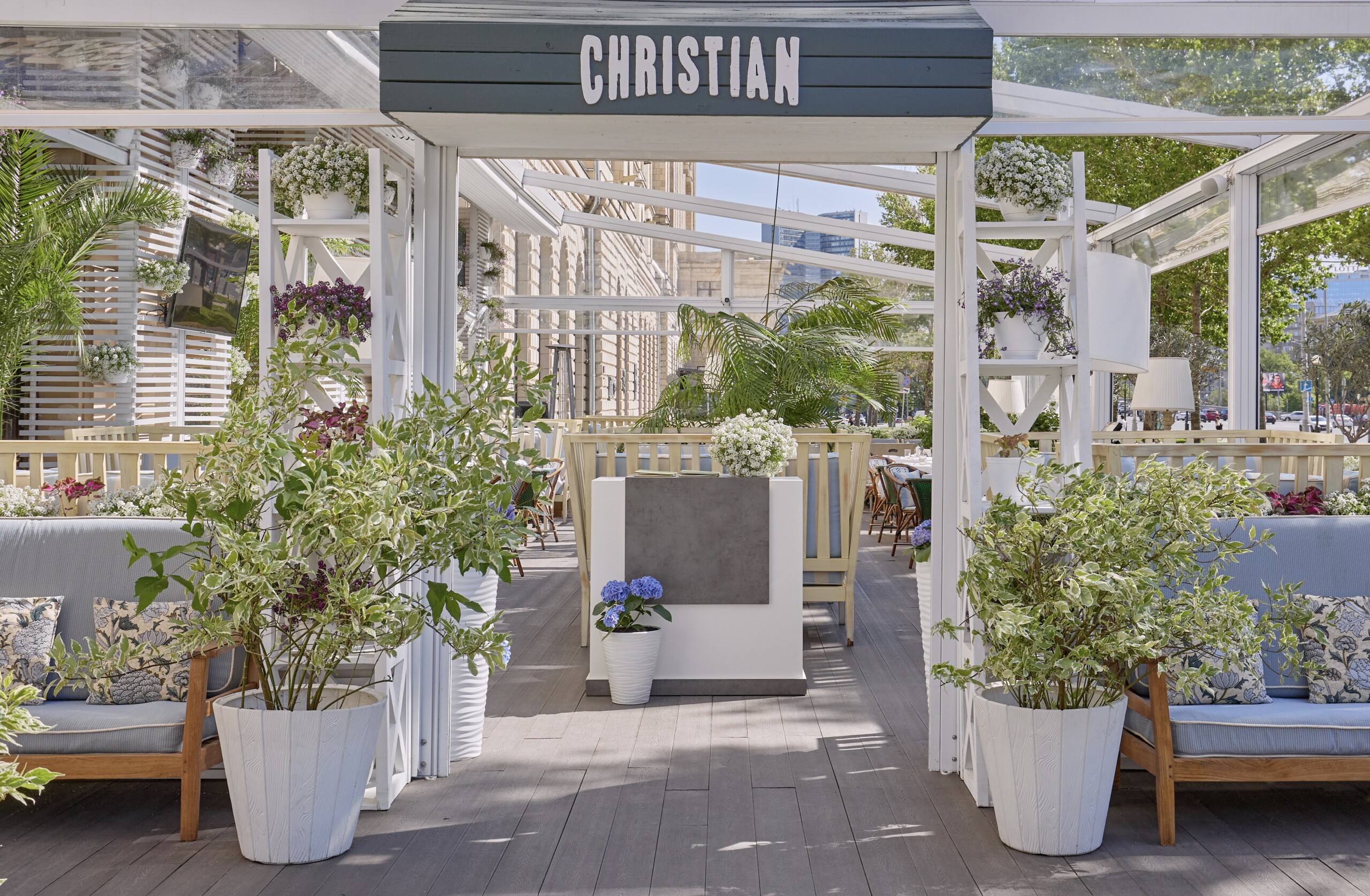 Скучаете по Тоскане? Это очень легко исправить на летней веранде итальянского ресторана Атмосфера Тосканы на летней веранде Christian. Здесь, среди пальм и цветов, легко почувствовать себя на курорте. Южное настроение создают яркие гортензии, розы и баварская герань, а за тонкий медовый аромат отвечает алиссум. Добавляет очарования удобная мебель с полосатой обивкой — такую же можно встретить в ресторанах на тосканском побережье в Форте-дей-Марми. Не хватает только шума прибоя, но его компенсирует разнообразие блюд из свежайших морепродуктов и сезонные новинки в меню ресторана от шеф-повара Кристиана Лоренцини, креативные коктейли и освежающие лимонады.
