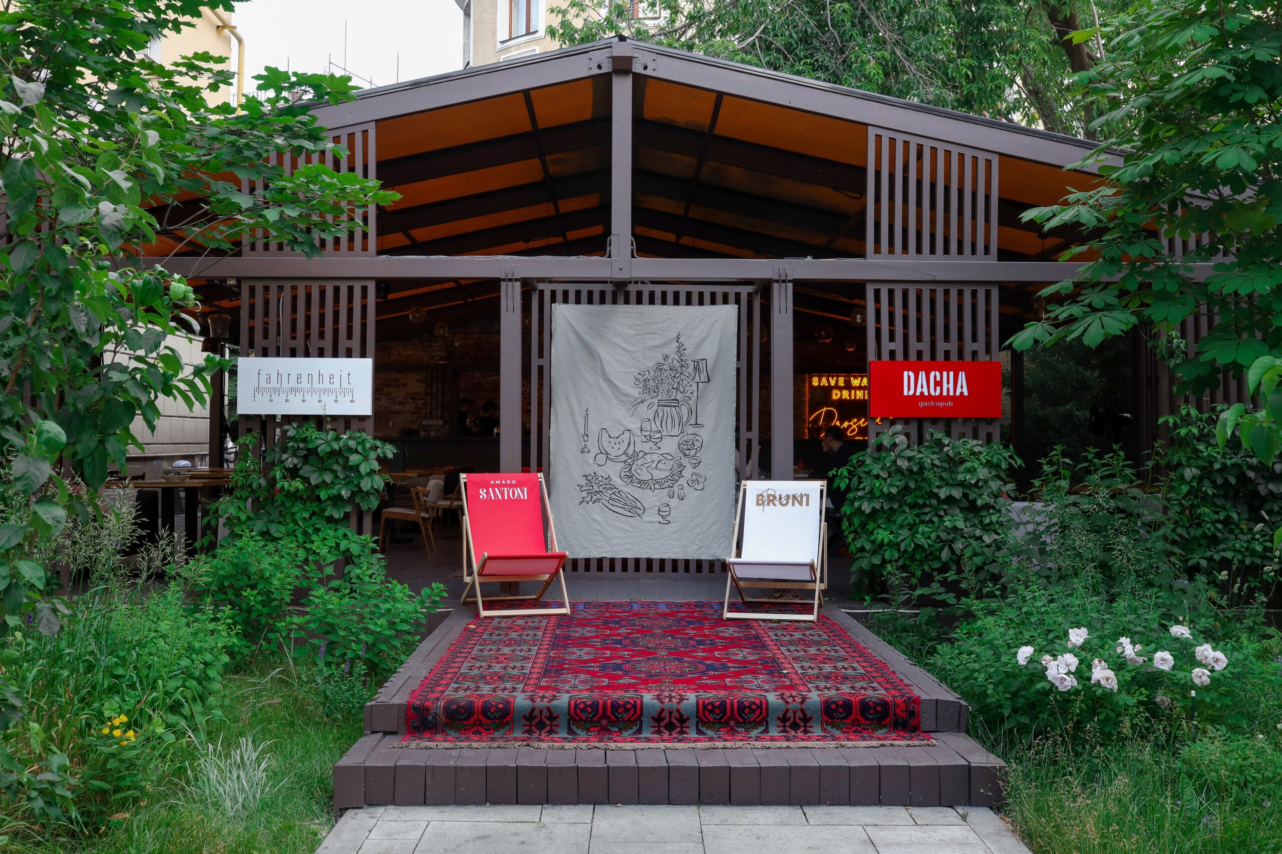 Каждый год ресторан Fahrenheit запускает pop-up веранду в коллаборации с тем или иным модным заведением. В этом году выбор пал на Dacha Gastropub. Просторная веранда Fahrenheit превратилась в дачное пространство с уютными креслами-качалками и летящими льняными шторами. Выпить коктейль и поужинать можно как на диванах с мягкими подушками, так и за открытым баром.