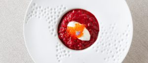Ингредиенты (на 4 порции): свекла (2 кг), лук-шалот (2 головки), рис Vialone Nano (360 г), сухое белое вино (120 мл), тертый пармезан (60 г), несоленое сливочное масло (80 г), оливковое масло (40 мл), сметана (120 г), лососевая икра (40 г), морковь (300 г), сельдерей (200 г), лук (1 шт.), вода (2 л для овощного бульона), вода (100 мл для соуса), сахар (100 г), малиновый уксус (250 мл), соль (по вкусу).