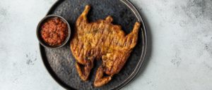 Ингредиенты (на 1-2 порции): цыпленок (1 шт.), домашний шашлычный соус (50 г), масло растительное (350 г), масло топленое (2 г), чеснок свежий (1 г), паприка (1 г), куркума (1 г), соль (3 г).