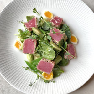 Шеф-повар Евгений Михайлов и шеф-кондитер Марина Николаева наполнили его свежестью и яркими красками благодаря весенним овощам и фруктам. Теперь добавить сочности в свой обед или ужин можно, заказав салат с мини-кальмарами, креветками, личи и папайей с йогуртовой заправкой или салат с тунцом татаки, стручковой фасолью, авокадо и сладким горошком, а также выбрав в качестве закуски спаржу — на выбор с гребешком гриль и сливочным сабайоном или с сыром грюйер и яичным кремом.