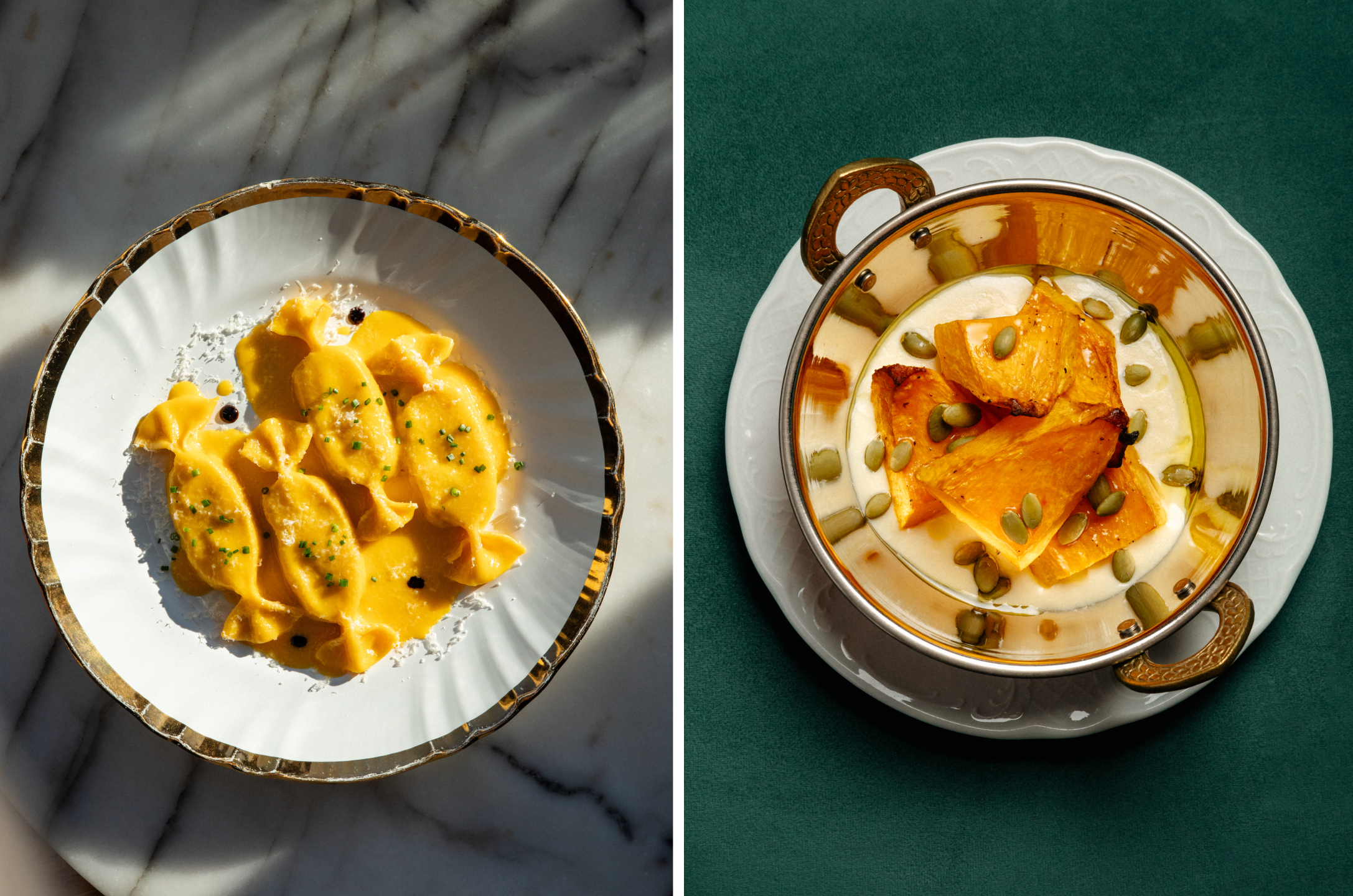 Самое долгожданное возвращение сезона — закрытые пасты: облетевшие практически полмира карамелле (1190 руб.) (Maritozzo в Москве, Probka в Москве и Петербурге, Mina в Петербурге) и равиоли с тыквой (R14) (790 рублей). Также в программе: печеная тыква с фондю из таледжио (850 руб.) в Da Manu, тыквенные манты в «Рыбе на Даче» (750 руб.), нежный тыквенный маффин с фермерской сметаной и конфитюром с шафраном в Mina на Крестовском (350 руб.), который настолько понравился гостям, что его решили оставить его в постоянном утреннем меню.