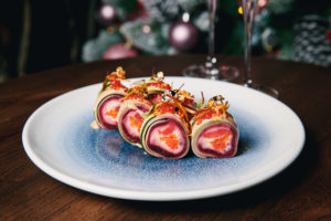 На макису выложить нарезанный слайсами в длину огурец толщиной 1-1,5 мм. Сверху выложить свеклу слайсами 1-1,5 мм и натертый картофель, замешанный с майонезом. В середину добавить нарезанную бруском отварную морковь и тунец. Завернуть в плотный ролл и нарезать на 8 равных частей. Декорировать майонезом, смешанным с унаги, красной икрой, пищевым золотом, сегментом укропа. Посыпать сублимированным желтком.