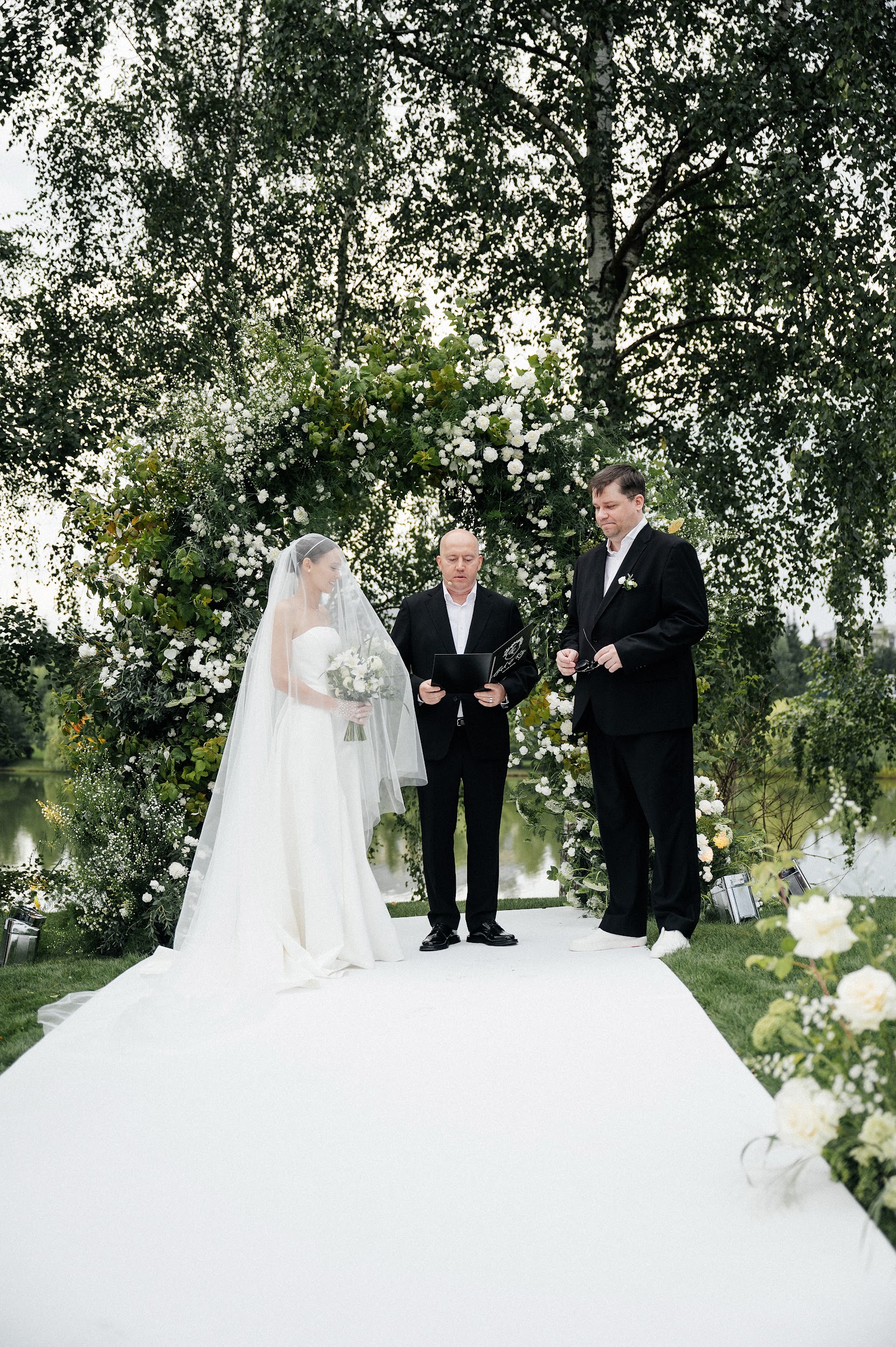 Церемония. Когда выходил Гарик, он только появился, а гостям уже смешно. Потом совершенно другая волна эмоций — трогательная. Невесту вел папа, нежно передал ее в руки Гарика — юмор куда-то делся, у гостей на глазах слезы. Женственная Катя, папа ее красиво вывел, красивая зоны церемонии среди берез — очень атмосферно. Церемонию вел Сергей Бурунов. «Дорогие молодожены Игорь и Екатерина, сегодня знаменательный день. Два одиноких парусника, бессмысленно блуждающих в огромном океане жизни, прибило к берегу любви и надежды», — зачитал он с листа в папке. Гости не могли устоять, снова смех!