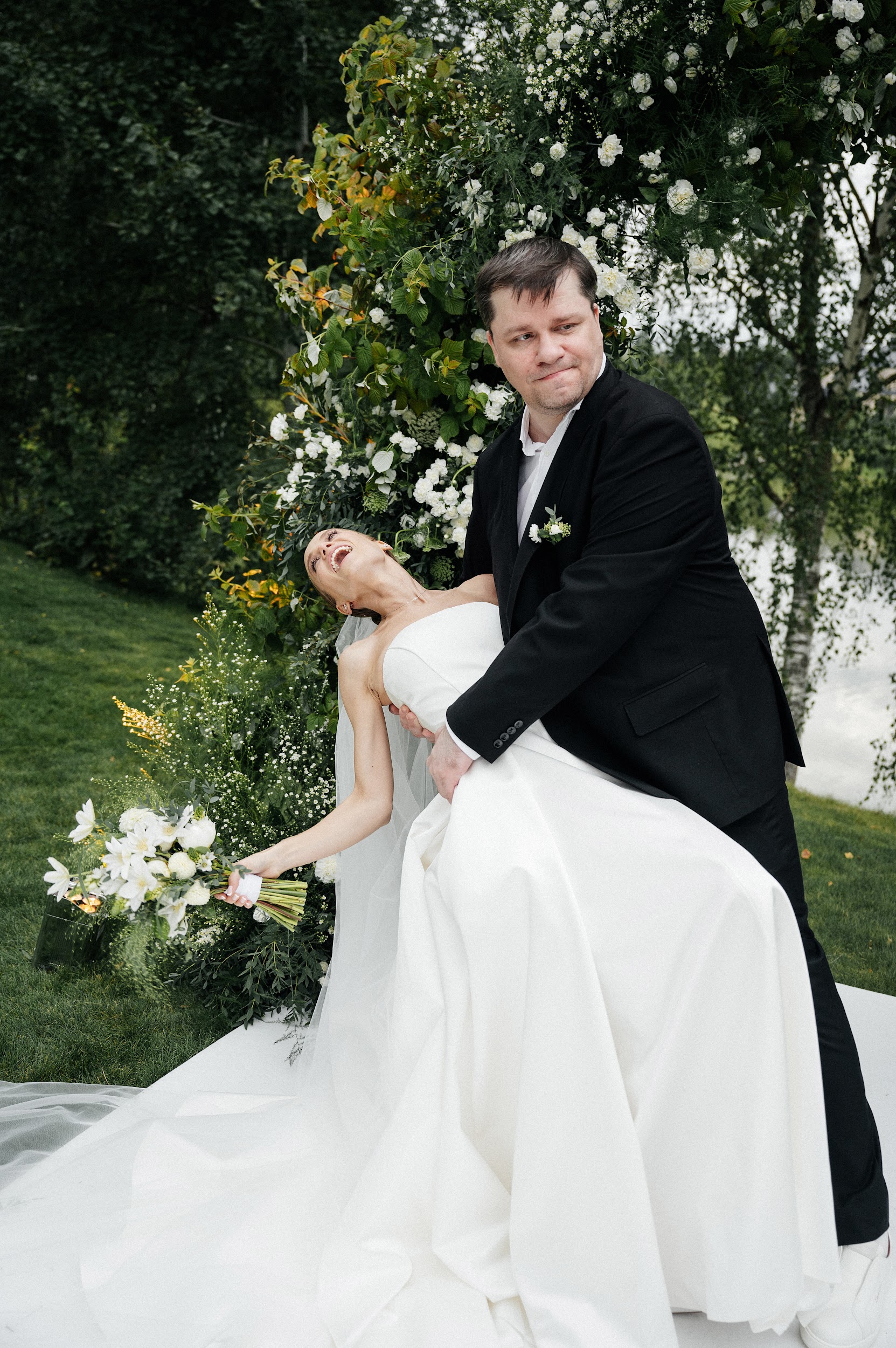 Гарик не любит фотографироваться, и это его не первая свадьбы, поэтому сборы жениха я не фотографировал. У нас был короткий отрезок после церемонии, когда удалось снять пару — с ноткой юмора, конечно. Гарик предложил прилечь на лежаки — это немного выходит за рамки того, что я люблю снимать. Но представить Гарика Харламова в серьезных fashion-позах — это нестыкуемая картинка. А здесь было все уместно — пара смеялась, обнималась. Прогулка заняла 15 минут, и фотосессия прошла в ненавязчивом формате.