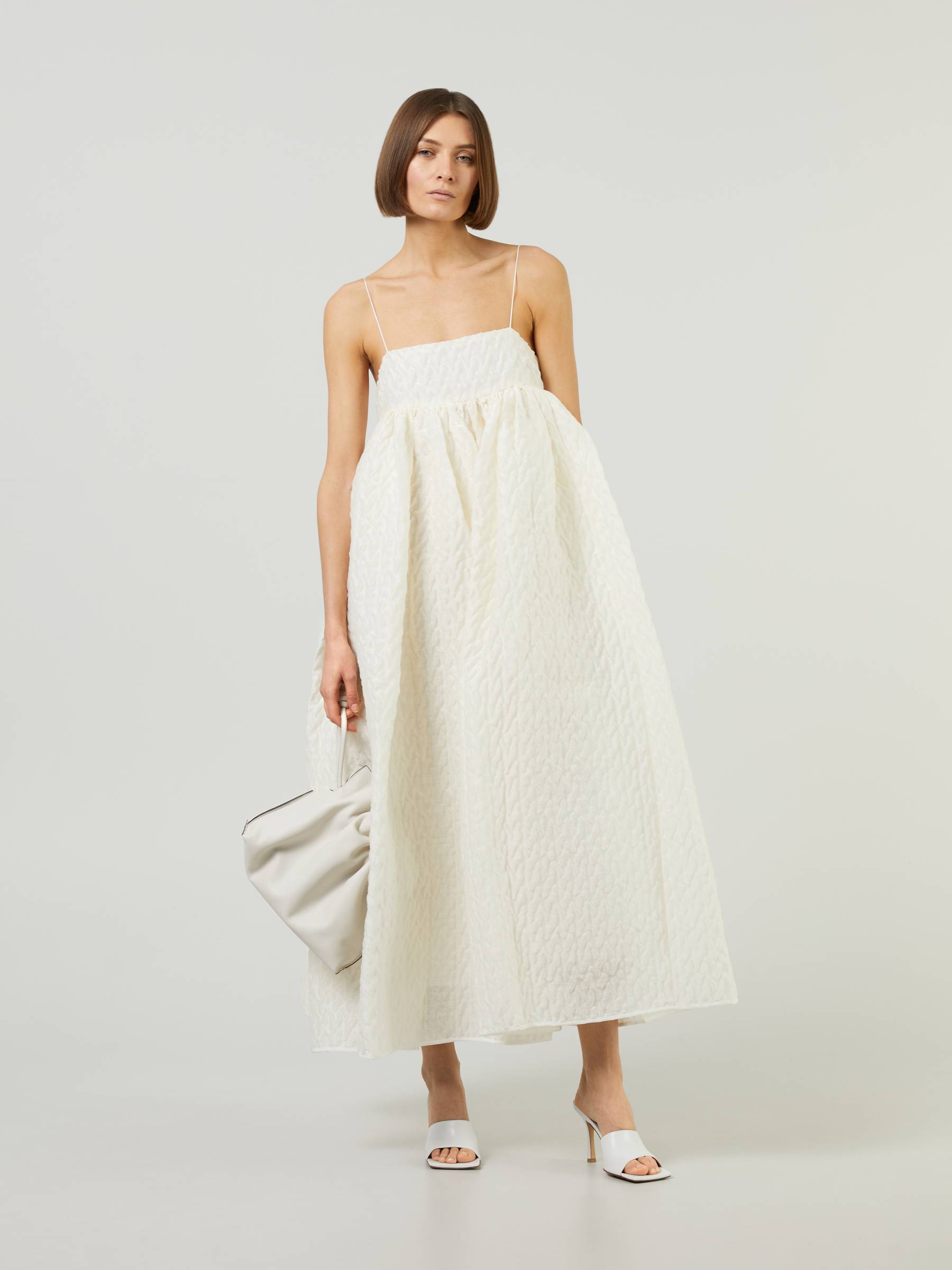 Минималистичное платье Beth из коллекции бренда подойдет для летней свадьбы. Очаровательный наряд отличают тонкие бретели, пышная юбка и плотный материал с перфорацией. Идеальный выбор для молодой невесты. Стоимость платья составит примерно 140 000 рублей.