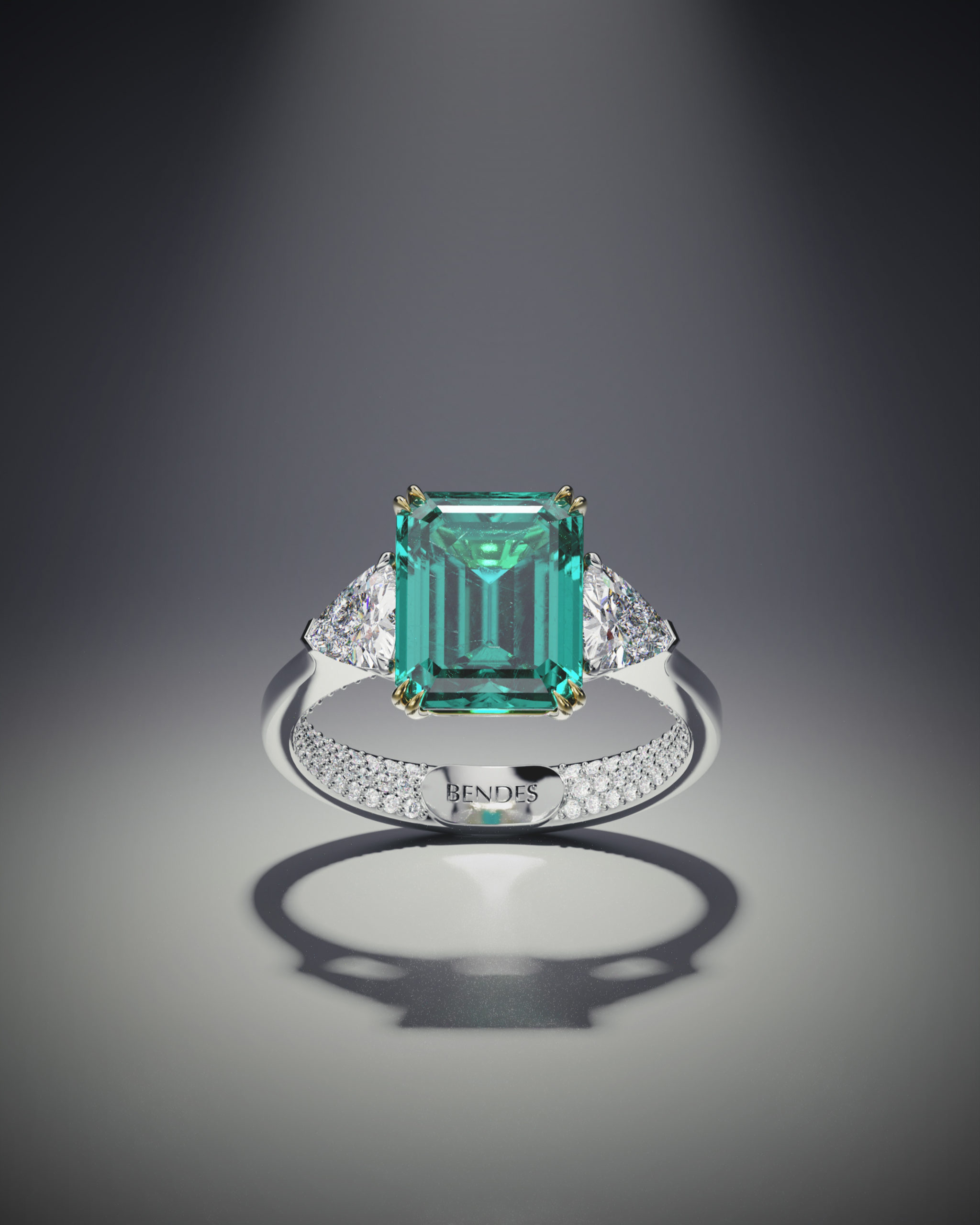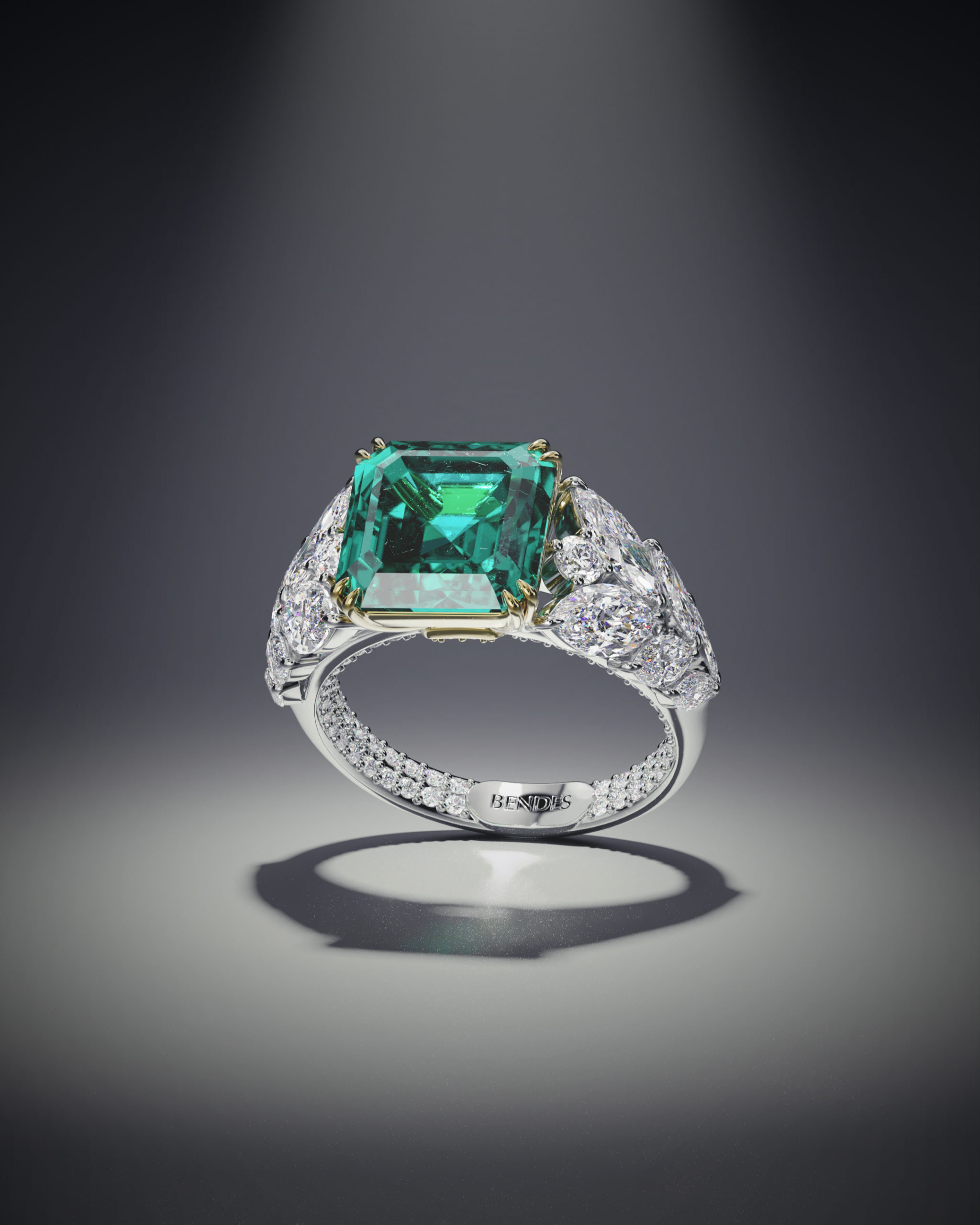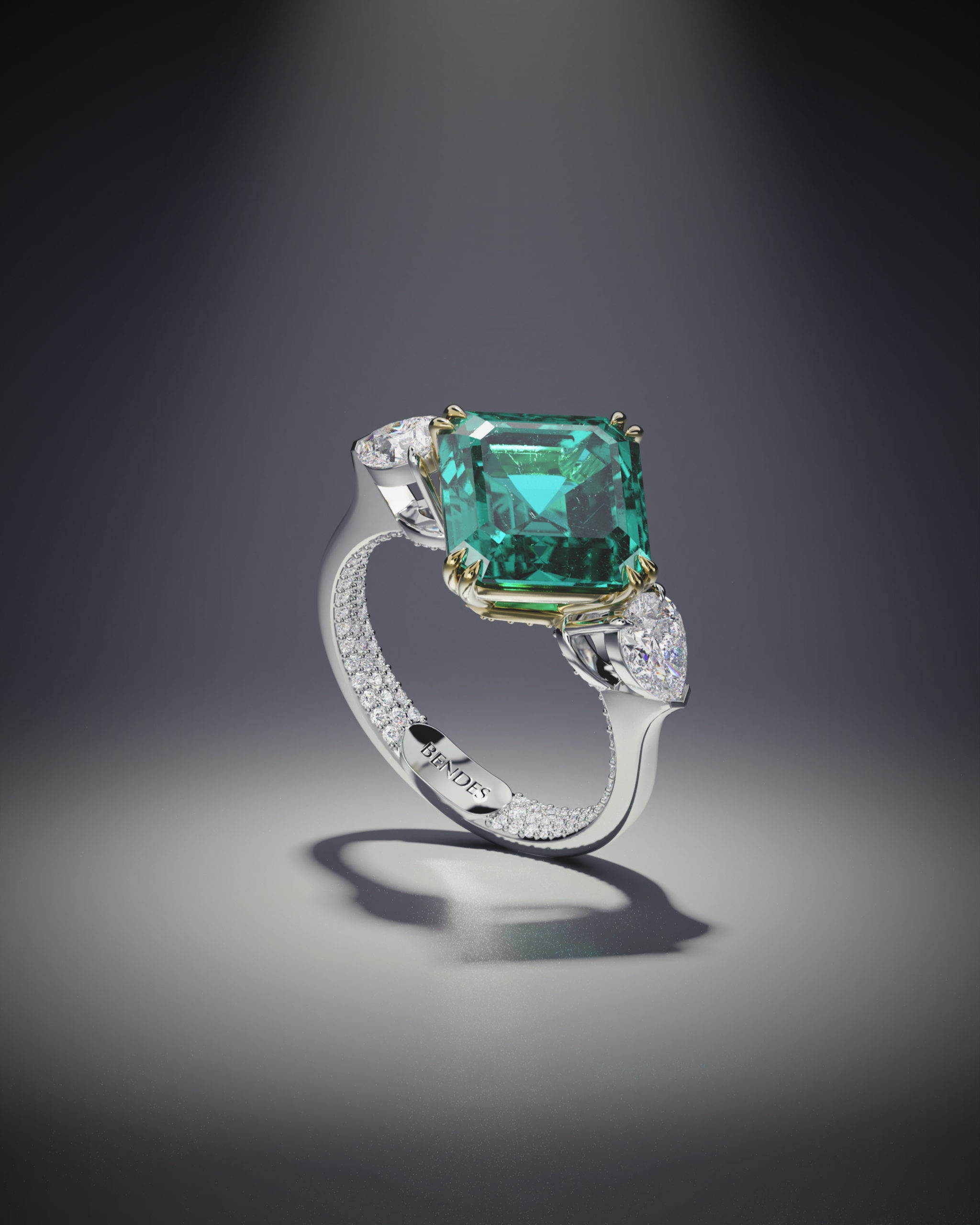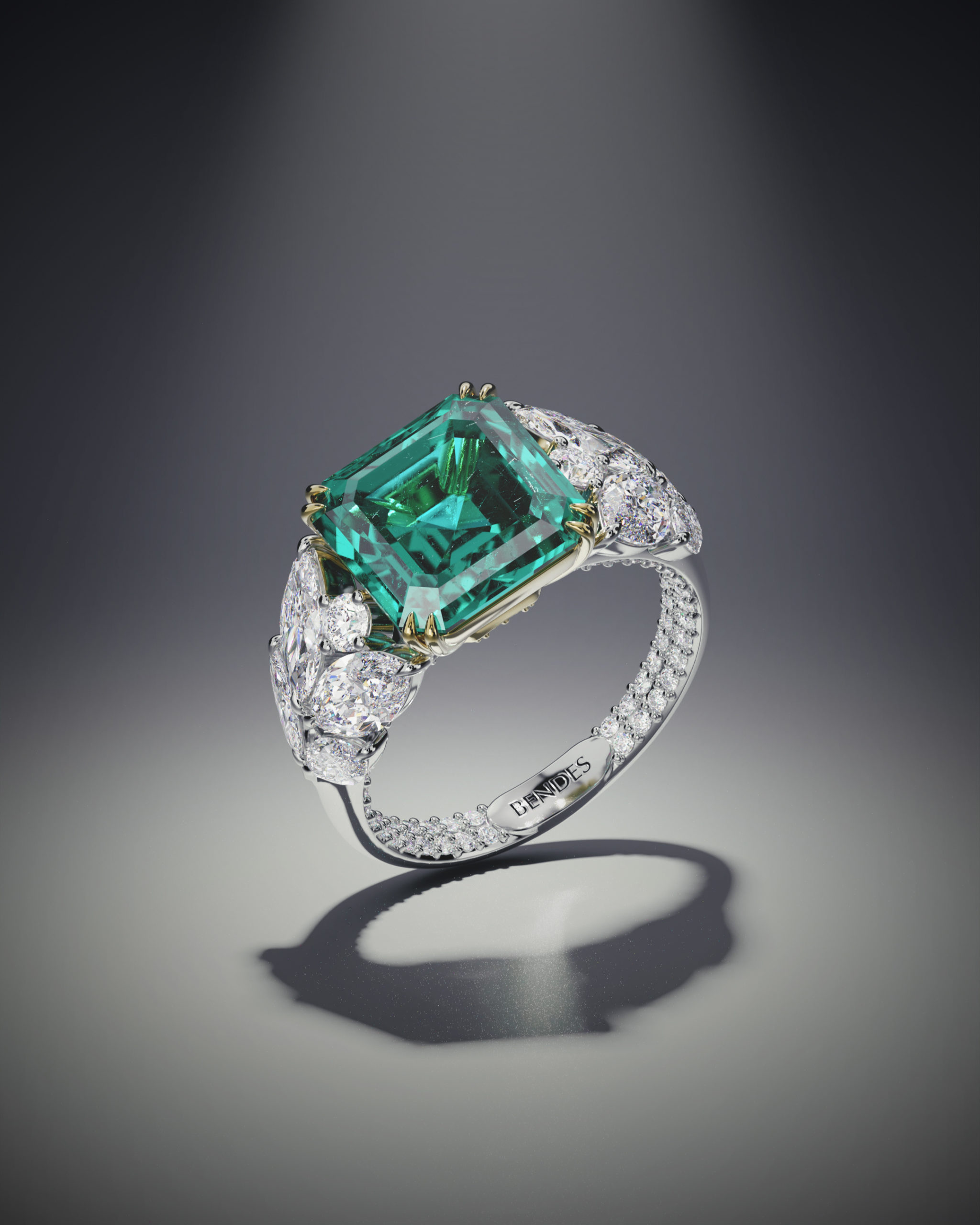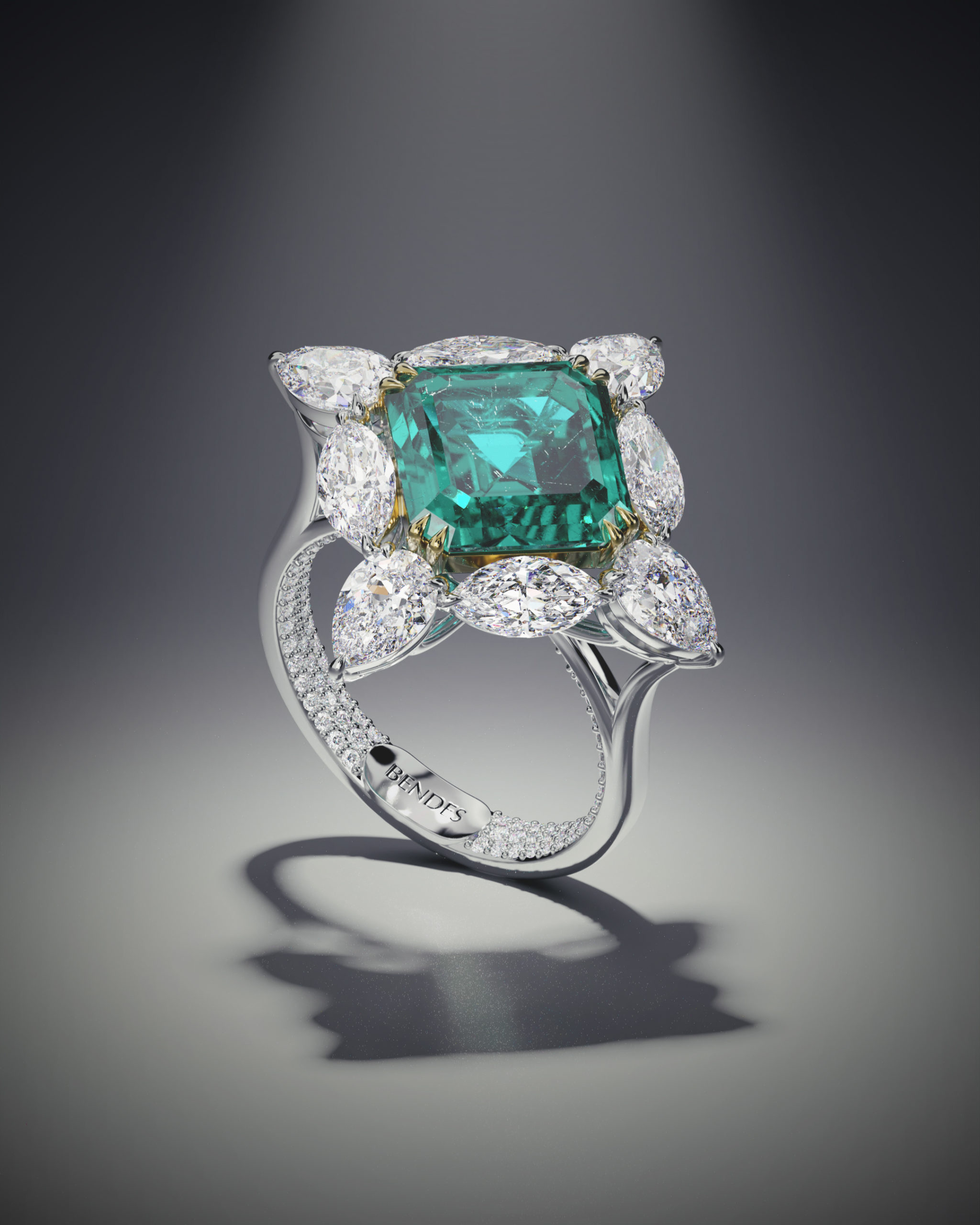Коллекция BENDES Emerald стала воплощением представления ювелиров бренда о гармонии изумрудов и бриллиантов. Украшения позволяют почувствовать мощную энергию синергии этих драгоценных камней. Изумруд – уникальный минерал, он поражает своей глубиной и холодным свечением. Издавна его наделяли почти магическими свойствами. К тому же изумруд считается «семейным» камнем, символизирует крепкий брак и является хранителем гармоничных отношений в паре. Крупный центральный камень дополняют композиции из более мелких бриллиантов фантазийной огранки – «груша», «маркиз», «триллион». А внутренняя сторона колец Emerald скрывает секрет – сияющее бриллиантовое паве, создающее эмоциональную связь между его обладательницей и драгоценными камнями. Прежде чем стать частью коллекции Emerald, каждое украшение проходит путь от сотни эскизов и десятков часов поиска наиболее изящных форм до готового творения ювелиров, от которого невозможно оторвать взгляд.