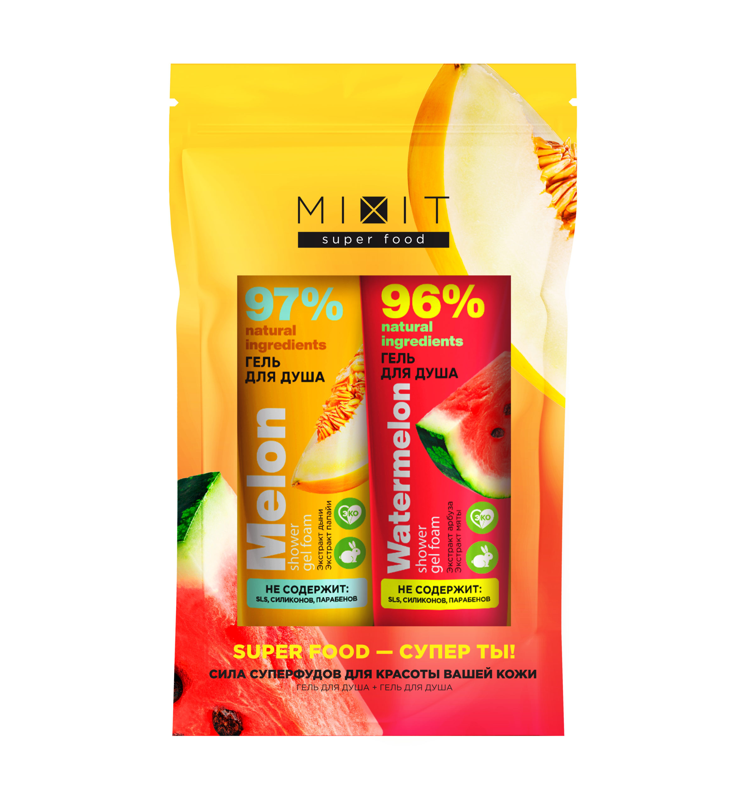 Cочный набор суперфудов порадует вашу кожу! В специальном наборе сразу 2 геля для душа – сладкая дыня и освежающий арбуз. Средства обогащены экстрактами фруктов и наполнят ванную комнату яркими ароматами.