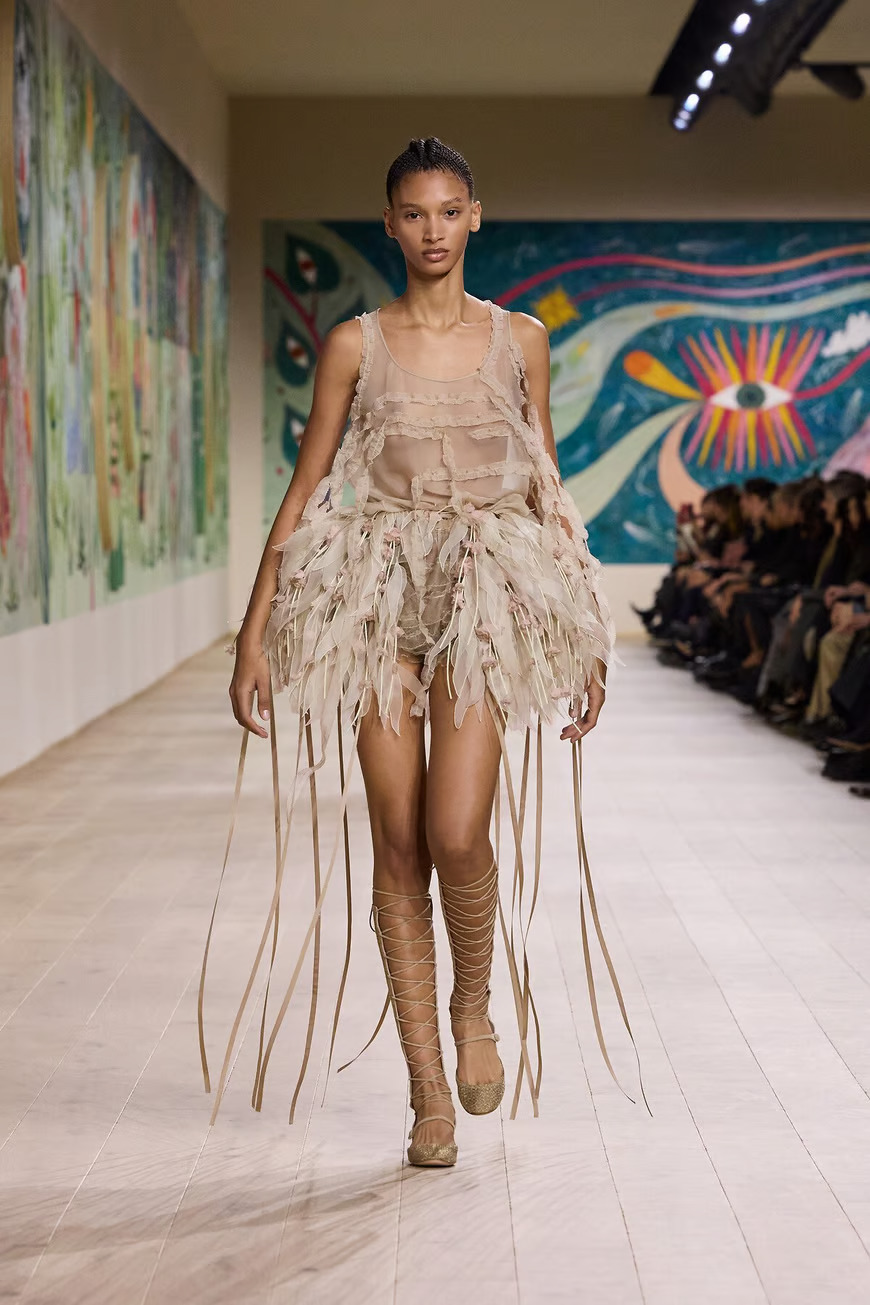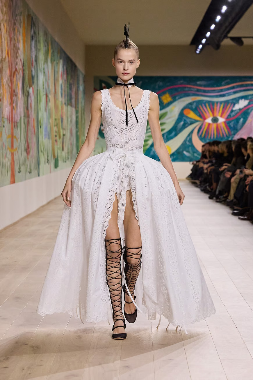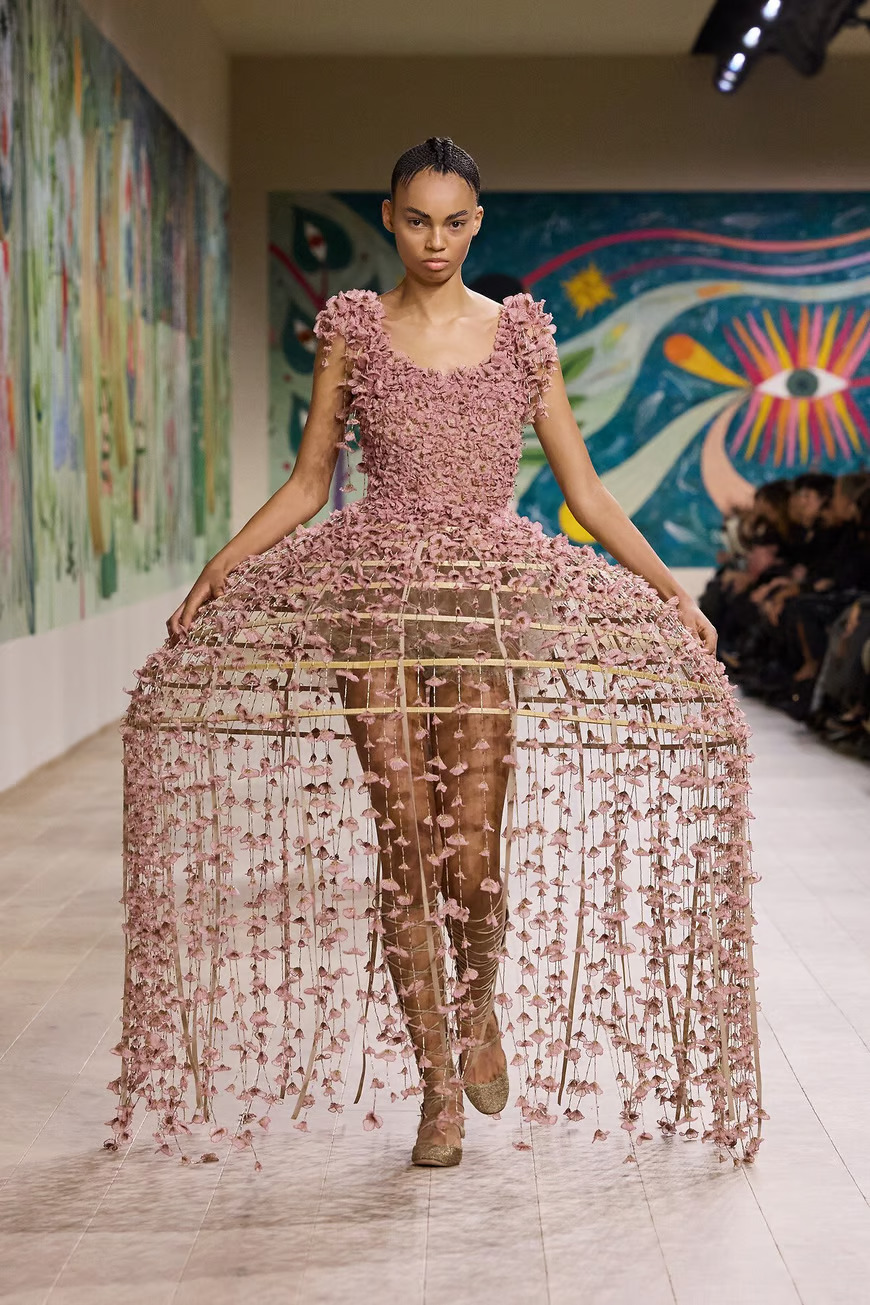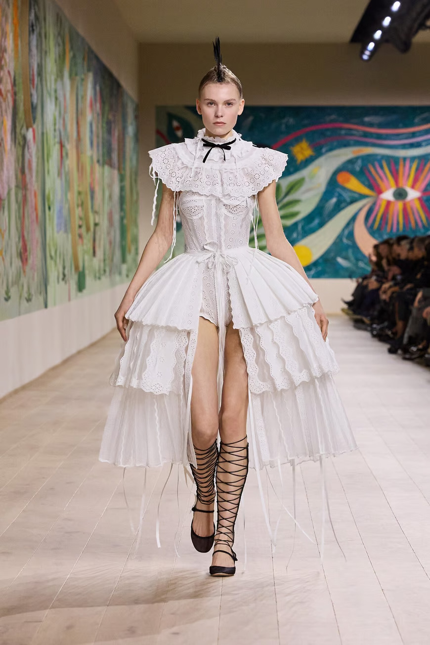 Креативный директор Dior Мария Грация Кьюри представила в Париже коллекцию Dior Haute Couture весна-лето 2025 в Париже. Центральной темой шоу стала страна чудес. Модели дефилировали по подиуму в головных уборах с ирокезами и в сандалиях-гладиаторах, одетые в сказочные платья из перьев, органзы, кружева.