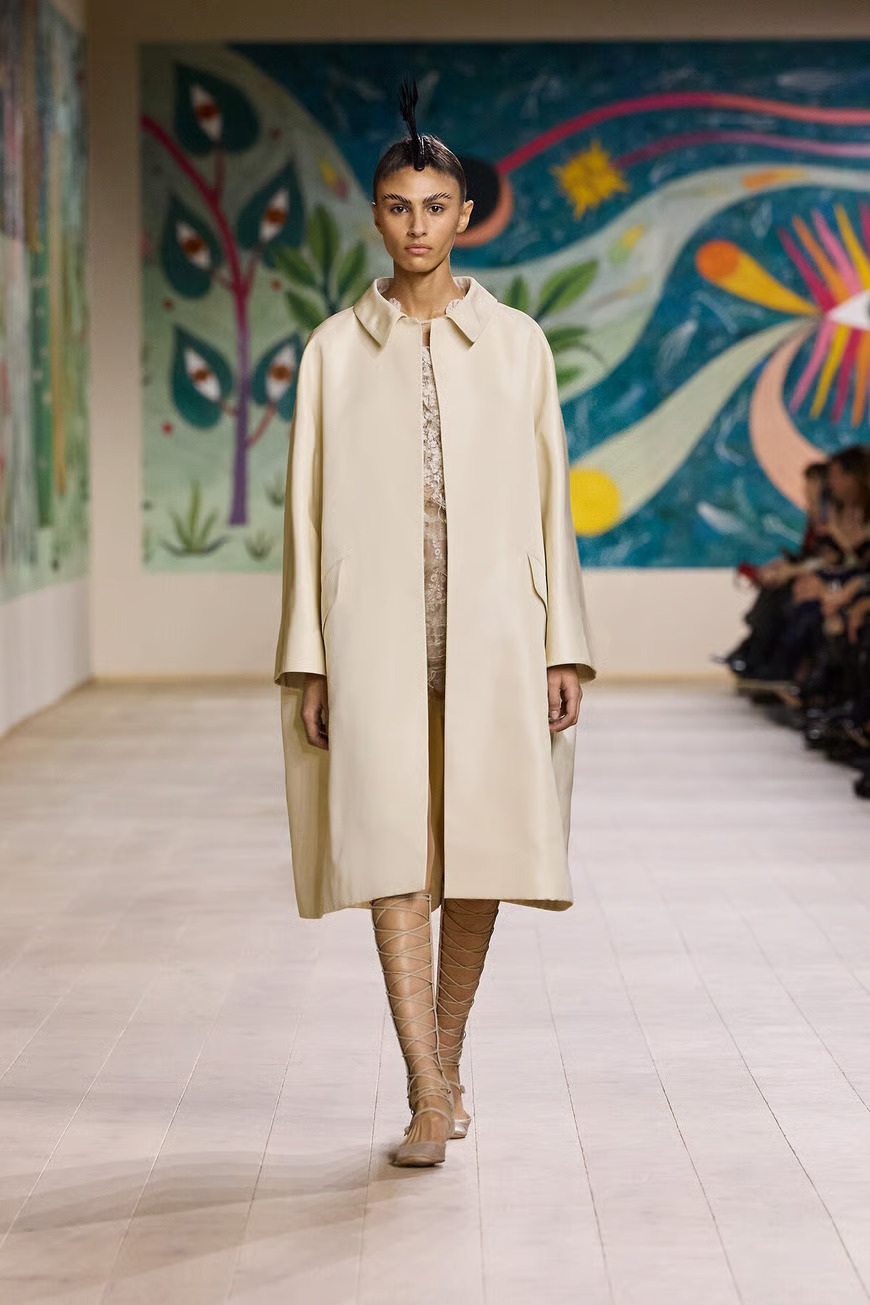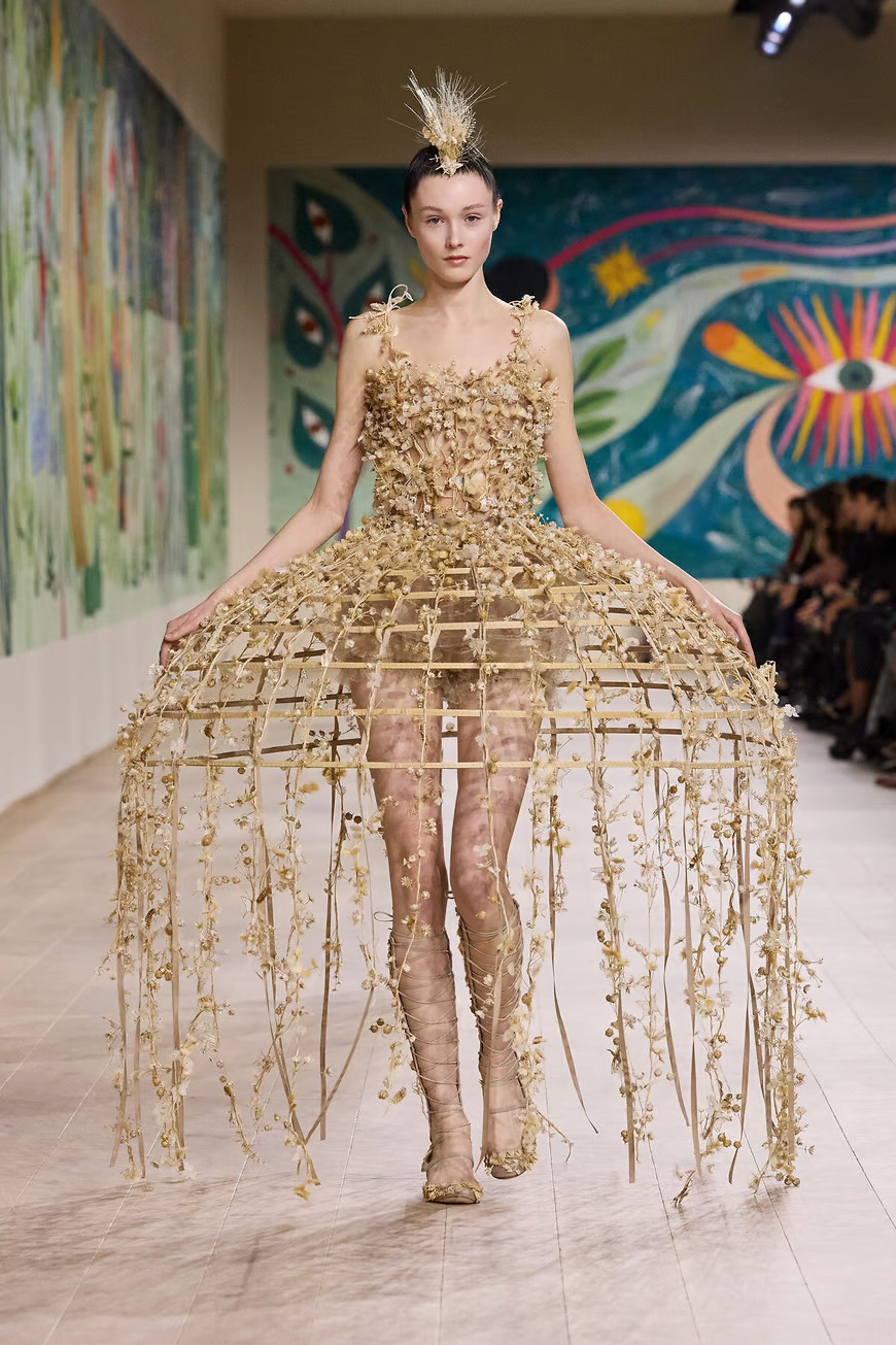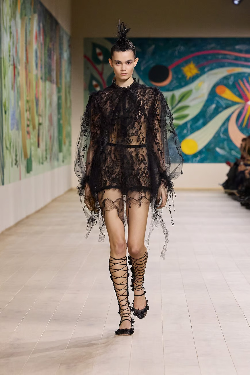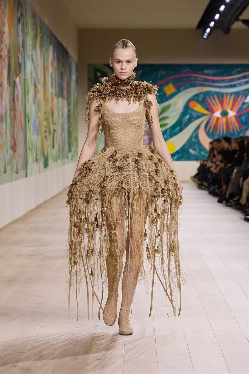 Креативный директор Dior Мария Грация Кьюри представила в Париже коллекцию Dior Haute Couture весна-лето 2025 в Париже. Центральной темой шоу стала страна чудес. Модели дефилировали по подиуму в головных уборах с ирокезами и в сандалиях-гладиаторах, одетые в сказочные платья из перьев, органзы, кружева.