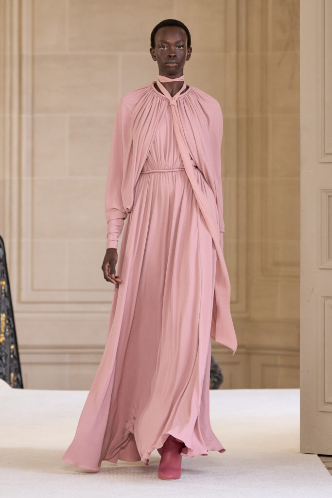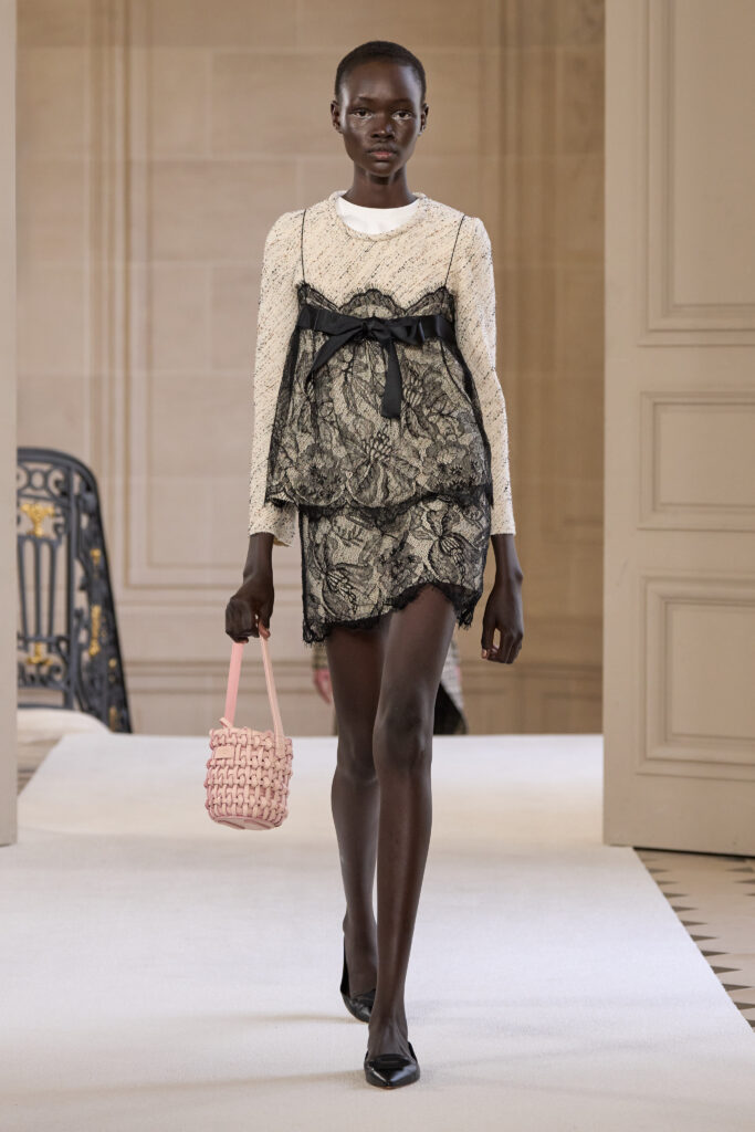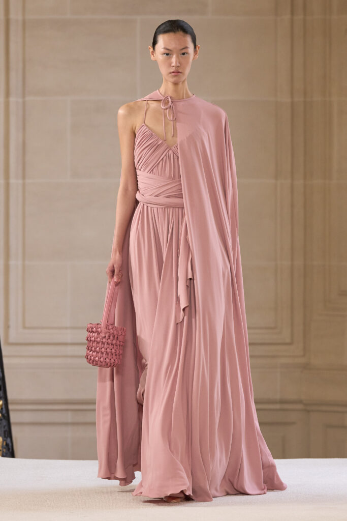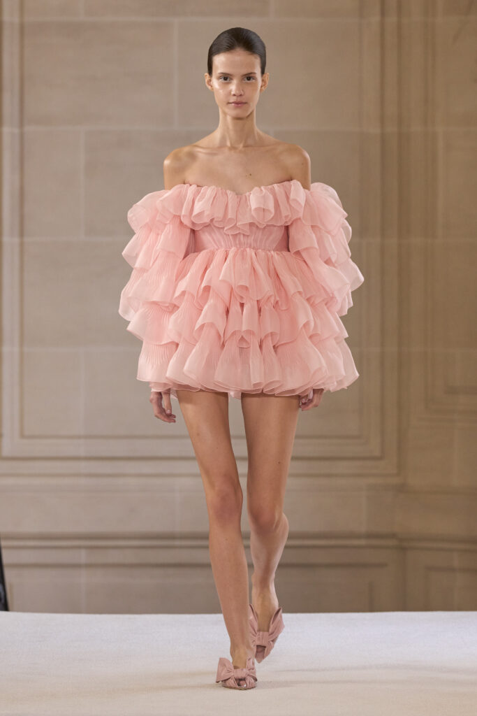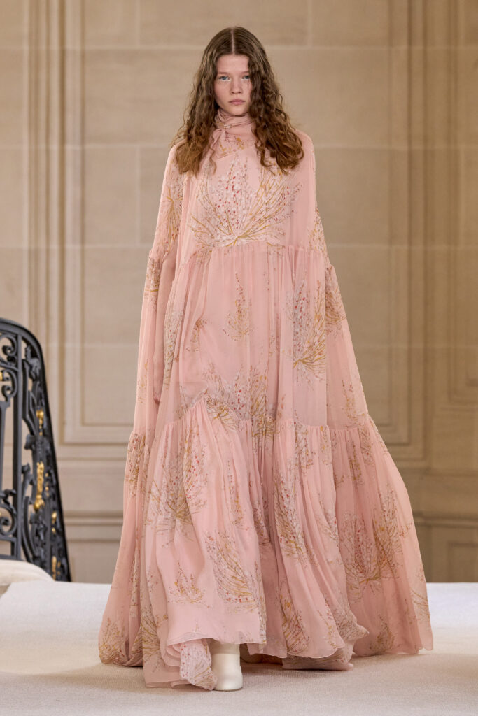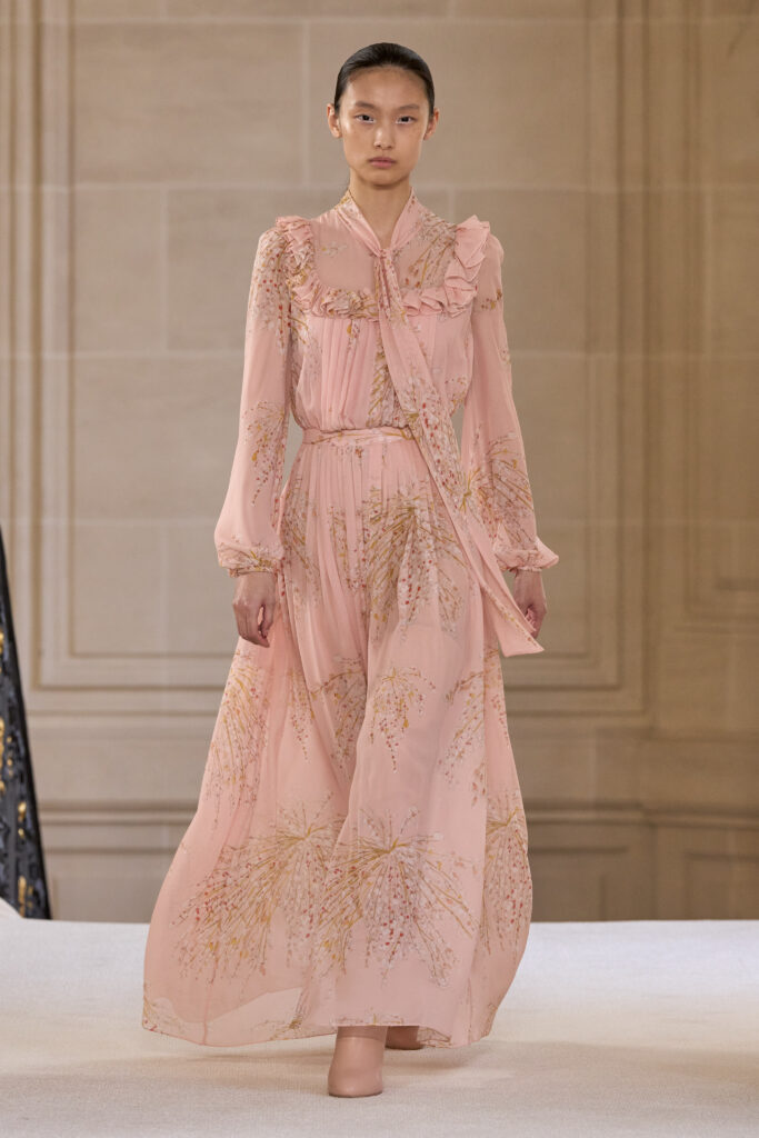 Дизайнеру удалось уйти от театральных, нарочито праздничных аутфитов и вернуться к утонченной и нежной эстетике. Любопытно, что в коллекции помимо платьев представлены и вполне базовые наряды — трикотажные костюмы, комплекты в офисном стиле, пальто и стильные мини-платья. Конечно, не обошлось без роскошных сказочных платьев с обилием драпировок и фатина. Смотрим все 40 образов с показа Giambattista Valli!
