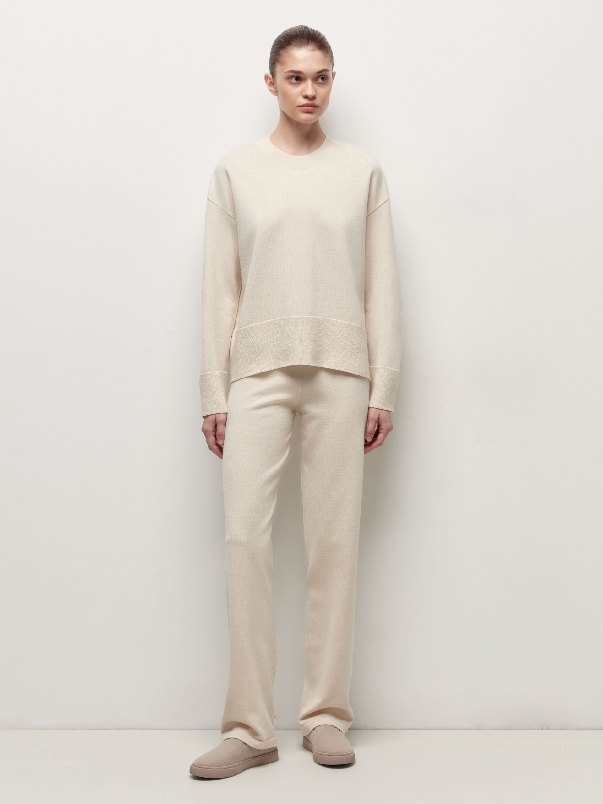 Костюм из теплого мягкого трикотажа — беспроигрышный вариант для выходных на природе. Свободный крой не стесняет движений, а натуральные ткани не дадут замерзнуть. Для периода праздников выбирайте светлую палитру — экрю, бежевый, слоновую кость; такие цвета выглядят особенно роскошно. Дополнить базовый комплект можно пуховиков, уггами на платформе и вязаными аксессуарами.