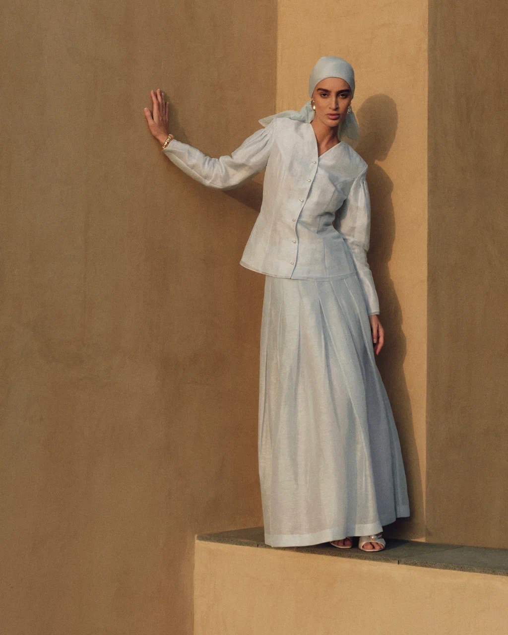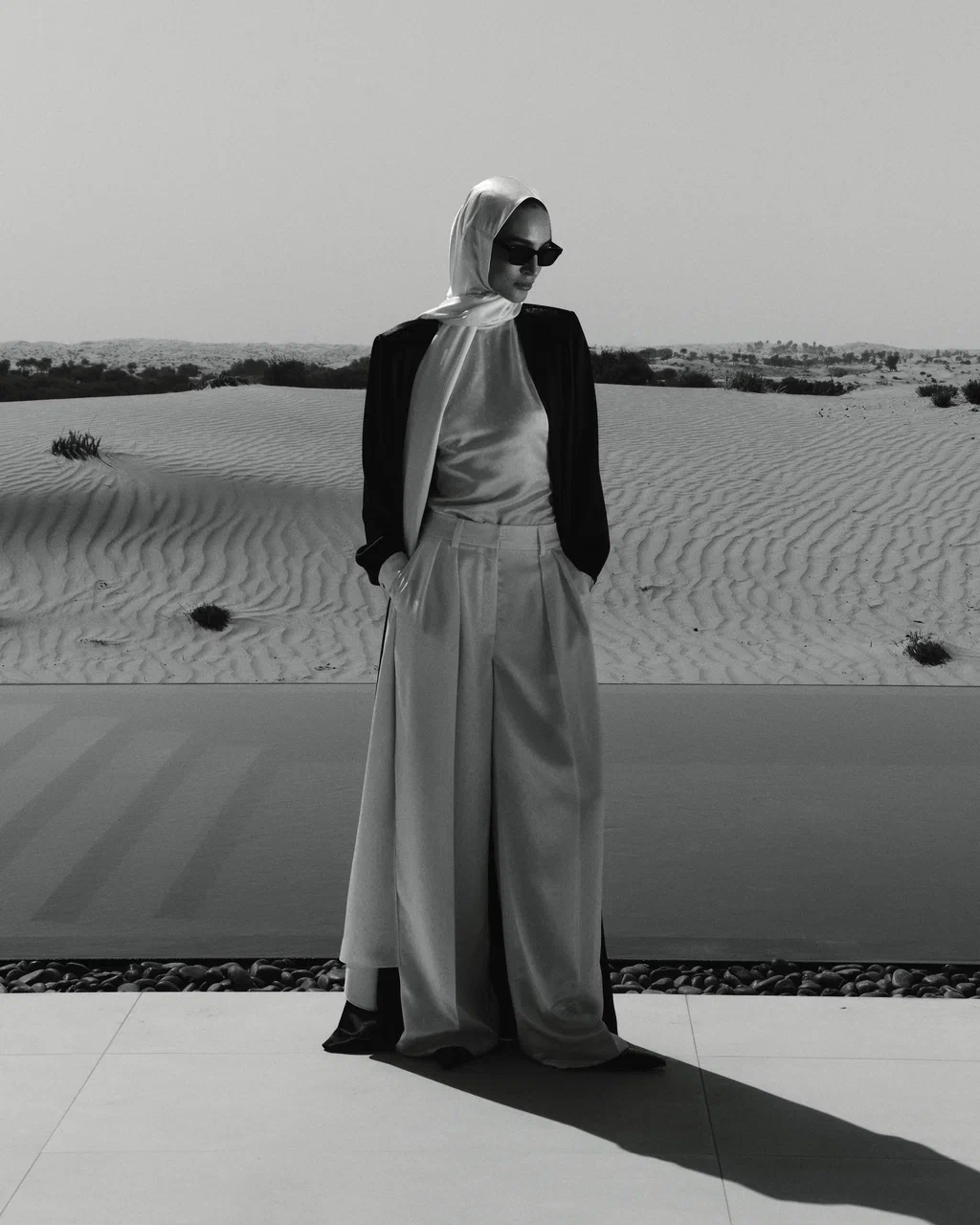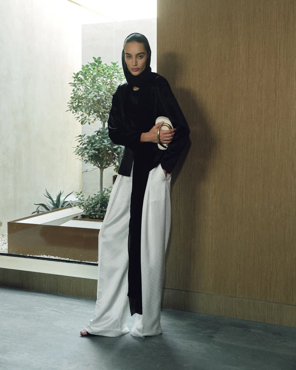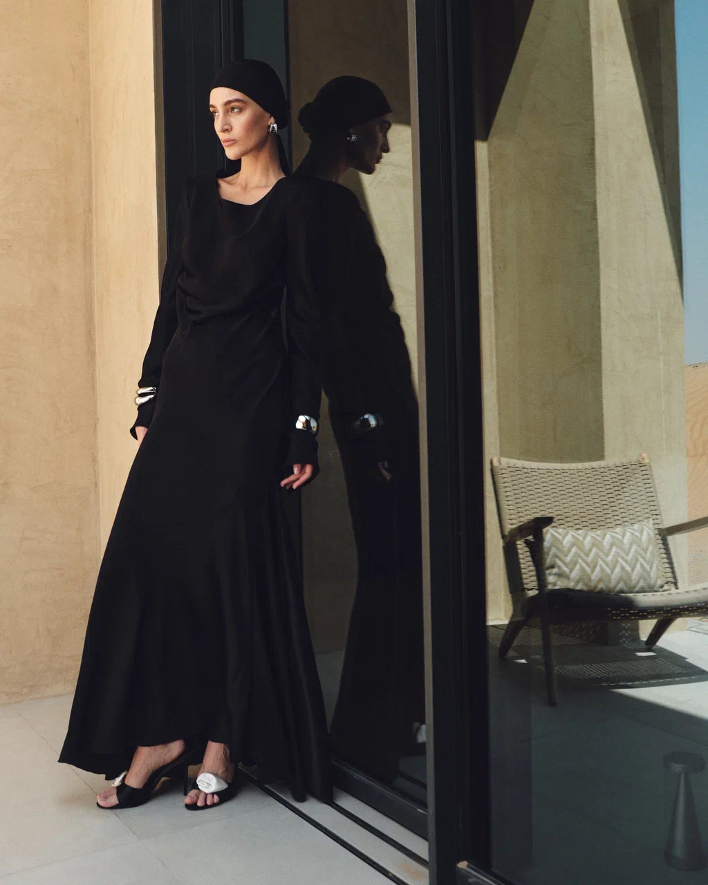 Отдельная часть коллекции посвящена вечерним образам. В этом сезоне команда бренда хотела подчеркнуть торжественность момента, поэтому в коллекции много длинных силуэтов и легких шлейфов, которые будто растворяются в воздухе при движении. Например, платье Нур — лаконичное и струящееся, с фигурными подрезами и летящей юбкой по косой. Или жакет Аль Камар, в линии которого угадывается форма полумесяца, дополненная контрастным двойным подбортом.