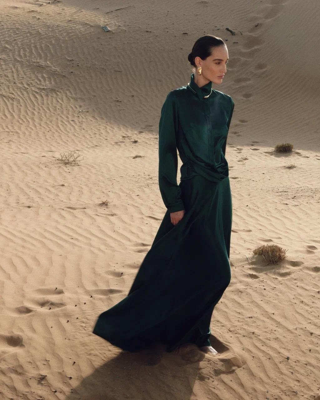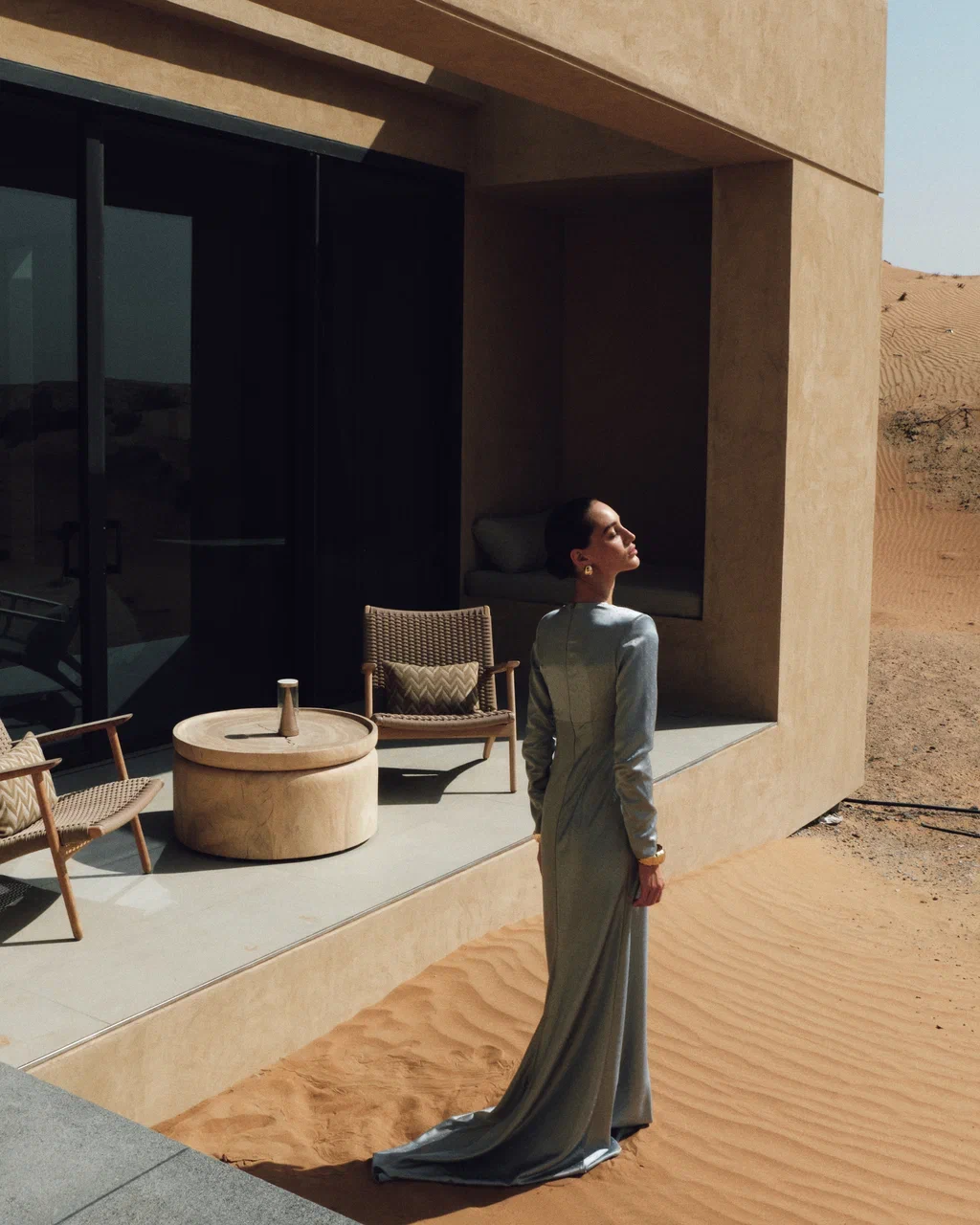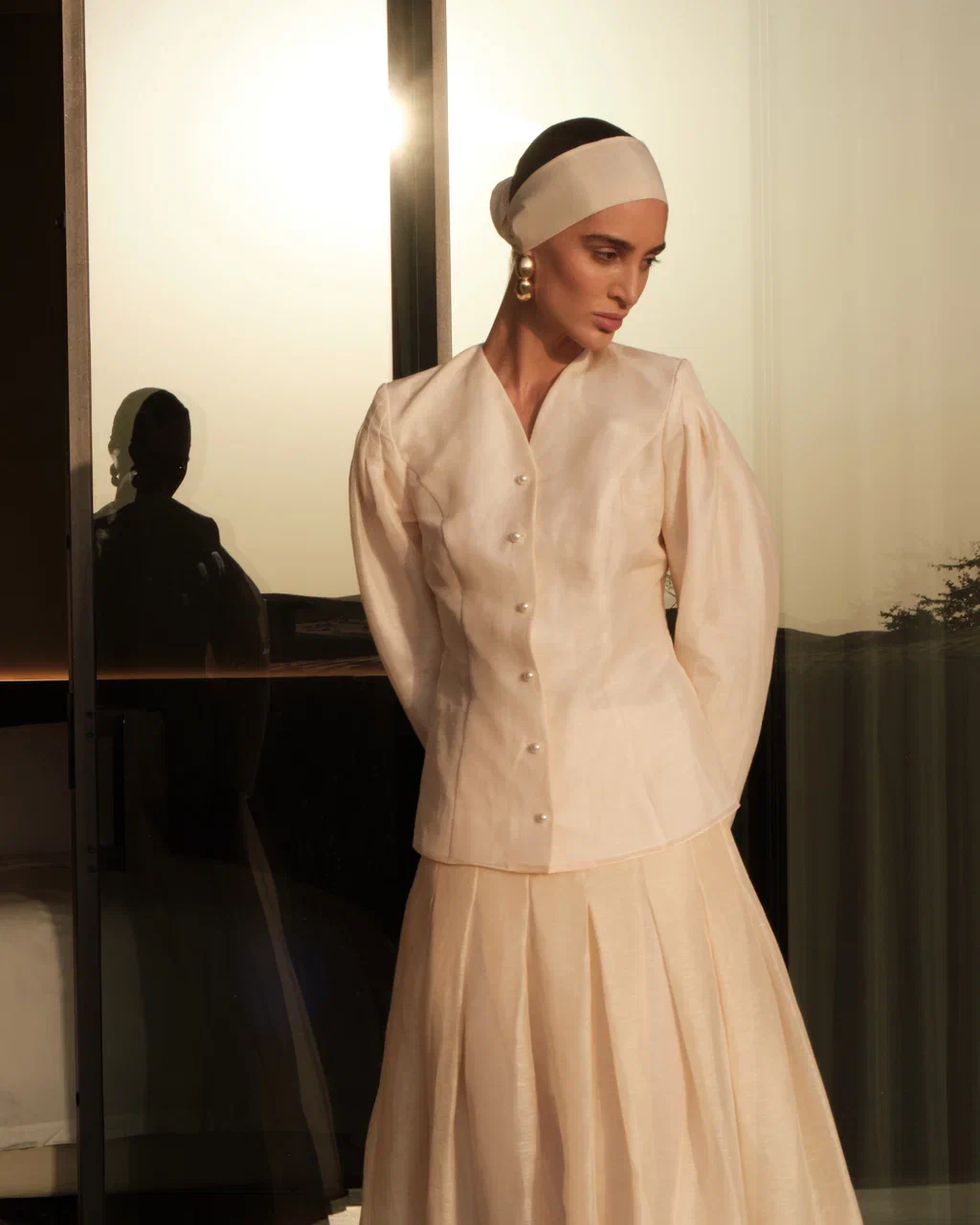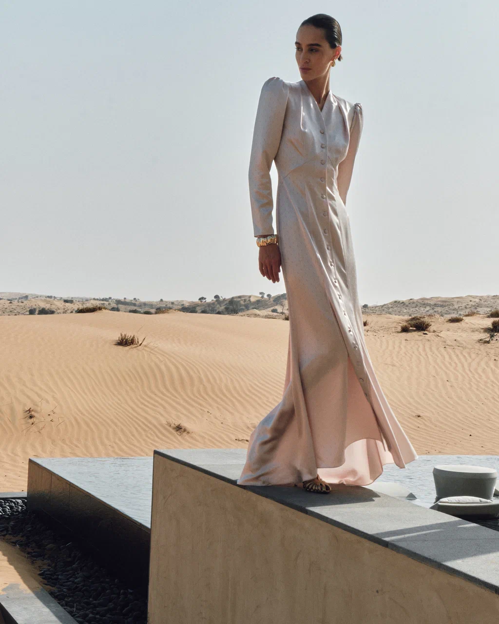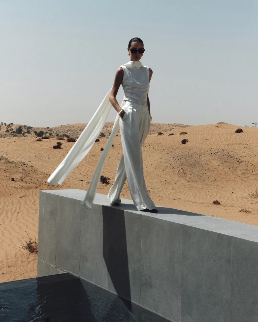 Отдельная часть коллекции посвящена вечерним образам. В этом сезоне команда бренда хотела подчеркнуть торжественность момента, поэтому в коллекции много длинных силуэтов и легких шлейфов, которые будто растворяются в воздухе при движении. Например, платье Нур — лаконичное и струящееся, с фигурными подрезами и летящей юбкой по косой. Или жакет Аль Камар, в линии которого угадывается форма полумесяца, дополненная контрастным двойным подбортом.