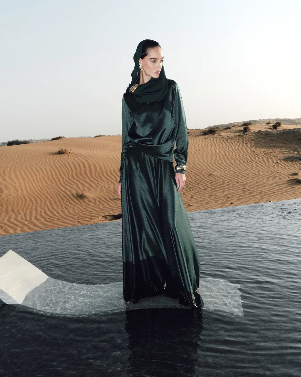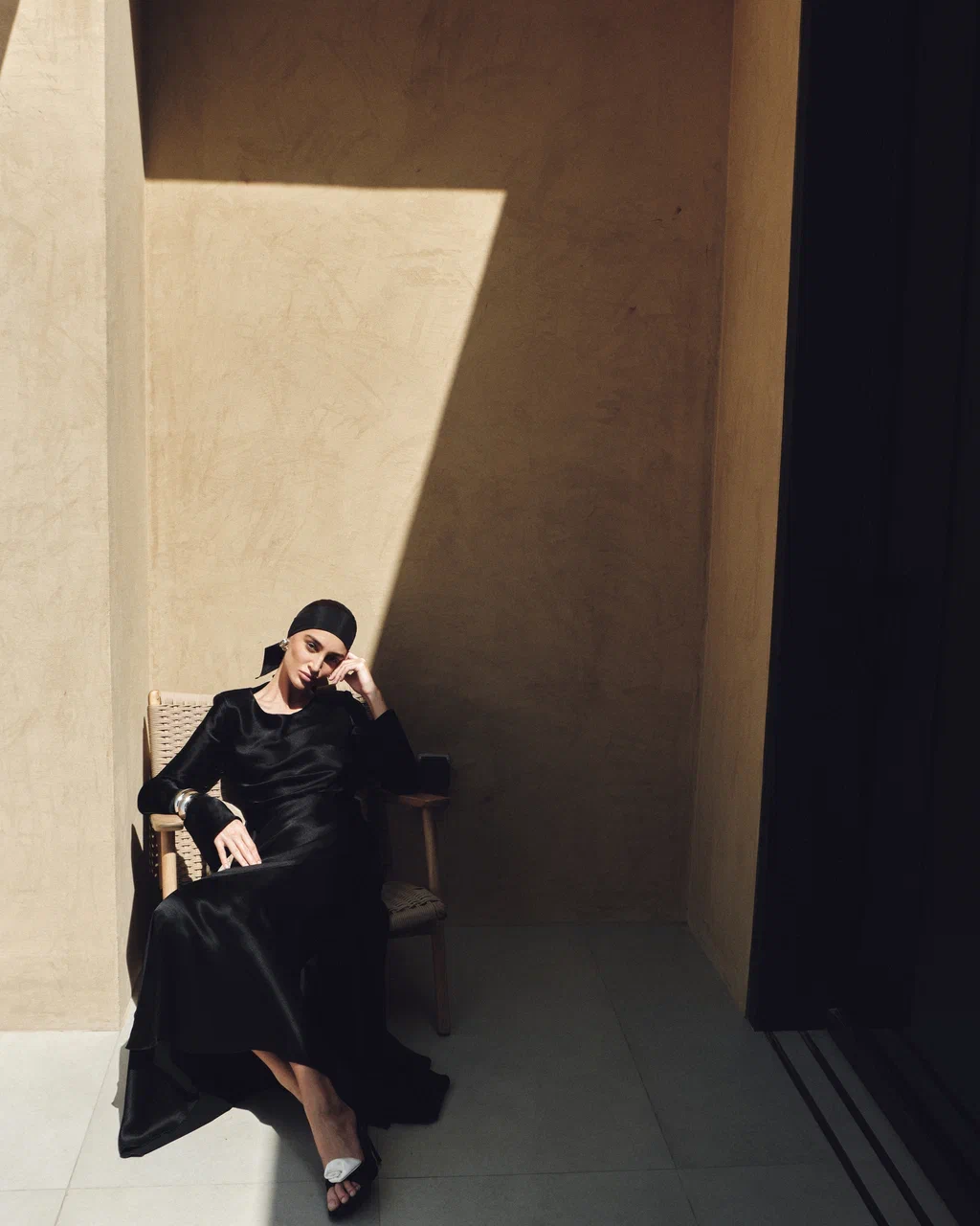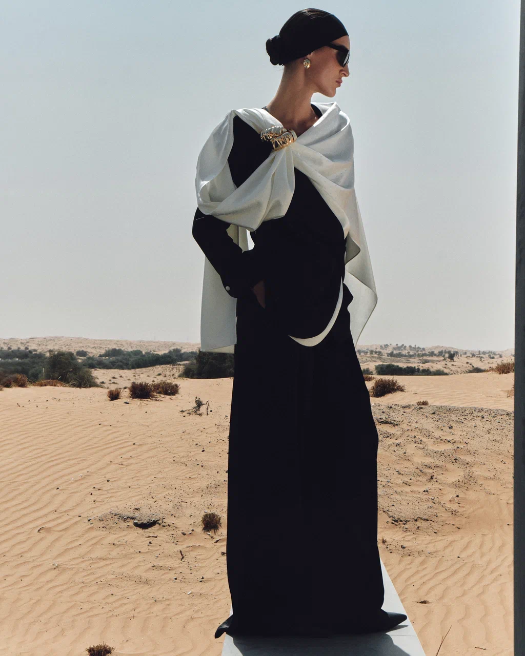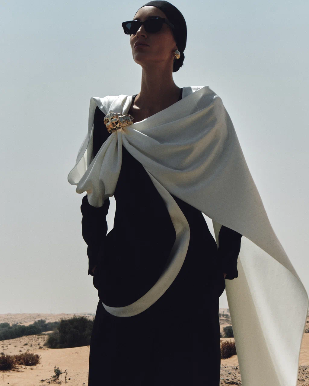 В этот раз цветочные мотивы уступили место полумесяцам, плавным драпировкам и многослойности, которые передают атмосферу Рамадана. Коллекция строится на балансе между строгими силуэтами и воздушностью материалов, создавая объемные образы. В названии каждой модели заложен особый смысл: «Saada» или «Саада» в переводе с арабского языка — «Счастье», «Noor» или «Нур» — «Cвет», «Qalb» или «Кальб» — «Cердце», «Habibti» или «Хабибти» — «Любимая», «Al Qamar» или «Аль Камар» — «Луна», «Safar» или «Сафар» — «Путешествие». Эти слова не просто звучат, они передают настроение вещей, их смысл и энергетику.