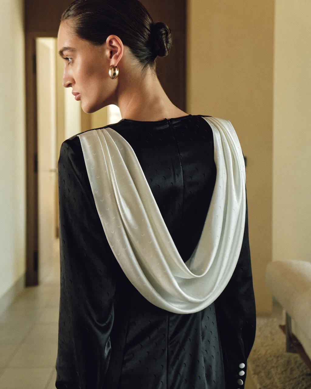Особое место в коллекции занимают модели из редких и трудоемких в изготовлении тканей. В этом сезоне ключевым мотивом стал полумесяц, воплощенный в эксклюзивном сатиновом жаккарде: его матовый узор не нанесен поверх ткани, а вплетен в саму структуру ткани, создавая игру света и тени. Этот прием задает новое звучание классическим костюмам, позволяя им выглядеть одновременно сдержанно и выразительно.