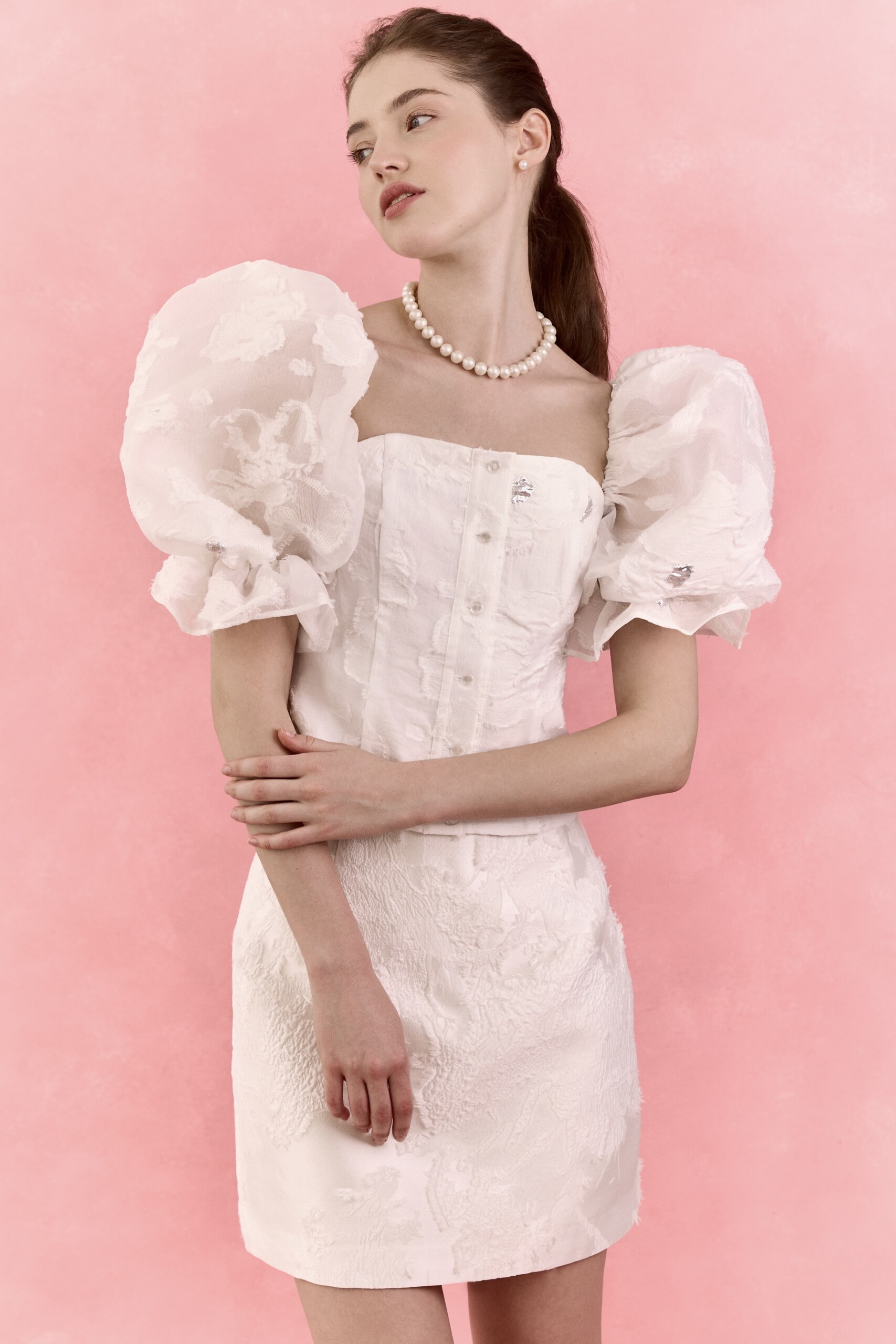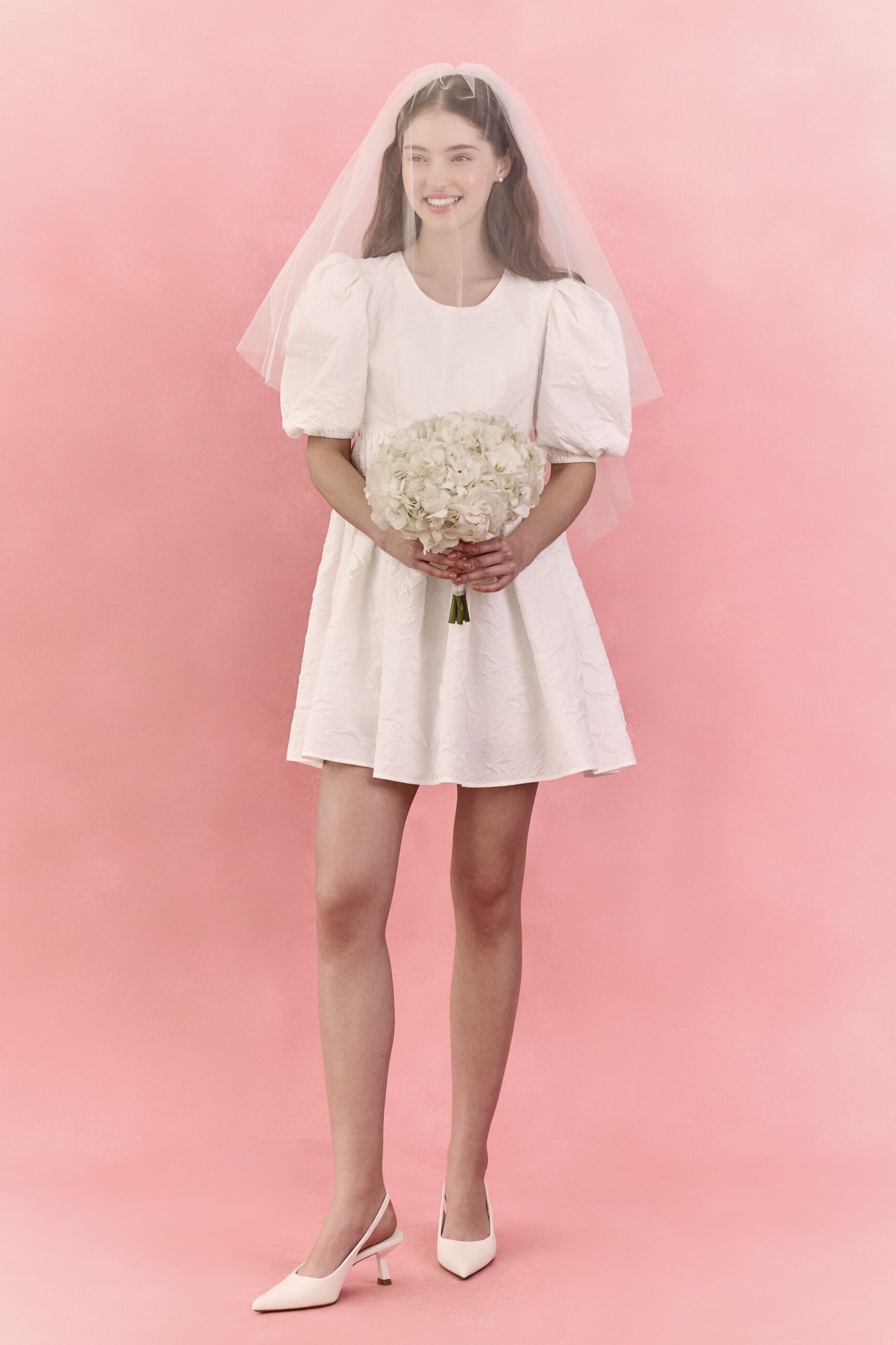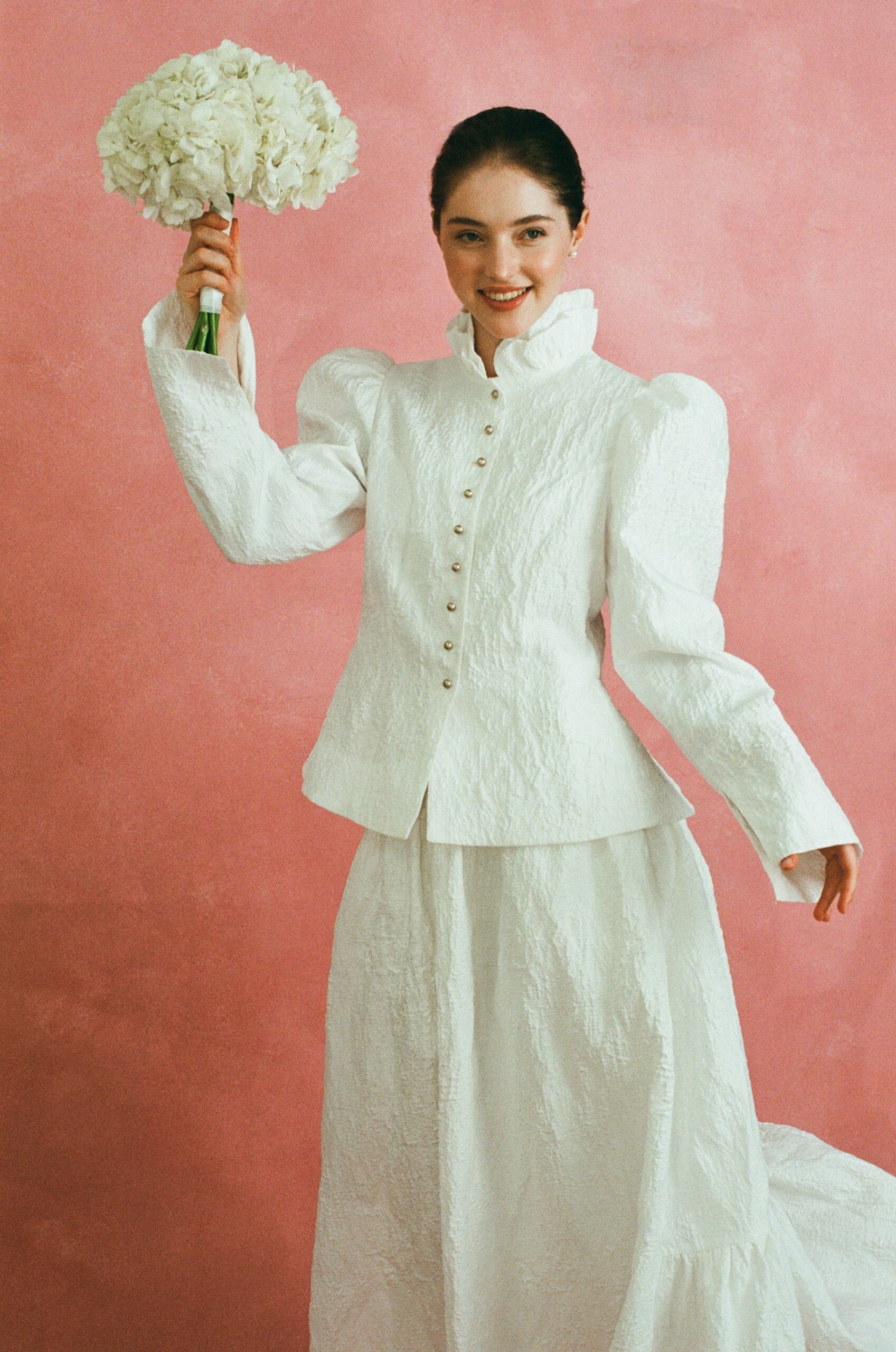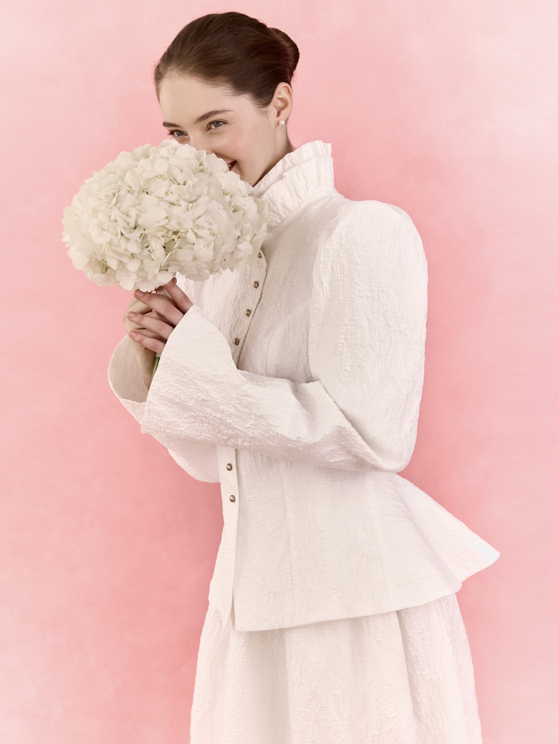 В специальной фотосессии, посвященной запуску Abitu Bridal, марка объединила несколько новых образов с бестселлерами, которые могут подойти невестам, среди них — платья Coco White, Angel White и топ Daisy. Примечательная новинка бренда — мини-платье Coco White с пышной юбкой. Также среди новых силуэтов два белых костюма: комплект White Dove из перламутрового атласного жаккарда с декором в виде «перышек» и комплект White Onyx с жакетом с высоким воротником и миди-юбкой.
