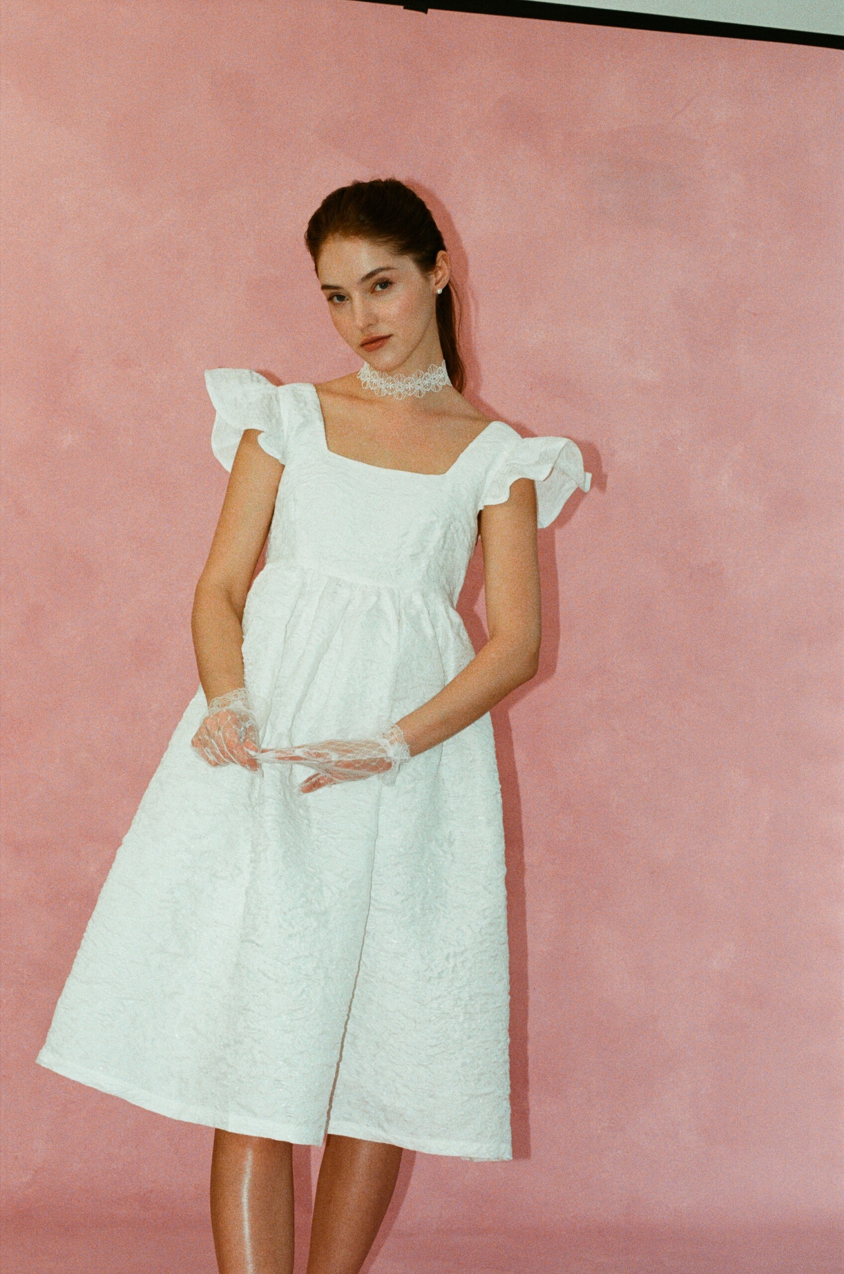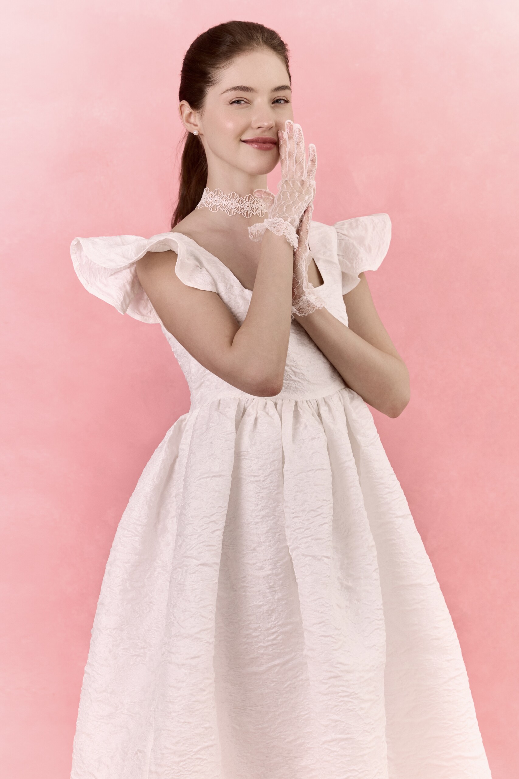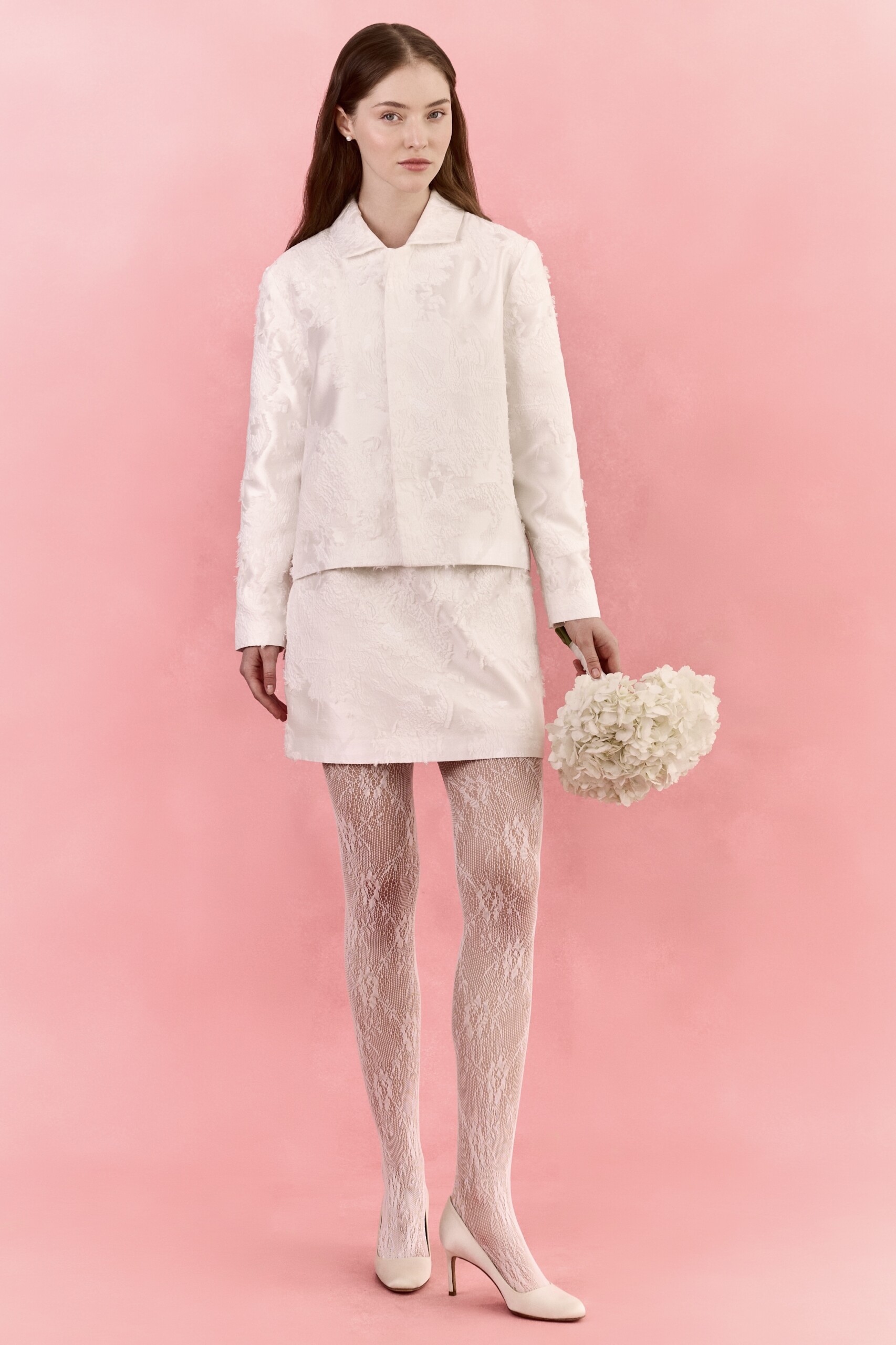 В специальной фотосессии, посвященной запуску Abitu Bridal, марка объединила несколько новых образов с бестселлерами, которые могут подойти невестам, среди них — платья Coco White, Angel White и топ Daisy. Примечательная новинка бренда — мини-платье Coco White с пышной юбкой. Также среди новых силуэтов два белых костюма: комплект White Dove из перламутрового атласного жаккарда с декором в виде «перышек» и комплект White Onyx с жакетом с высоким воротником и миди-юбкой.