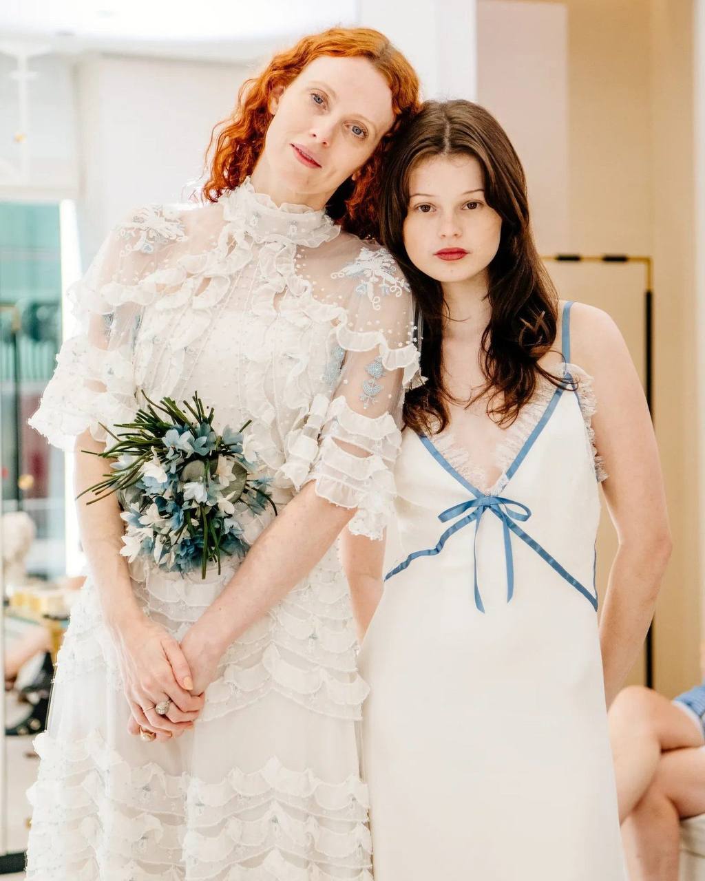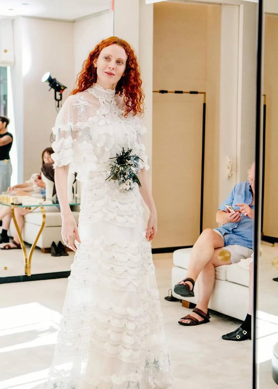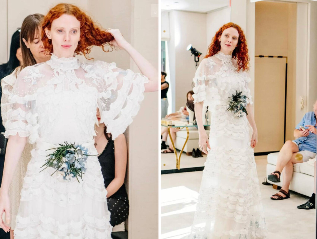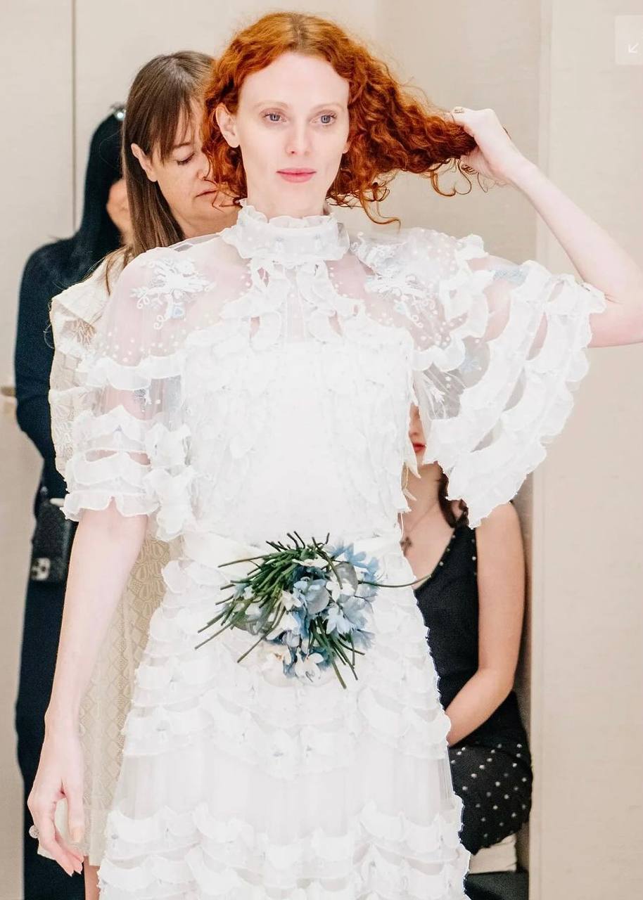Издание Vogue опубликовало фотографии с последней примерки свадебного платья Карен Элсон. Наряд сшили в ателье Valentino под руководством нового креативного директора Алессандро Микеле. Невеста написала дизайнеру письмо с просьбой создать для нее свадебное платье. «Я знала, что его работа будет мечтательной, волшебной и такой моей», — отметила модель. На последней примерке Элсон попросила добавить цветочное украшение небесно-голубого цвета, чтобы платье соответствовало традиции надевать на свадьбу вещь голубого цвета как символа любви, скромности и верности. Кстати, Микеле также разработал платье для дочери Элсон Скарлетт — нежное прямое белое платье с кружевом и голубой лентой.