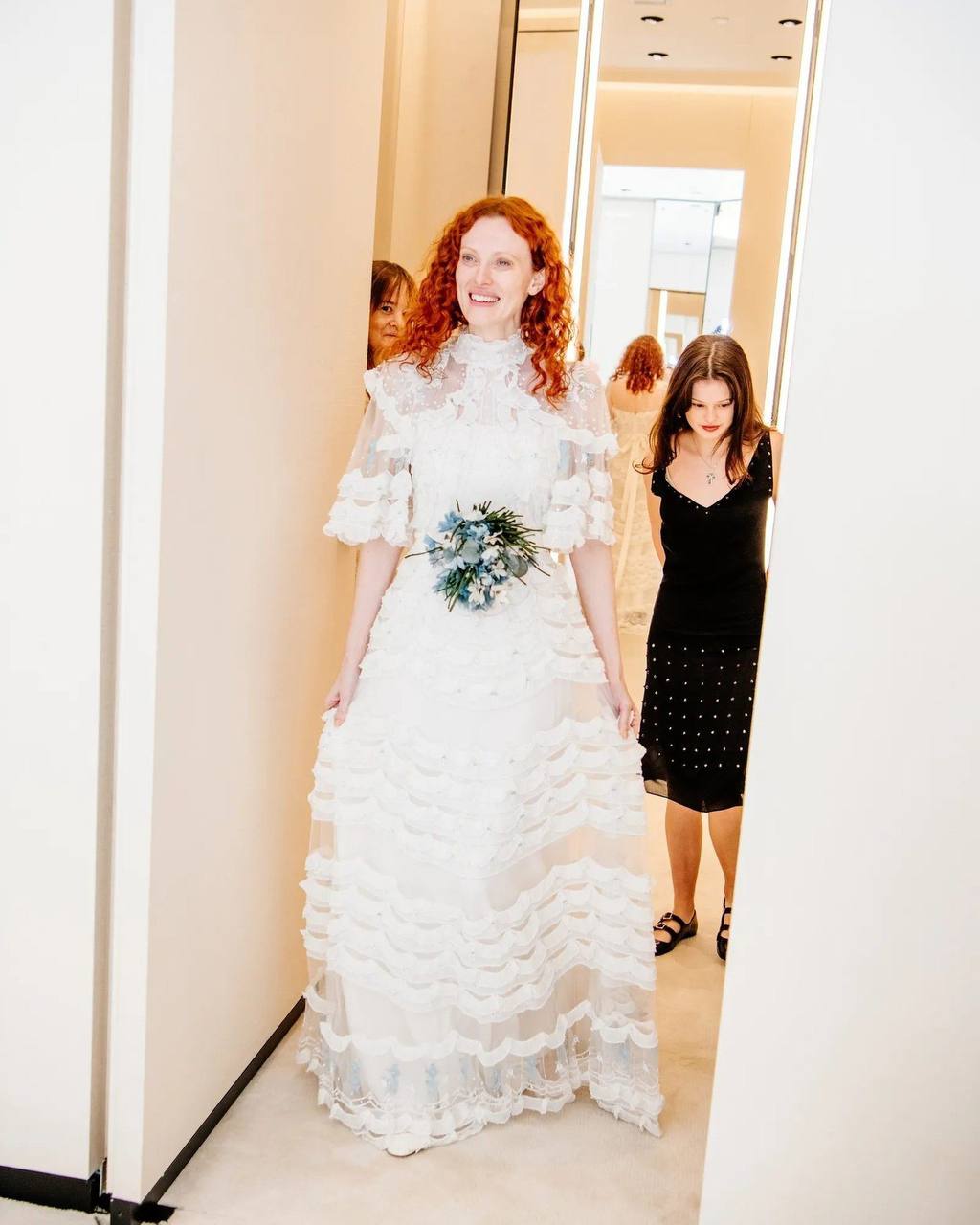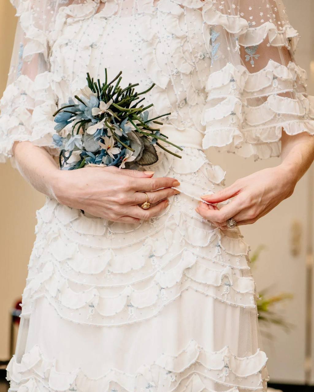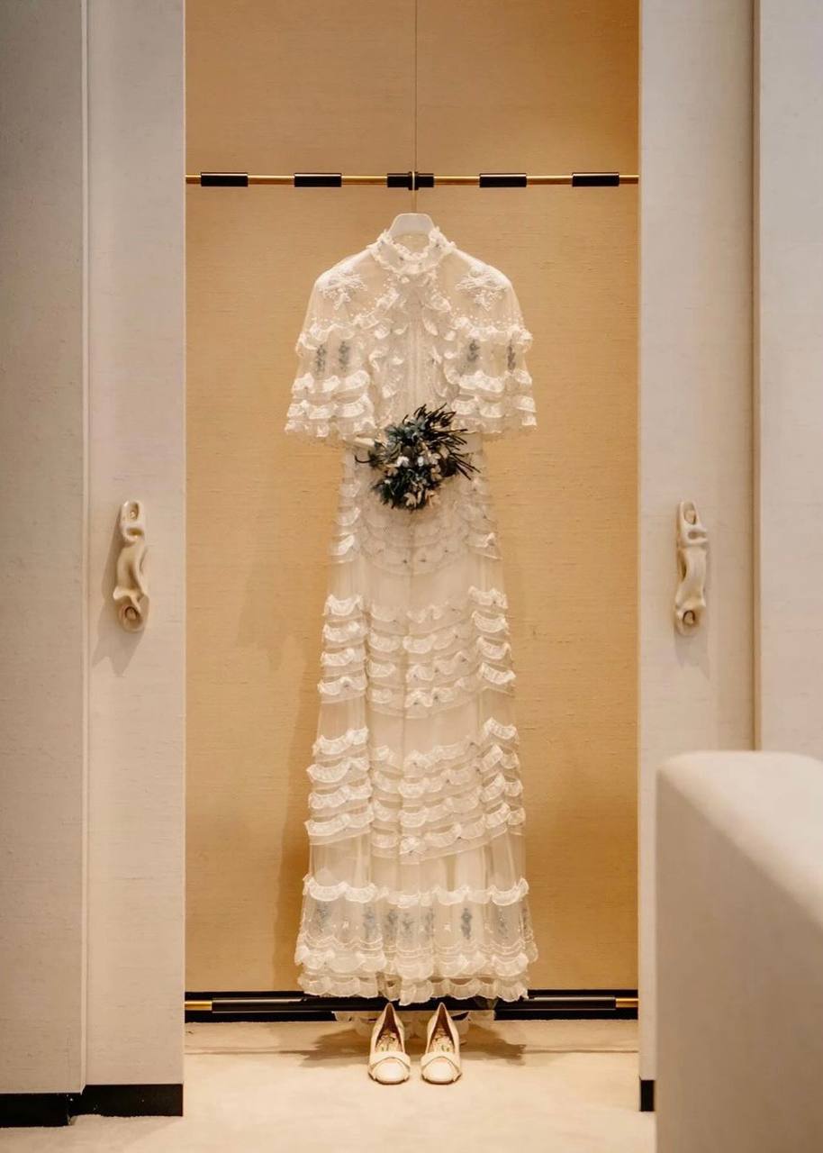 Издание Vogue опубликовало фотографии с последней примерки свадебного платья Карен Элсон. Наряд сшили в ателье Valentino под руководством нового креативного директора Алессандро Микеле. Невеста написала дизайнеру письмо с просьбой создать для нее свадебное платье. «Я знала, что его работа будет мечтательной, волшебной и такой моей», — отметила модель. На последней примерке Элсон попросила добавить цветочное украшение небесно-голубого цвета, чтобы платье соответствовало традиции надевать на свадьбу вещь голубого цвета как символа любви, скромности и верности. Кстати, Микеле также разработал платье для дочери Элсон Скарлетт — нежное прямое белое платье с кружевом и голубой лентой.