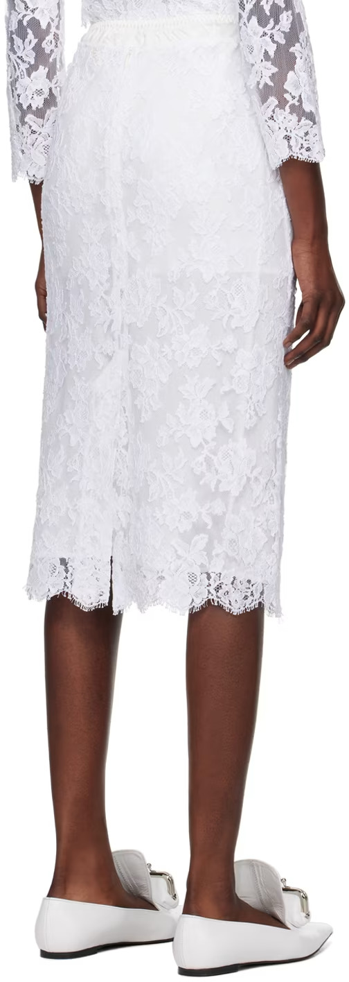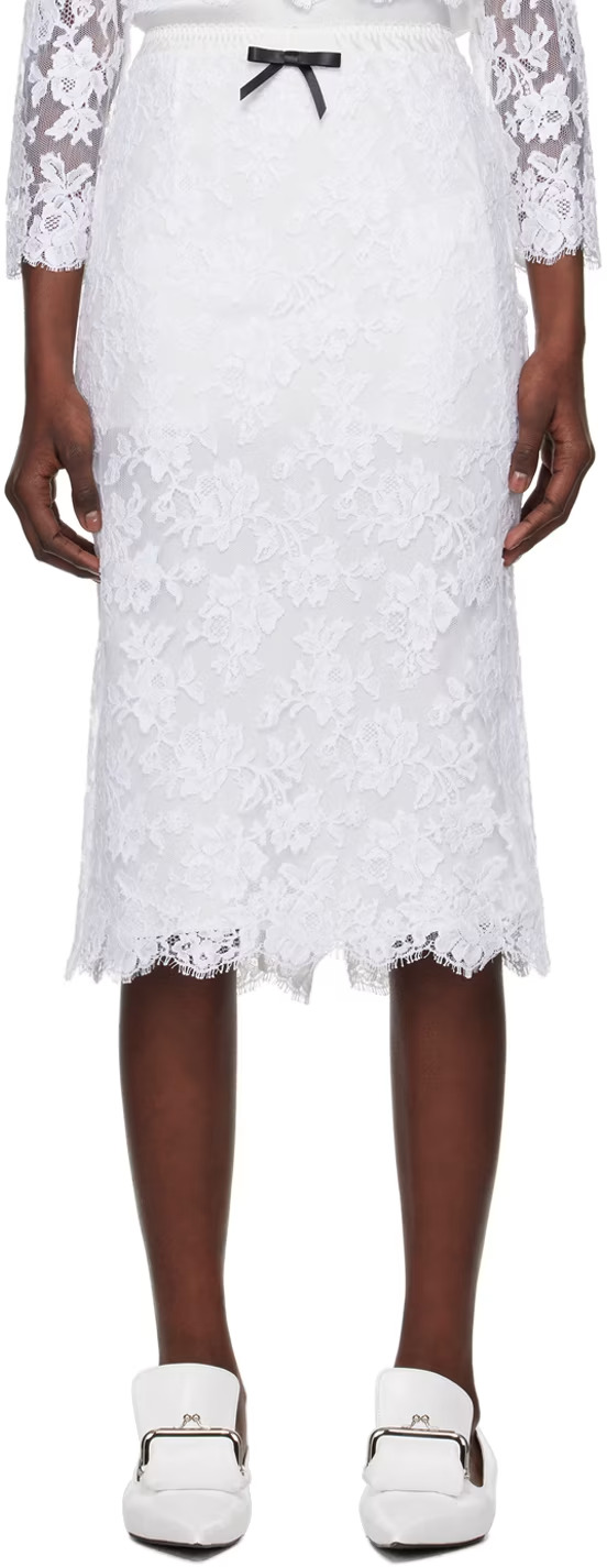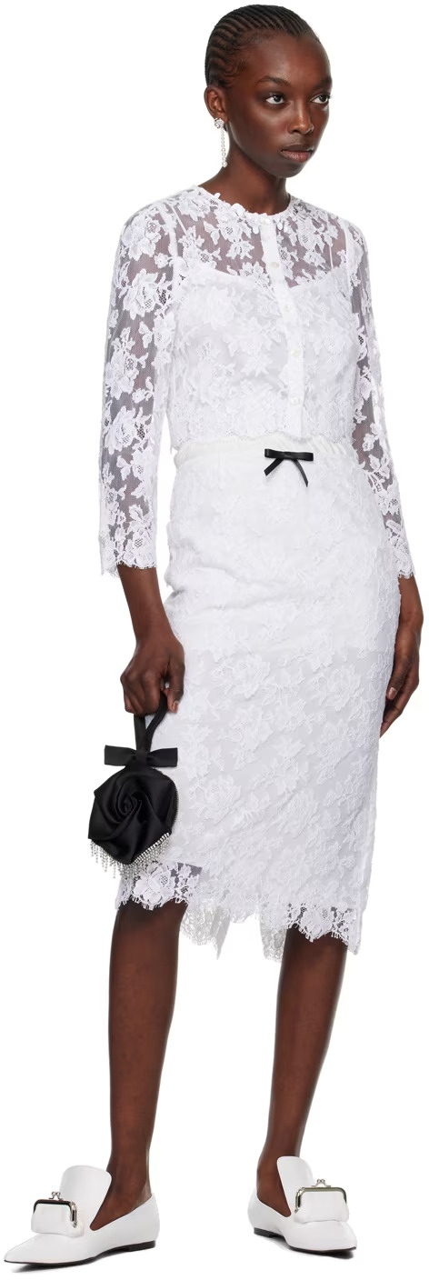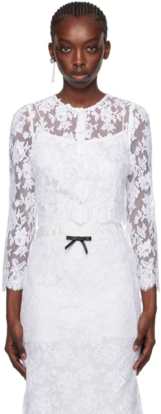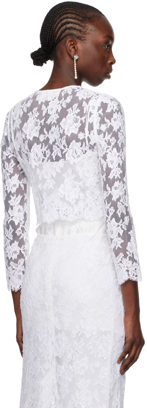 Тотал-лук из весенней коллекции 2024 года идеально подойдет для росписи или в качестве одного из свадебных образов. Наряд сочетает в себе сразу два модных тренда — прозрачность и кружево. Комплект продается с нижним слоем — топом и подъюбником, однако самые смелые и уверенные в себе невесты могут позволить себе вариант стилизации, как на подиуме: с бежевым бра и хлопковыми трусиками. Не стоит бояться, что образ получится слишком откровенным, консервативная длина юбки, очаровательный бантик и крупное кружево отлично сбалансирует обилие телесности. Стоимость комплекта составляет около 90 000 рублей, он доступен на официальном сайте марки.
