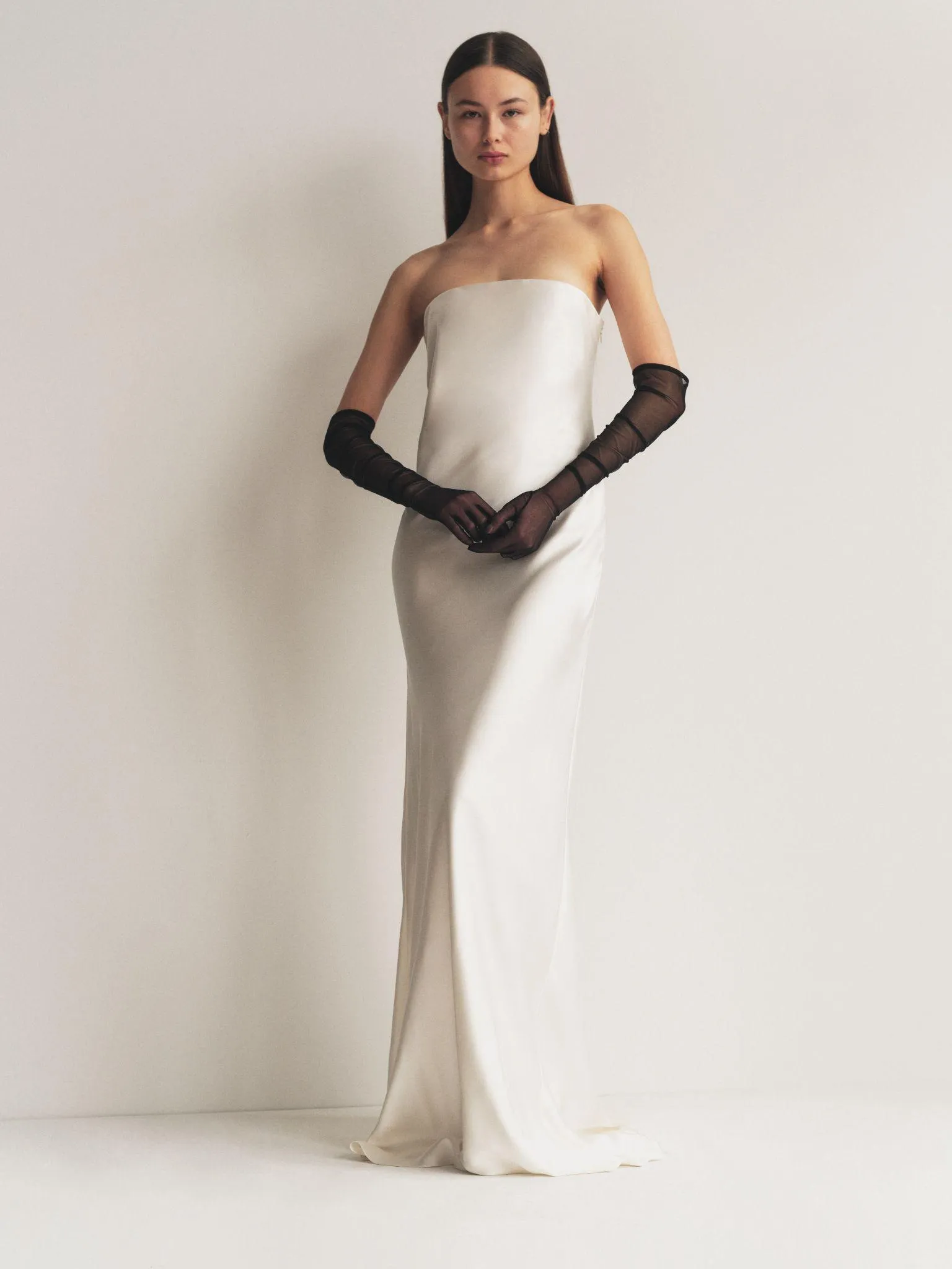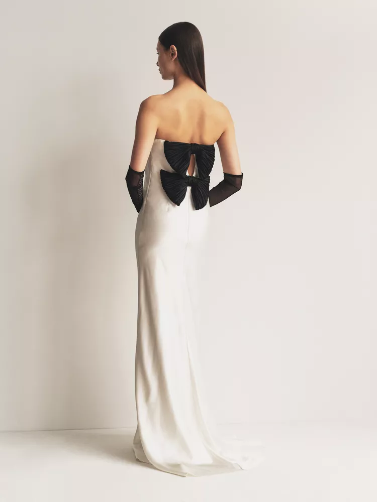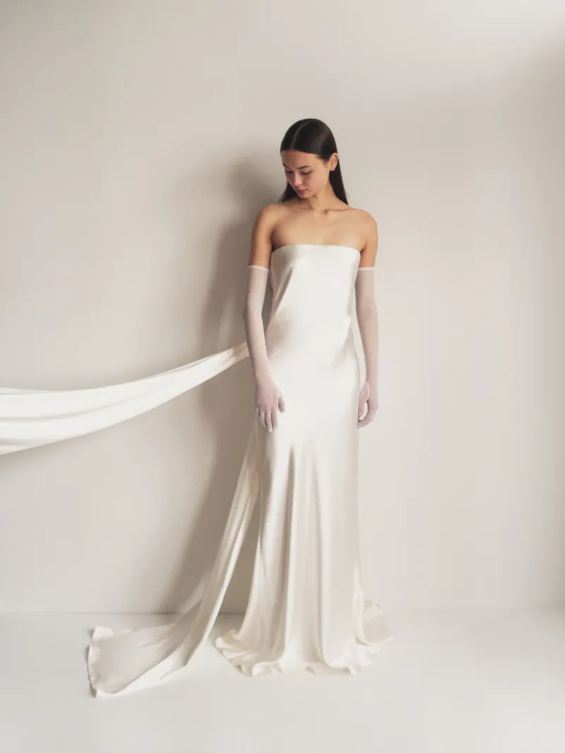 Этот прием был замечен в рекламном кампейне новой свадебной коллекции Alejandra Alonso Rojas. В весенней коллекции 2025 года дизайнер показала лаконичные и минималистичные платья в пол, дополненные длинными полупрозрачными перчатками белого или черного цвета. Последний — контрастный вариант — смотрится особенно стильно. К слову, модные издания также отмечают, что черные аксессуары — один из больших трендов свадебной моды в сезоне весна 2025. Берем на заметку!