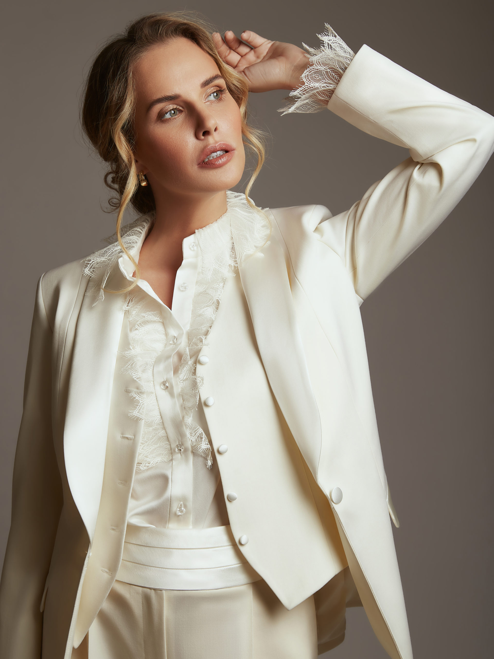 Первый в России бренд, специализирующийся исключительно на готовом женском смокинге и аксессуарам к нему, придуман Еленой Писаревой (она отвечает за дизайн) и Анастасией Плотницкой. Конечно, только свадебным репертуаром они не ограничиваются и шьют отлично сидящие и эффектно выглядящие смокинги на любой торжественный случай. Но если вы рискнете отказаться от традиционного платья и пойти под венец в классическом смокинге, то точно оцените и их крой, и внимательный подход к делу. Smart sexy – так бы мы охарактеризовали стиль бренда, близкий уверенным в себе и не мечтающим «изобразить принцессу» невестам. Если вы из таких – и не боитесь шокировать старшее поколение приглашенных своими широкими взглядами на дресс-код – смело отправляйтесь в Elean. Можно сразу с фотографией Бьянки Джаггер в свадебном костюме.