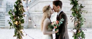 Концепция свадьбы выгодно подчеркнула элегантность и торжественность замка, в котором проходила церемония, при этом сохранив камерность и душевность праздника в узком семейном кругу: лаконичный декор с ветками зелени и гирляндами из лампочек, стол под открытым небом, плетеные стулья.