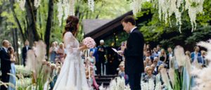 Таинственные звуки леса и пение птиц. Эльфы и феи — хранители любви. Невеста появилась из глубины чащи в сопровождении дедушки. Обмен клятвами стал самым трогательным моментом торжества. В финале, после поцелуя молодоженов, лес, как по волшебству, окутал яркий фиолетовый туман.
