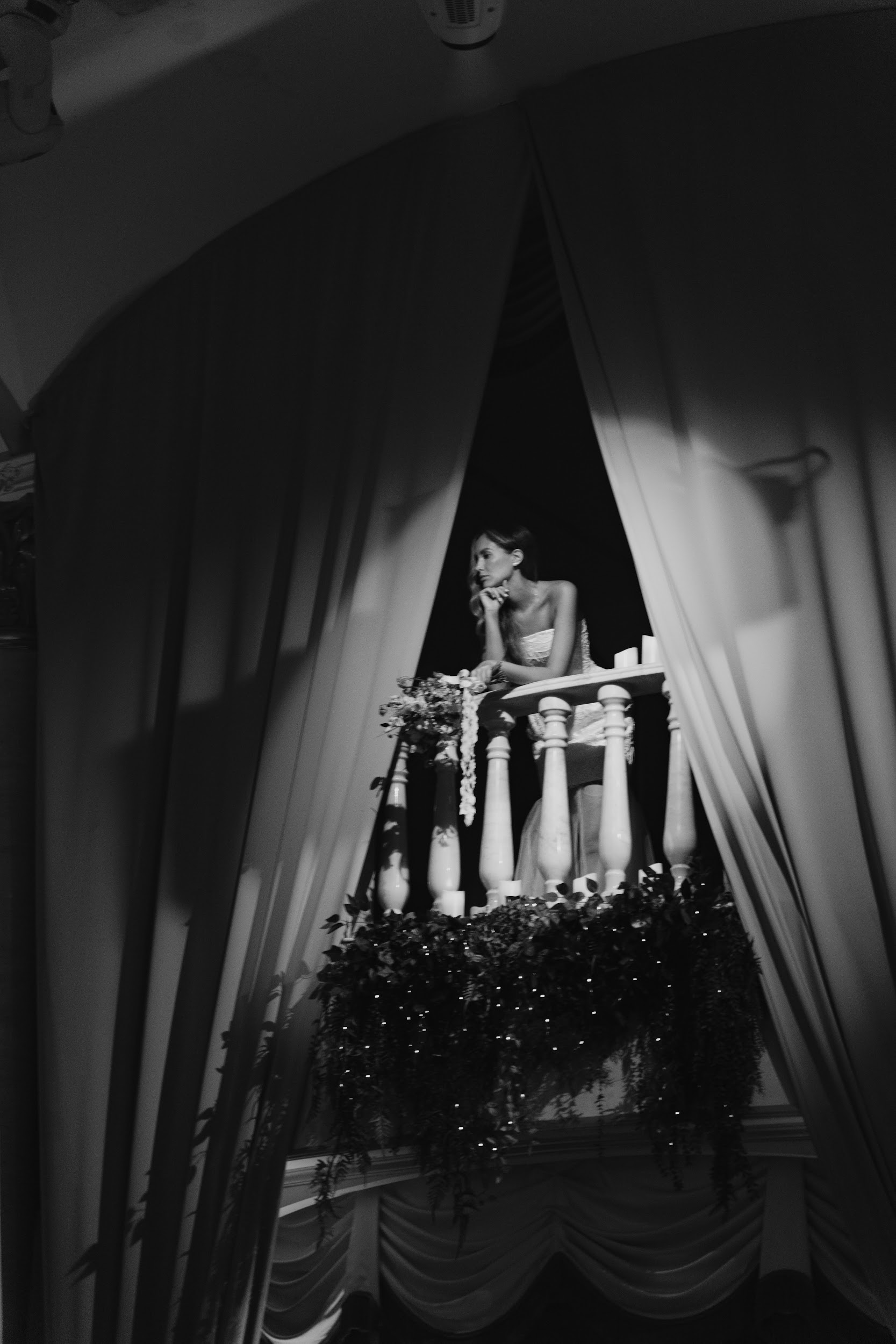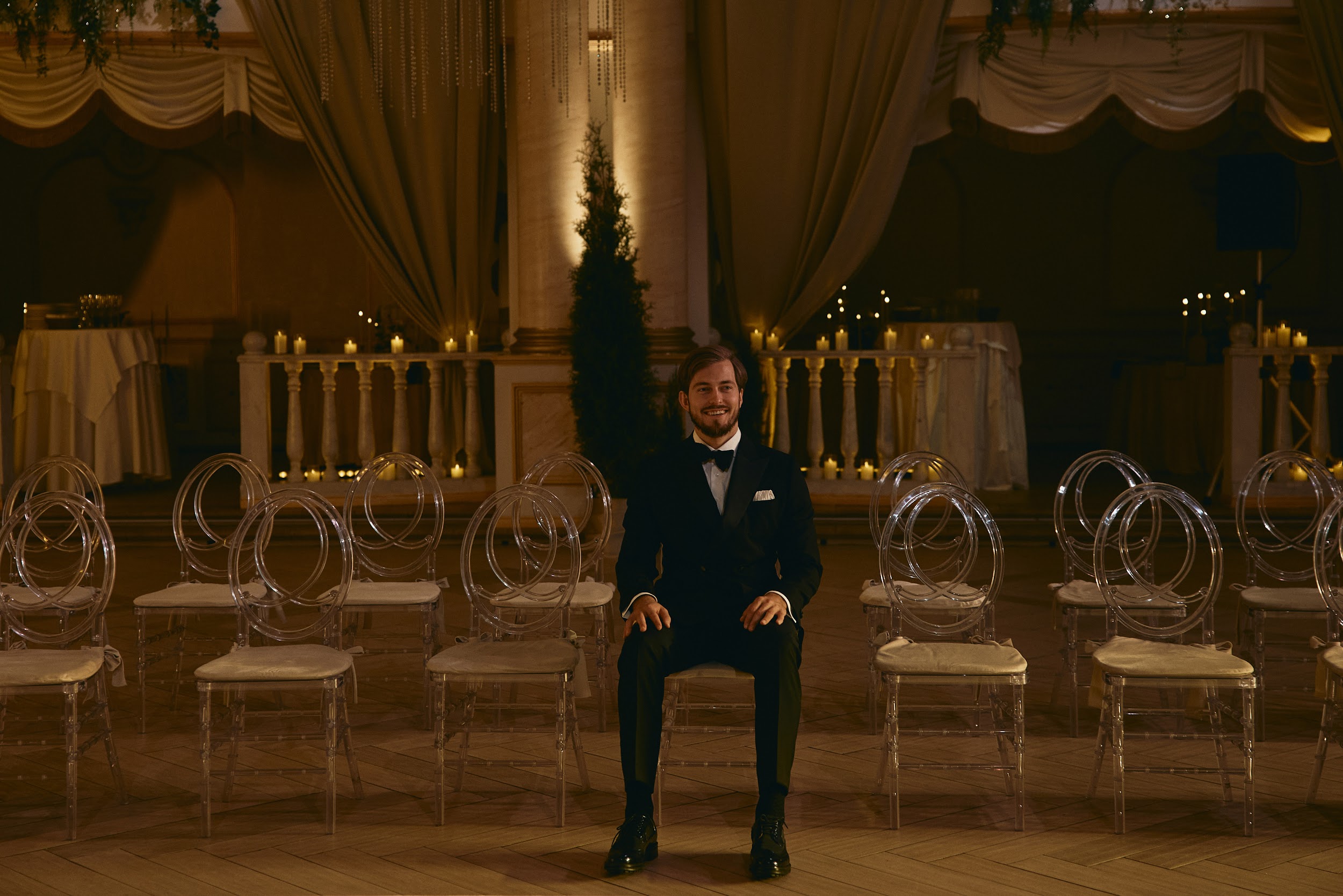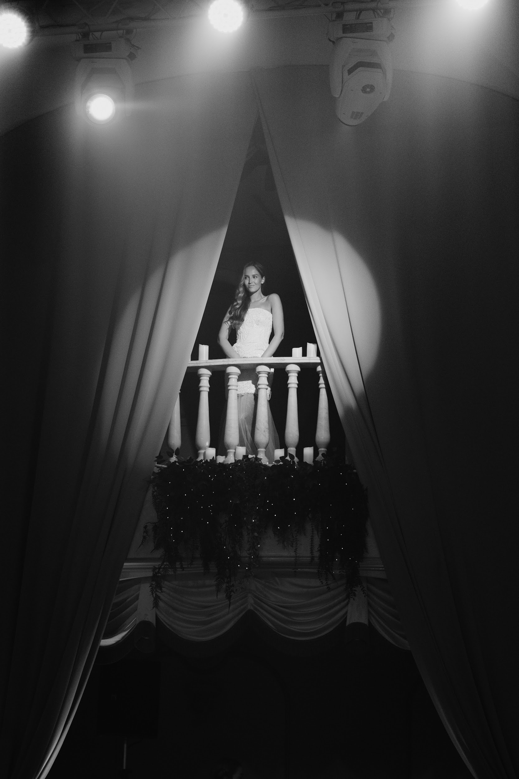 Мы выбирали локацию, напоминающую итальянскую архитектуру. В итоге в самом центре Тюмени мы преобразовали танцевальный зал «Золотые Ворота Сибири»: балконы 1-го и 2-го этажа задекорировали шторами и свечами, зеленью и теплыми огоньками, подсветили античные колонны по периметру, подчеркнув вытянутую форму зала.