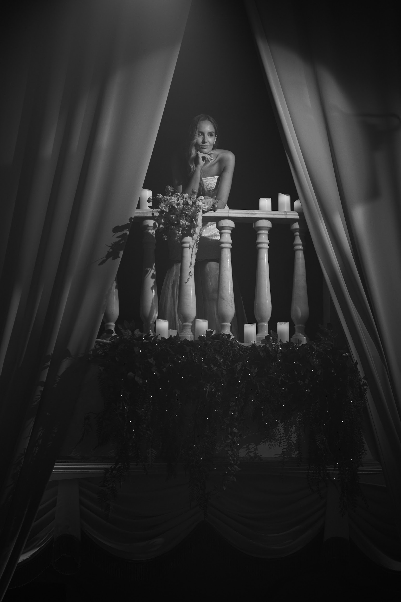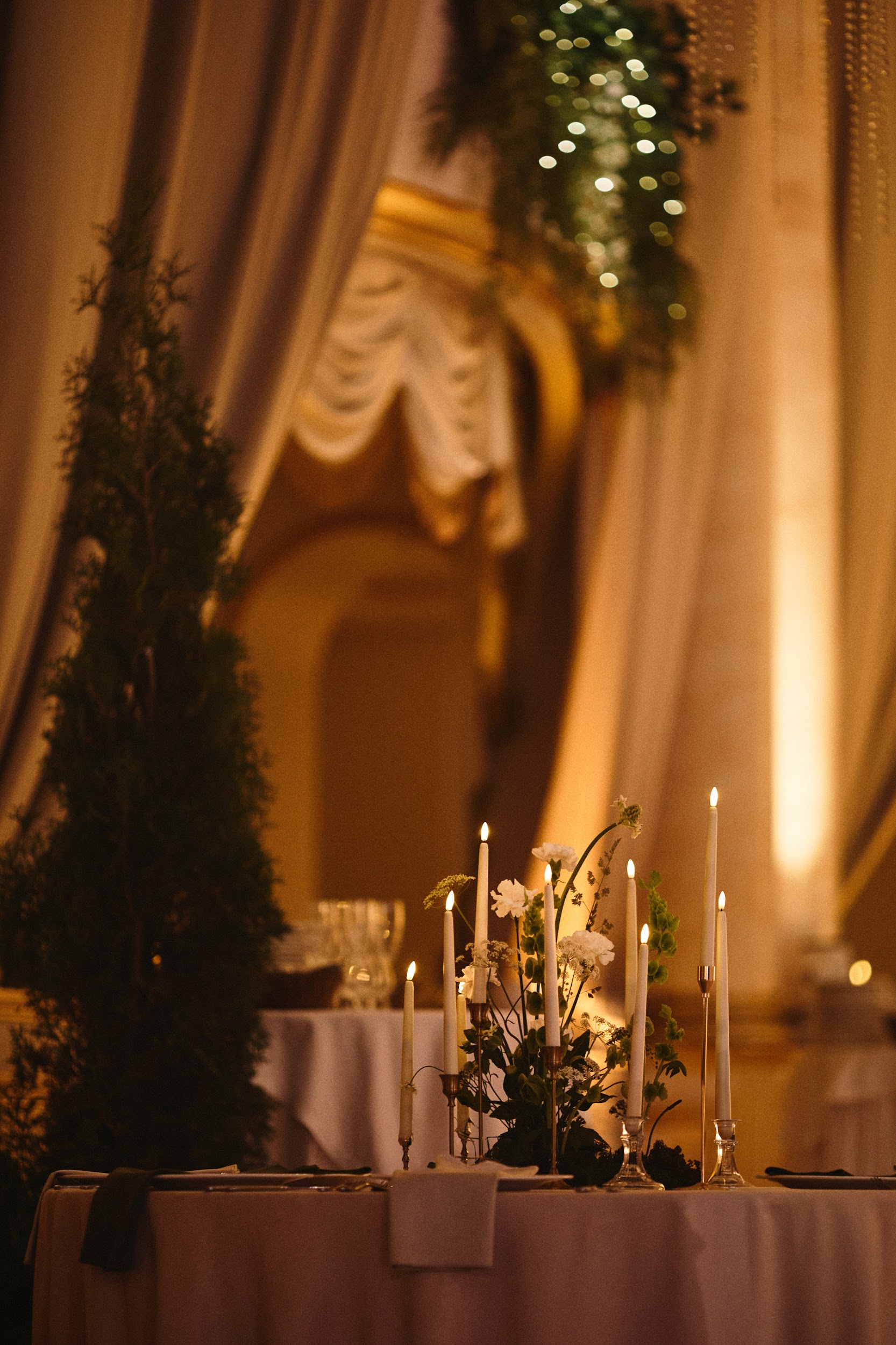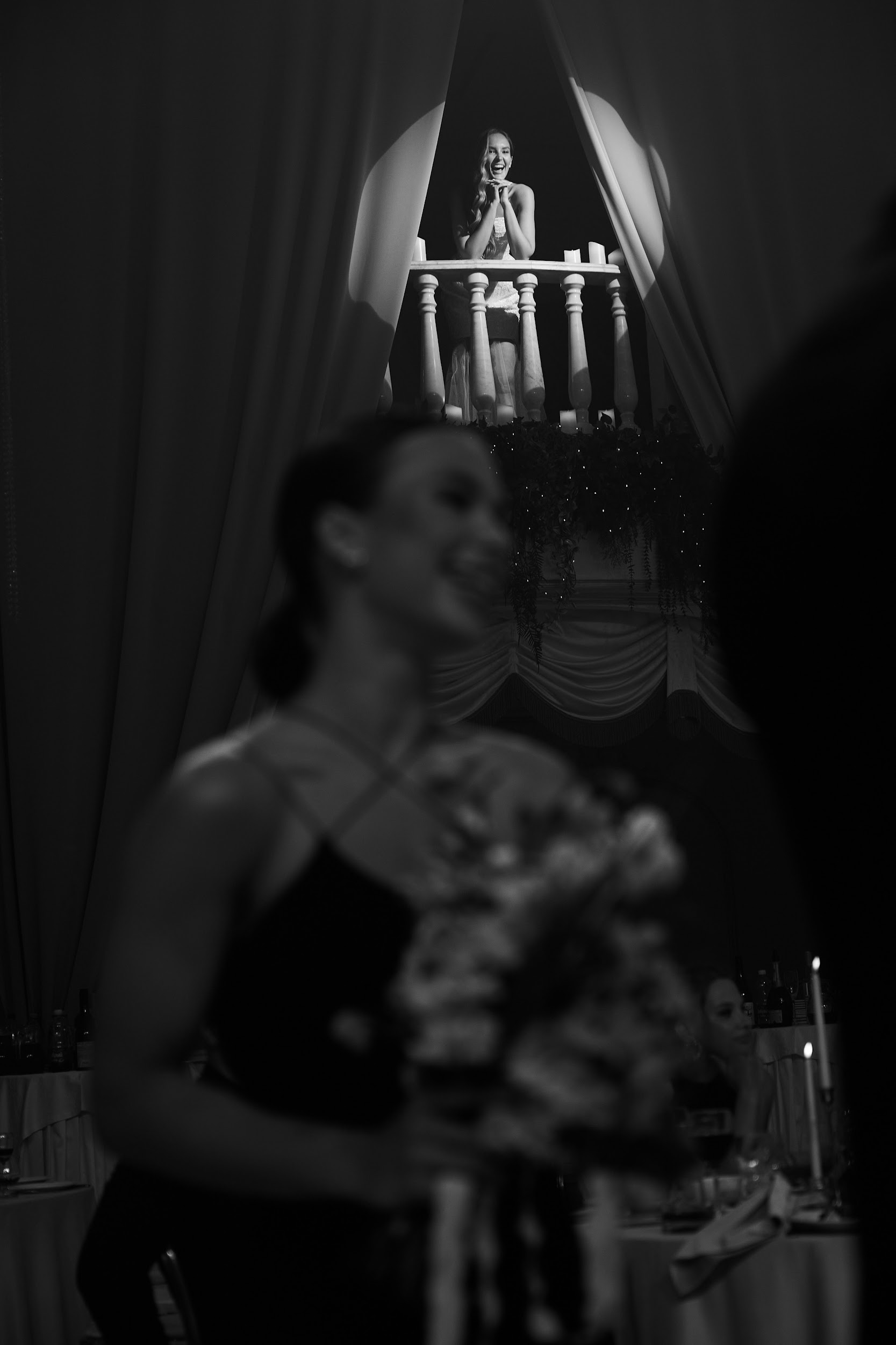 Мы выбирали локацию, напоминающую итальянскую архитектуру. В итоге в самом центре Тюмени мы преобразовали танцевальный зал «Золотые Ворота Сибири»: балконы 1-го и 2-го этажа задекорировали шторами и свечами, зеленью и теплыми огоньками, подсветили античные колонны по периметру, подчеркнув вытянутую форму зала.