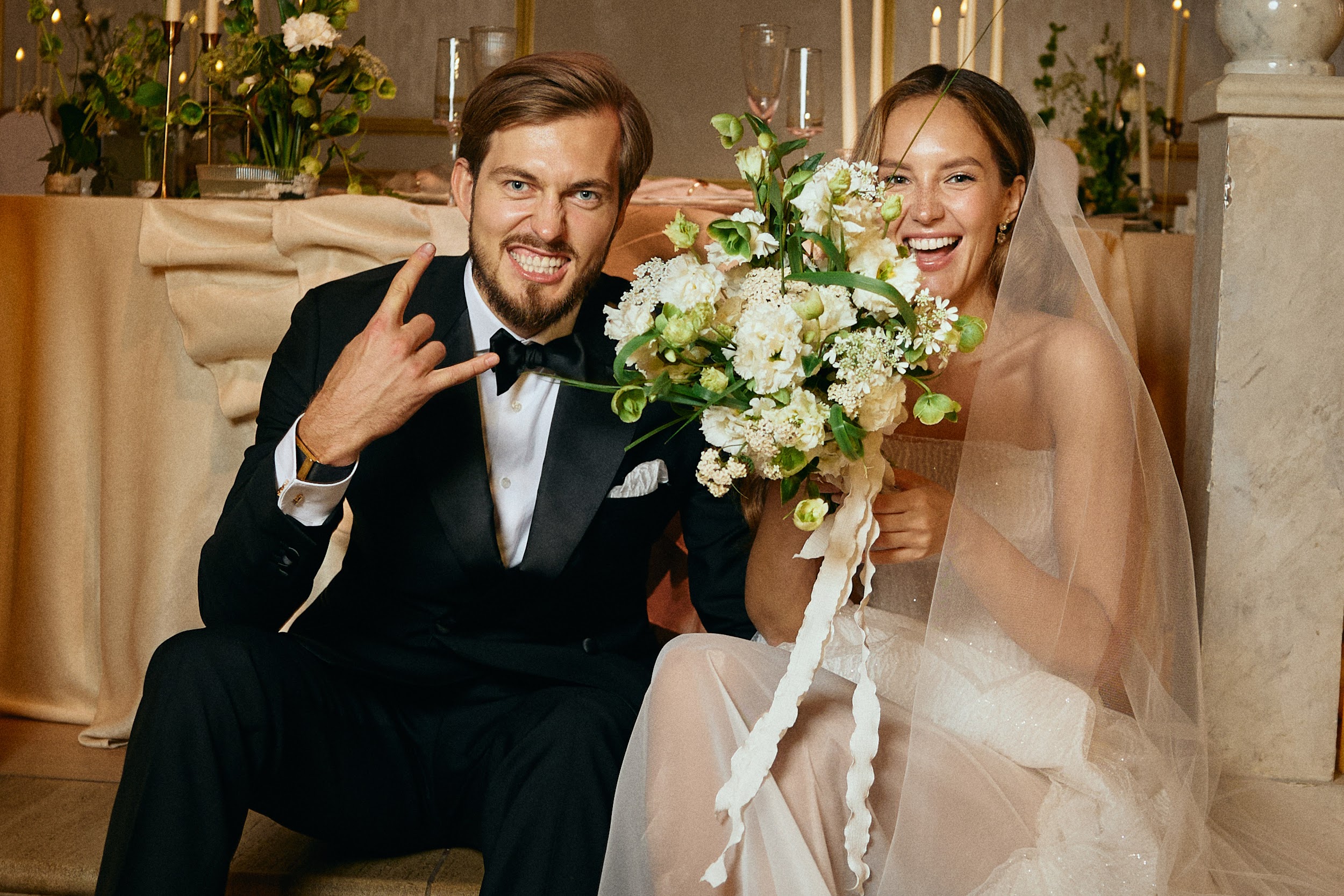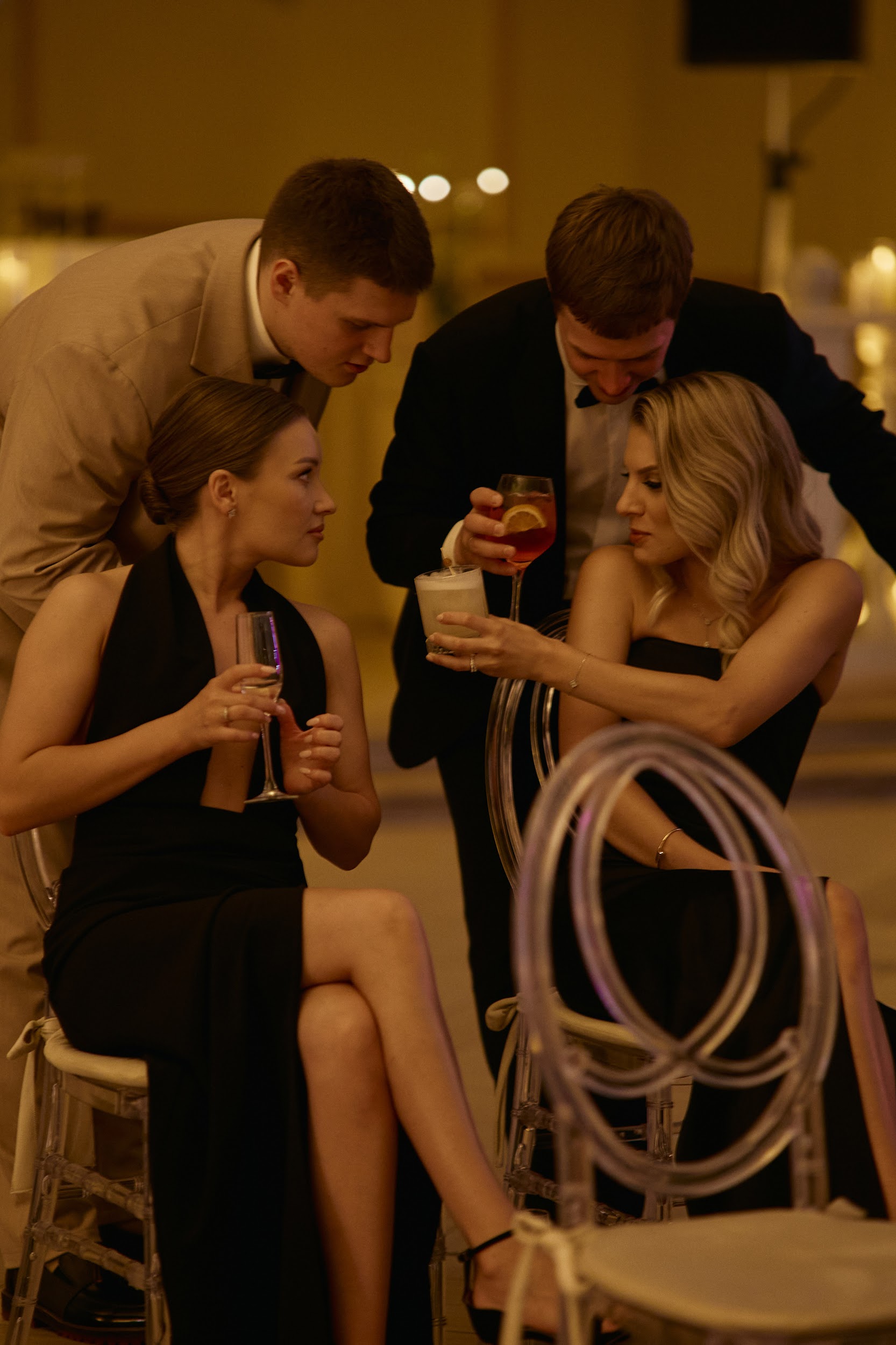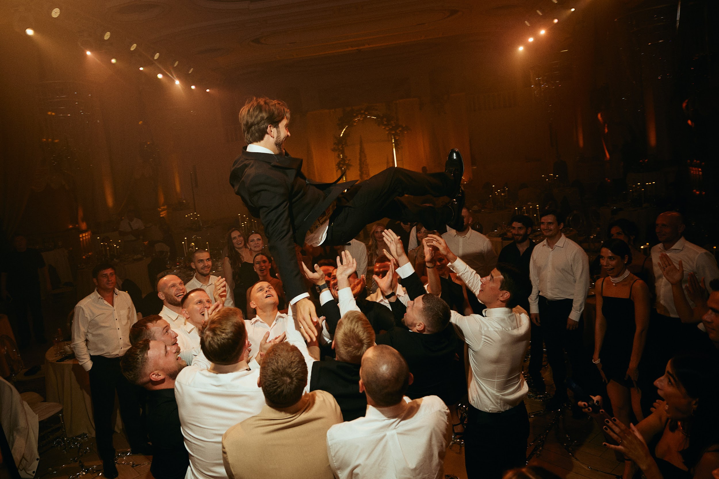 Банкет начался с салфеток в воздухе, разлития пирамиды просекко и нереально эмоциональных танцев от гостей. Все столы были сервированы по индивидуальному меню, заранее выбранному каждым гостем на сайте свадьбы. Полет букета невесты с «балкона Джульетты»: кинематографично поднявшись на второй этаж зала, невеста бросила счастливый букет подругам