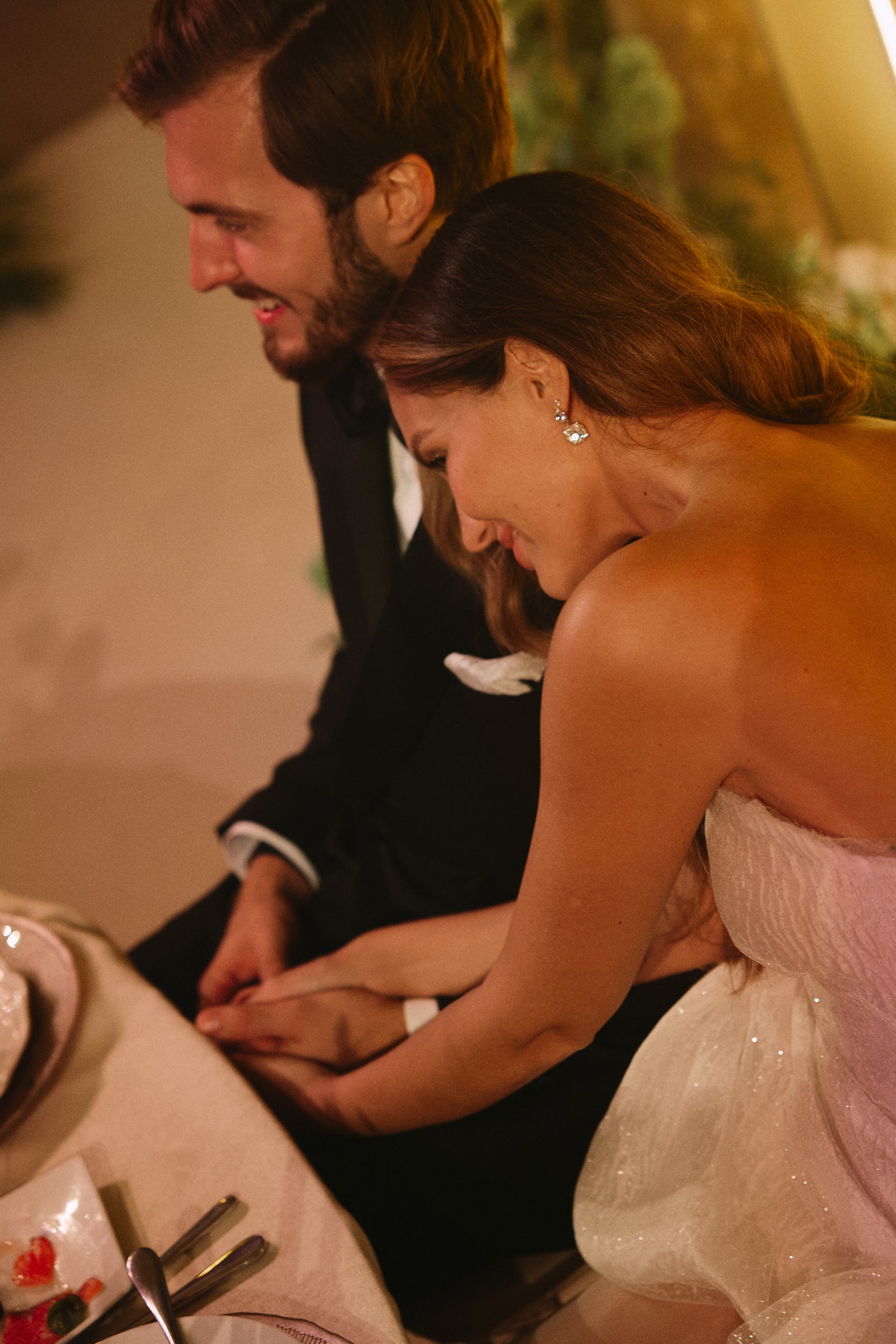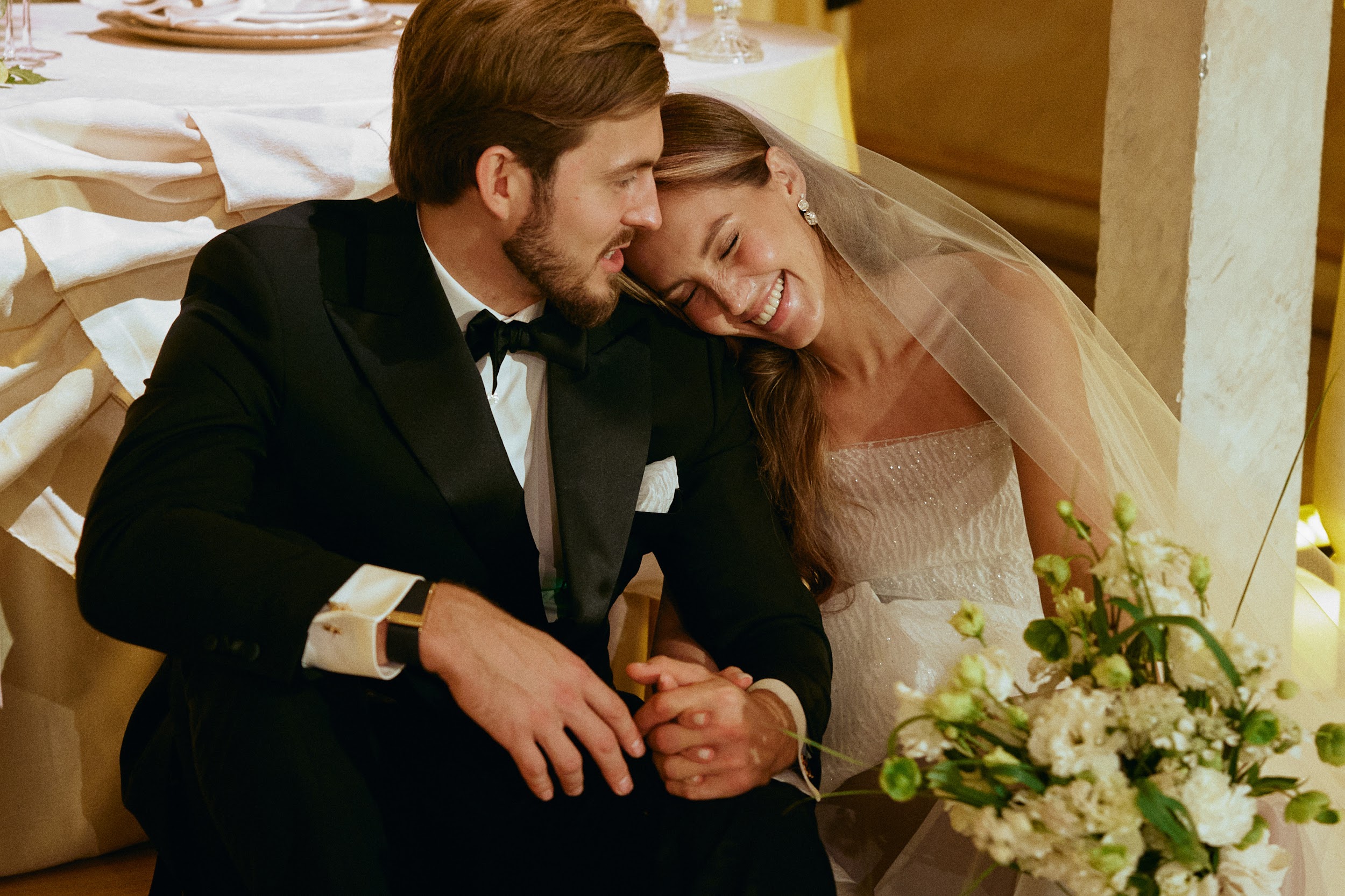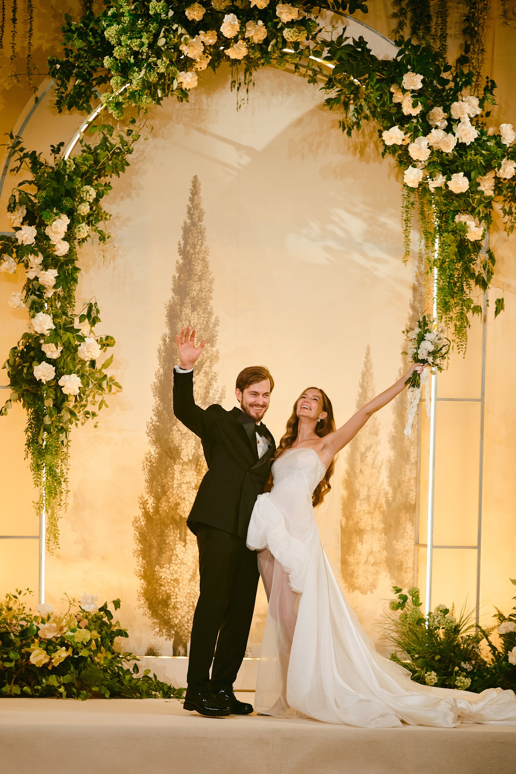 Банкет начался с салфеток в воздухе, разлития пирамиды просекко и нереально эмоциональных танцев от гостей. Все столы были сервированы по индивидуальному меню, заранее выбранному каждым гостем на сайте свадьбы. Полет букета невесты с «балкона Джульетты»: кинематографично поднявшись на второй этаж зала, невеста бросила счастливый букет подругам