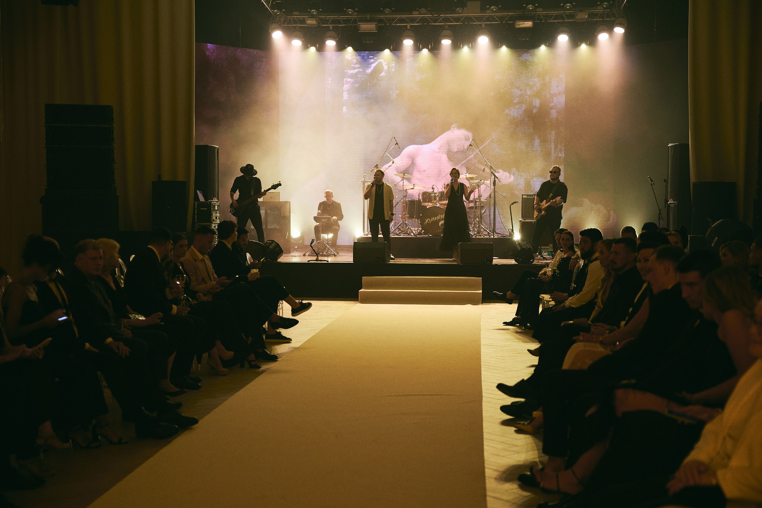 Гости не скучали — ненавязчивая игра фортепиано, итальянские закуски на фуршете, пирамидка с ягодами, беллини-станция, авторские коктейли, видеоинтервью с гостями. Когда двери в большой зал открылись, гости окунулись в атмосферу Ренессанса: мягко окутывал приглушенный свет, известные фрески на экране сменялись одна за другой, словно в галерее.