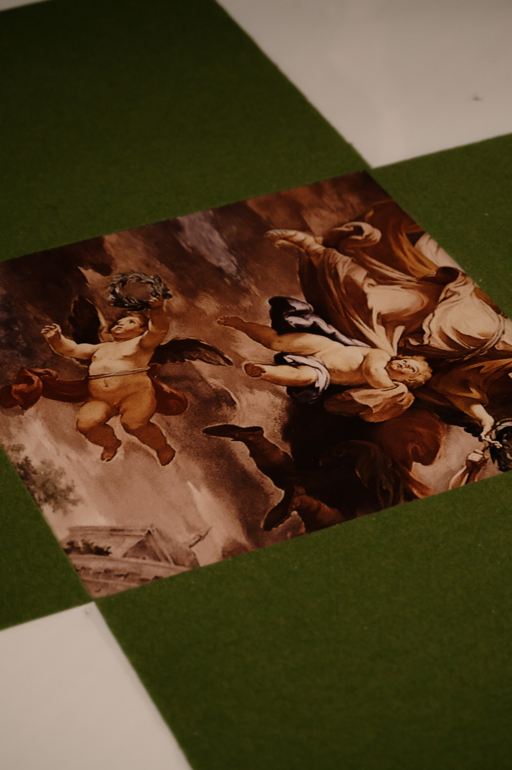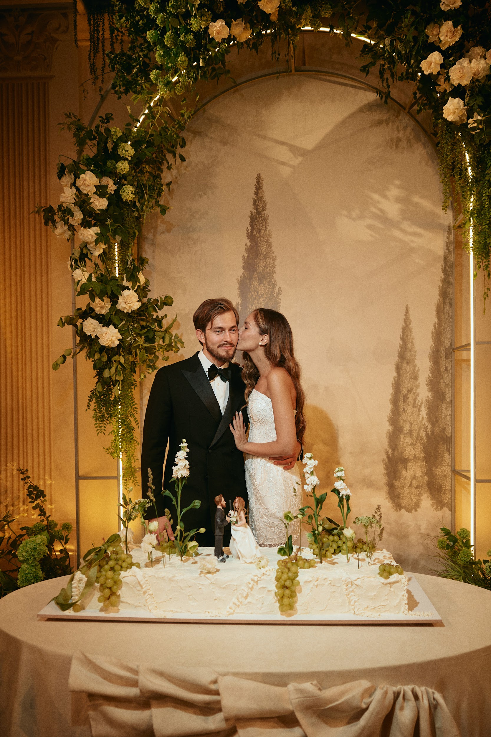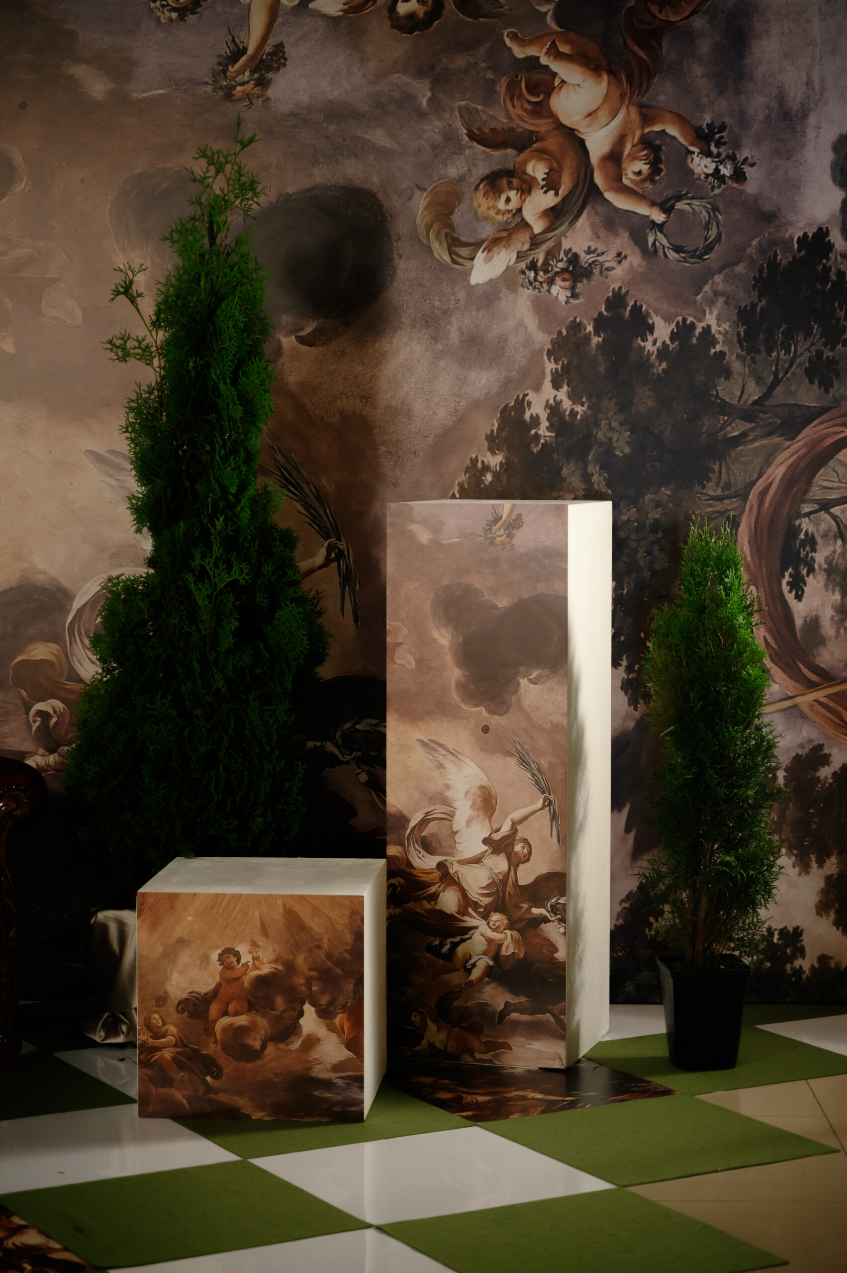 Главная зона — 6-метровая классическая арка с изящными европейскими пейзажами на полотнах за ней. Фотозону украсила угловая фреска из эпохи Возрождения, живые туи, акцентный диван и характерный европейский пол из игривого шахматного рисунка, чередующего элементы фрески, белые клетки и газон. В фойе мы создали элегантную атмосферу с теплым светом.