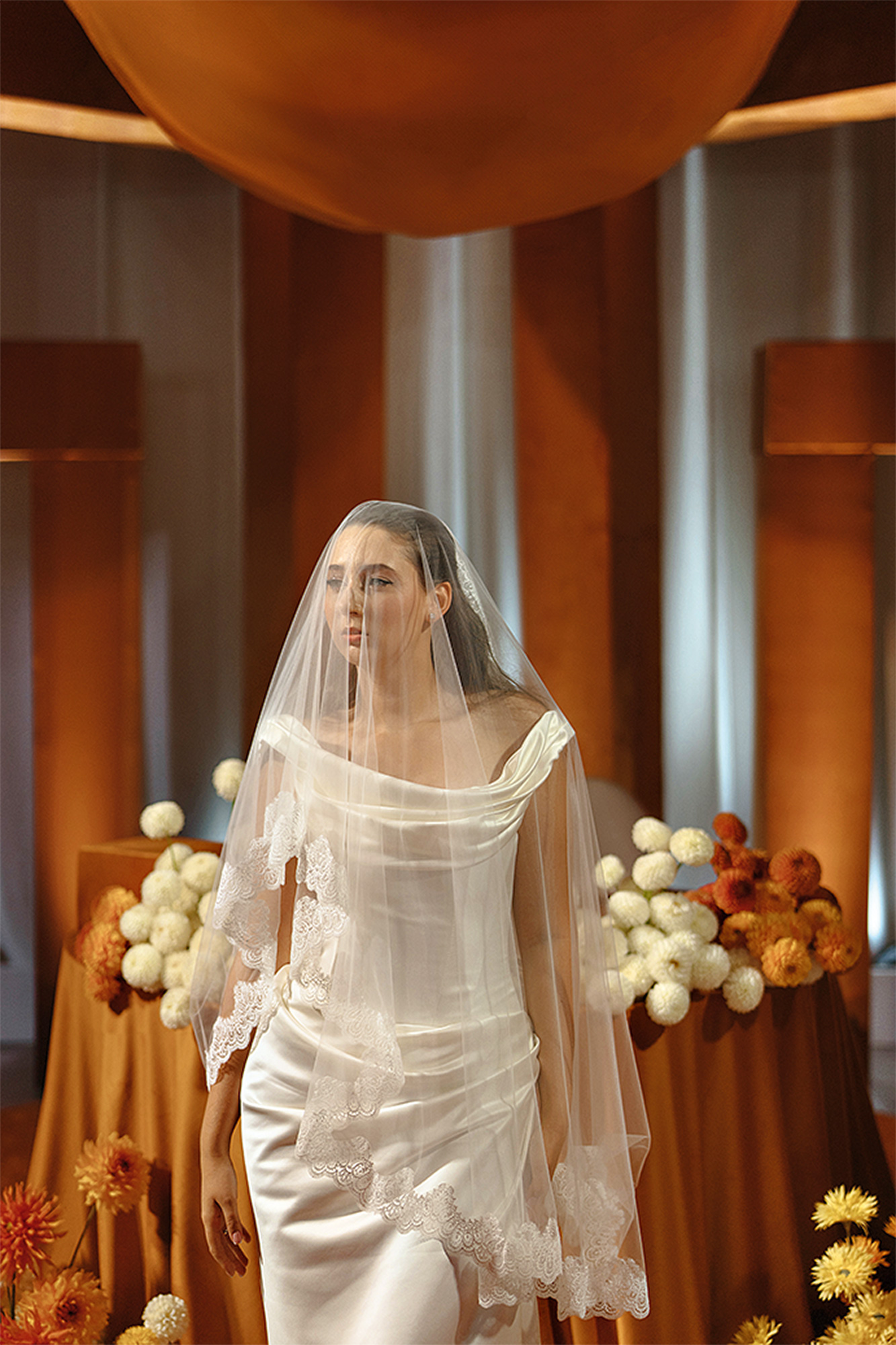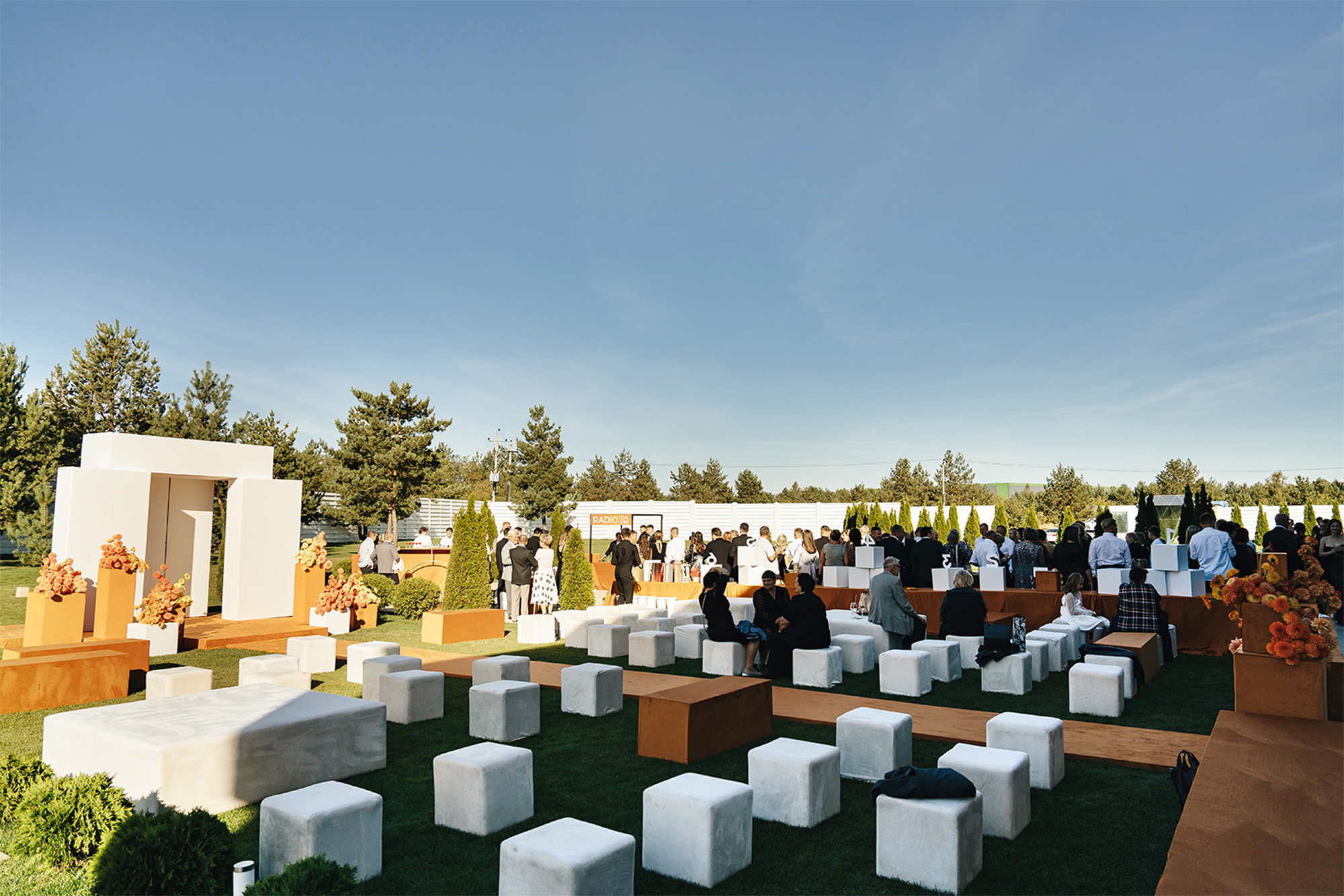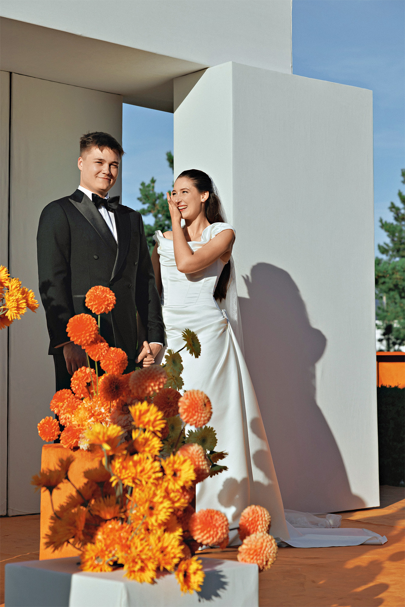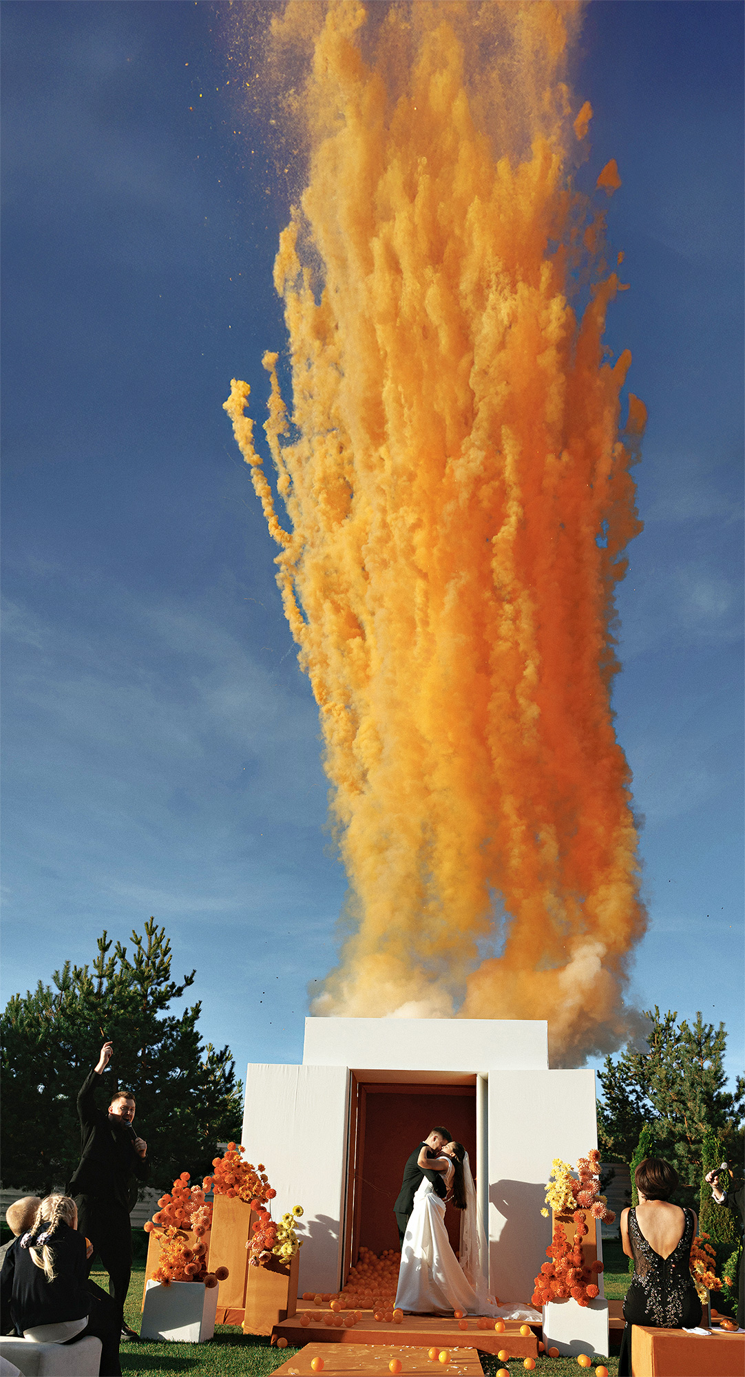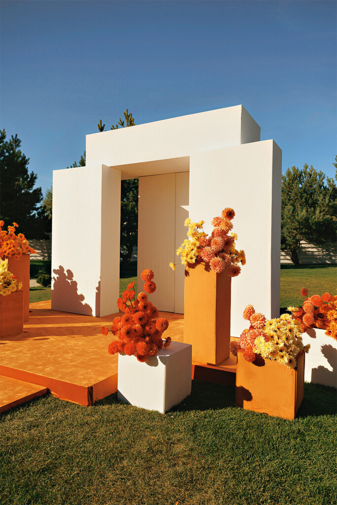 В проекте объединились тренды на монохром и на яркие дофаминовые цвета. И вместе этот дуэт оказался таким же гармоничным, как наша пара. Белые геометричные элементы в декоре олицетворяли начало сотворения их мира, а яркие краски появились с разломом зоны церемонии, из которого высыпались сотни оранжевых шаров в сопровождении залпов цветного дыма.