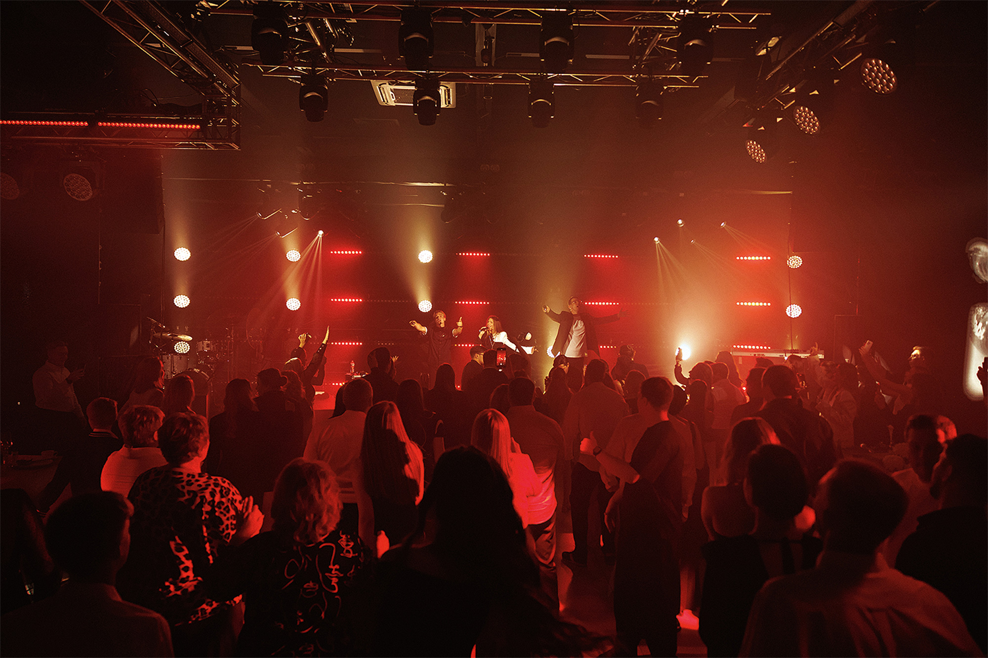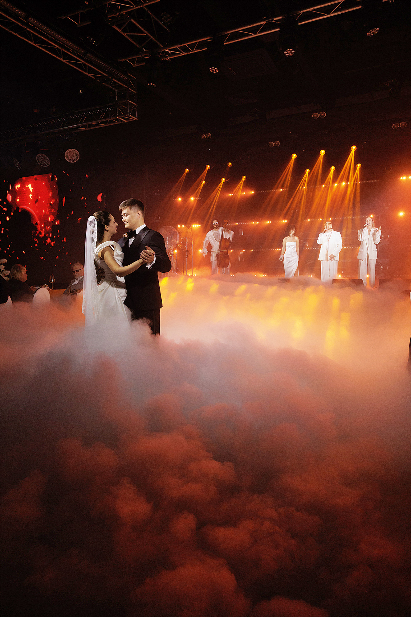 Свадебный ужин был разделена смысловые блоки разных цветов при помощи технических решений и шоу. Первый — красный — блок был посвящен невесте, второй — желтый — жениху, а третий, оранжевый, отражал слияние их индивидуальностей. Кульминацией дня стало окрашивание торта в цвет их нового яркого мира.