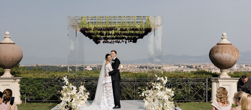Свадьба проходила на самой престижной в Риме вилле Миани. Величественная архитектура, невероятный вид на город и cобор Святого Петра, смелое декораторское решение использовать темные тона и черные каллы в сочетании с белыми лилиями — все это придало вечеру торжественности и нежной лаконичности одновременно. А команде профессионалов, работавших над проектом, удалось найти баланс между глубиной и весельем. И мы смогли сыграть эту особенную историю в декорациях Вечного города, который расстилался у ног молодых!