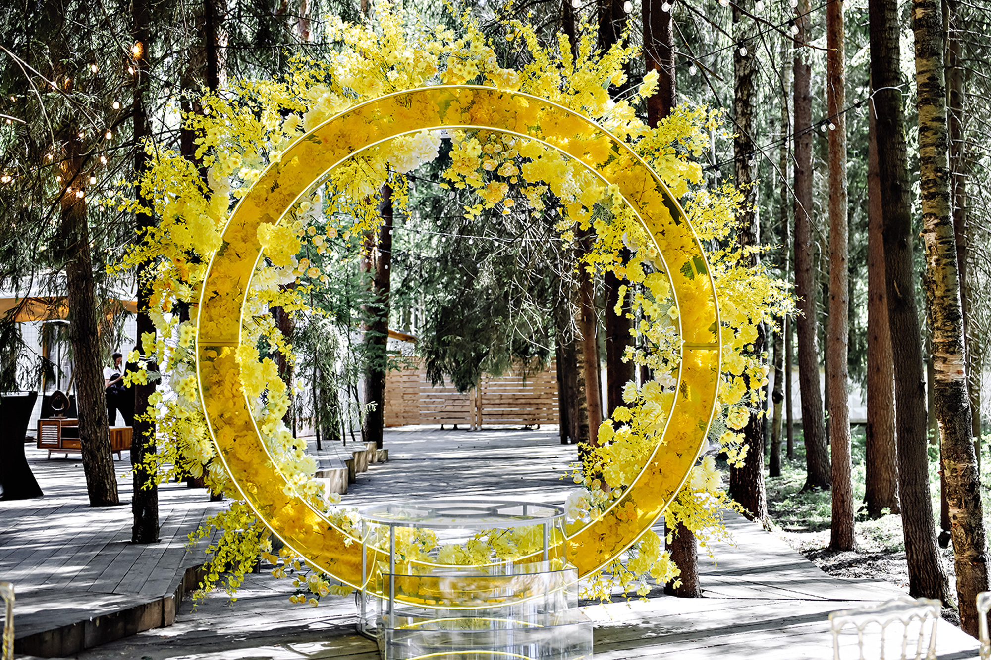Идея сделать свадьбу в желтых тонах существовала очень давно, но далеко не каждые молодожены готовы к таким смелым экспериментам. А тут все получилось как нельзя лучше — нашлась яркая и жизнерадостная пара, которая отлично восприняла идею. Поэтому главной темой оформления стало солнце и свет, который оно, как и настоящая любовь, дарит всем вокруг. Отcюда и главная форма, на которой был построен весь декор: не просто круг, а замкнутое кольцо — символ бесконечности и соединения двух сердец в одно.