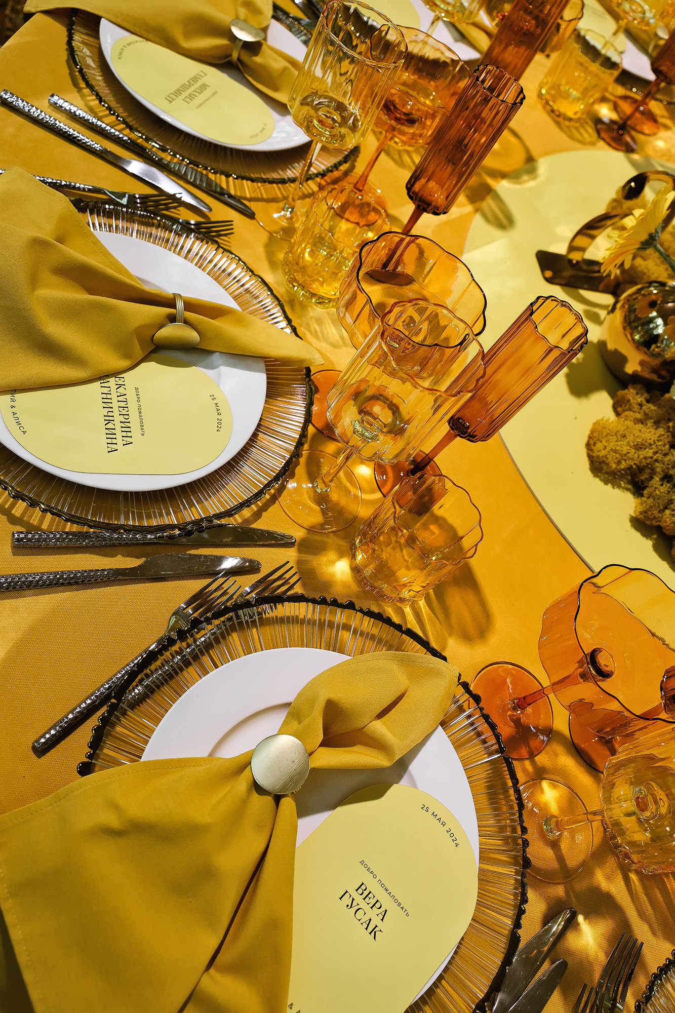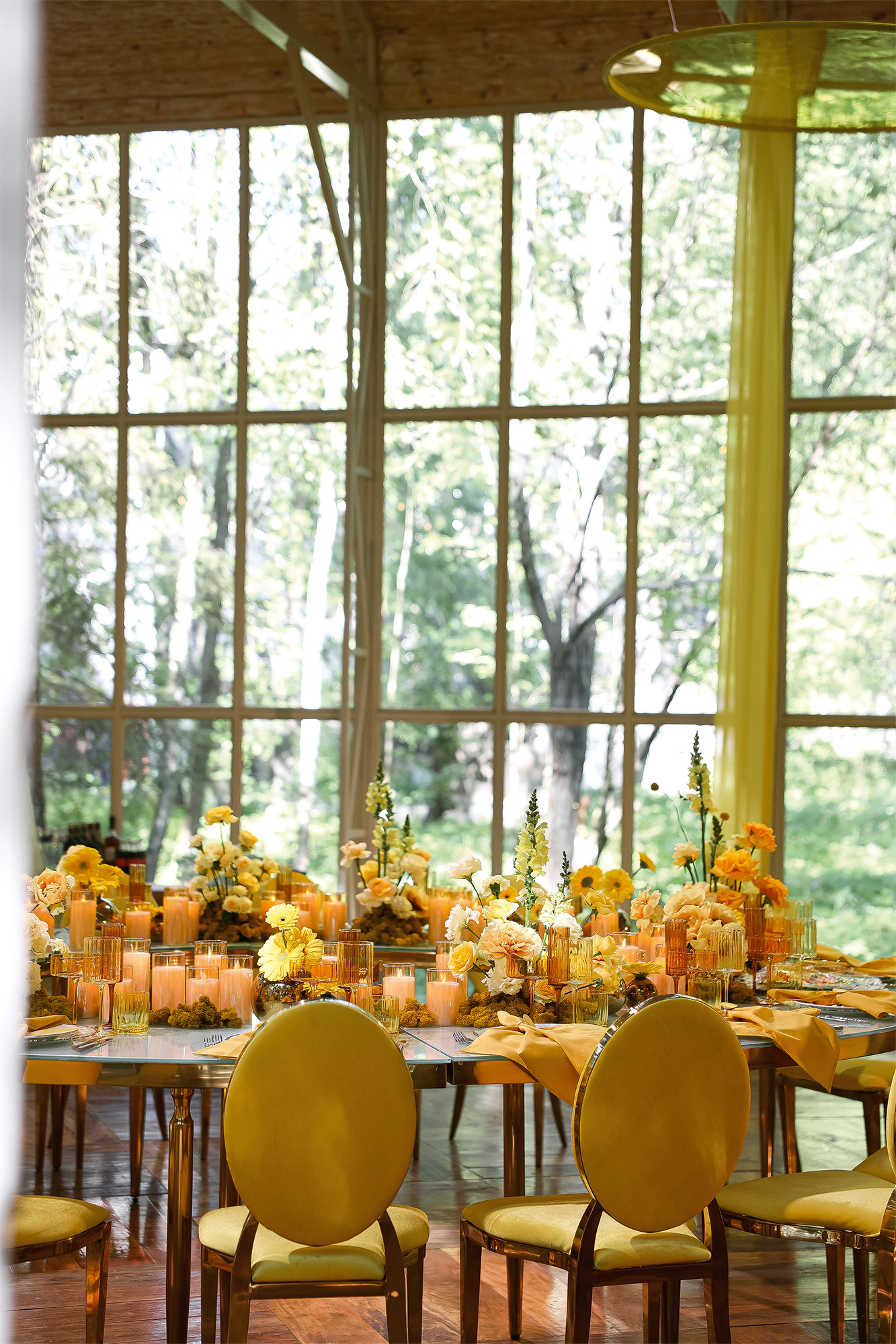Для большего эффекта была создана парящая в воздухе конструкция: желтое кольцо проходило прозрачный подиум насквозь, а флористика, выложенная расходящимися лучами, поддерживала образ солнца. Остальные детали декора — от мебели до сервировки — были выдержаны в монохромной гамме. Все фактуры гармонировали между собой, поддерживая общую концепцию, построенную на тепле и радости, которые дарит нам наше светило. В результате получился уникальный и яркий проект, по масштабу и wow-эффекту соперничающий с картинкой, созданной при помощи ИИ.