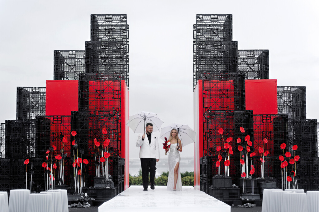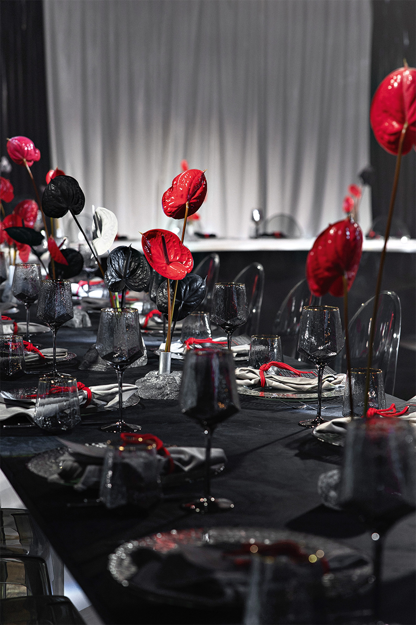 Характеры молодых были представлены в виде двух скал, окруженных красными и черными антуриумами, — в их соединении и заключалась сила союза пары.