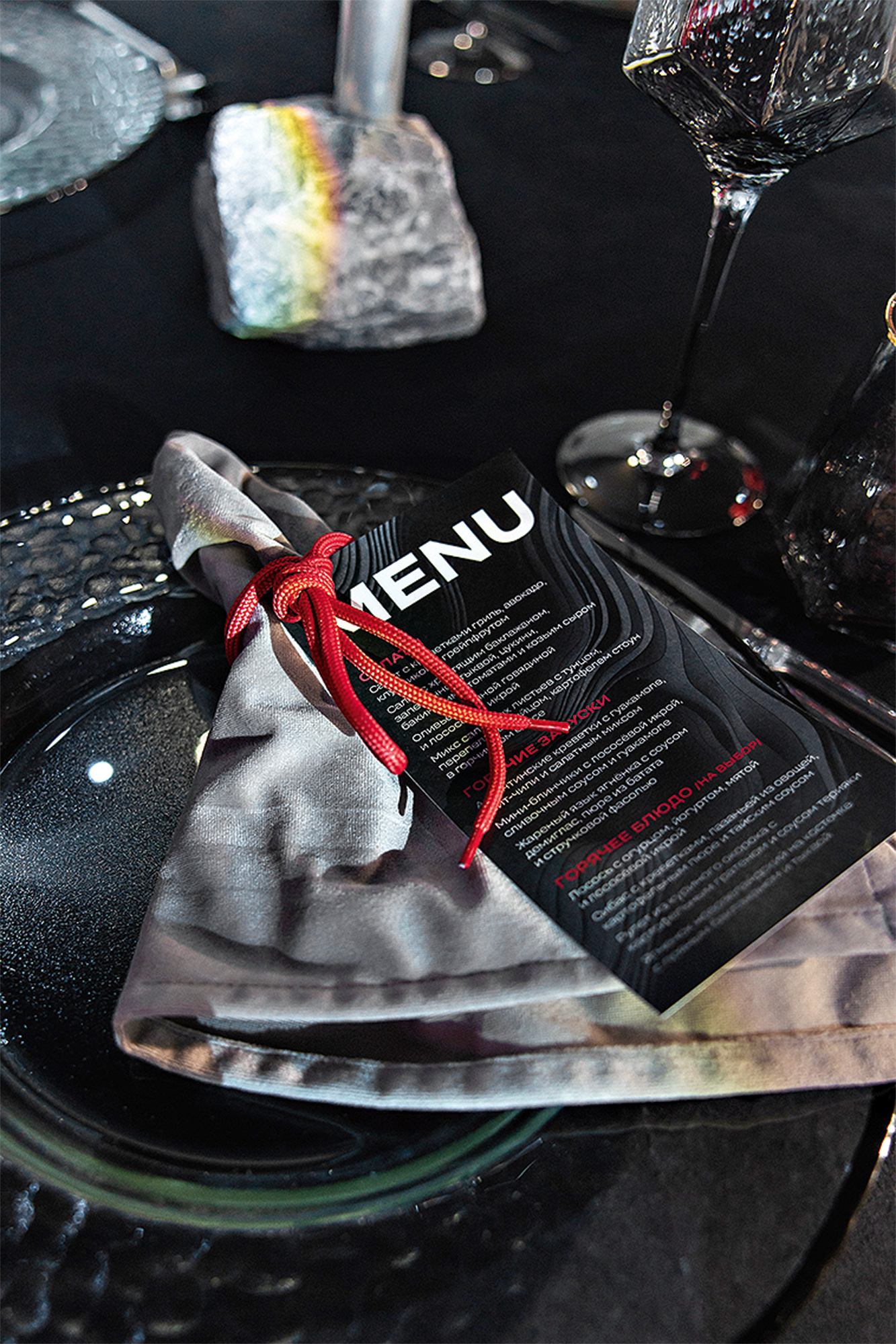 Просторный графитовый зал Royal Beach с панорамными окнами позволил создать камерное пространство внутри. Лаконичная флористика в пробирках с основанием из настоящего камня отсылала внутреннему стержню пары. А красный шнурок вместо стандартного кольца для салфетки напоминал о любви к коллекционированию необычной обуви. Каждый элемент был отражением характера молодых.