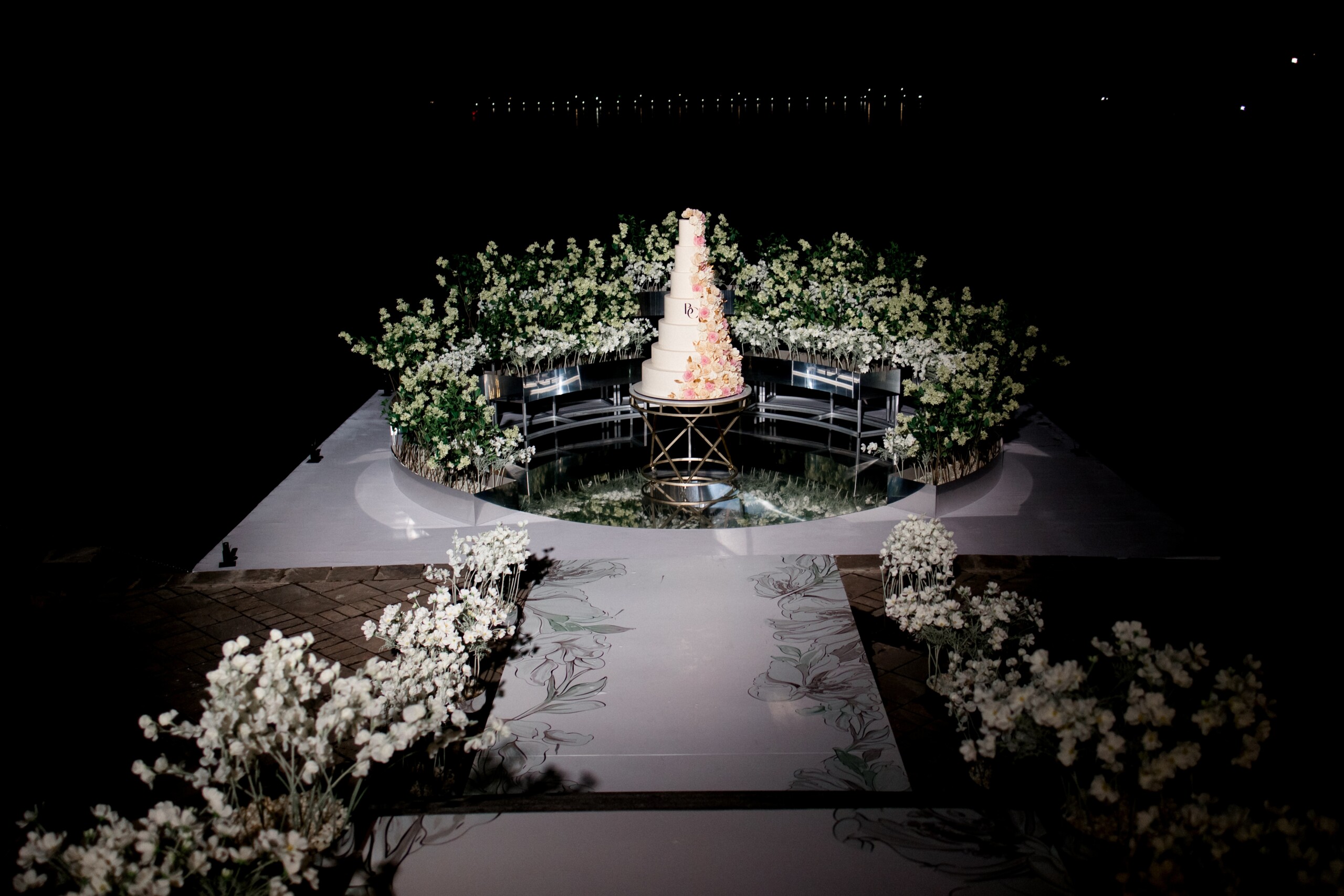 Торт в бело-розовых тонах с нежными цветами стал не только вкусным угощением, но и настоящим произведением искусства, которое украсило сладкий стол: он гармонично расположился среди цветочного великолепия, воплощавшего в себе легкость и изящество торжества.