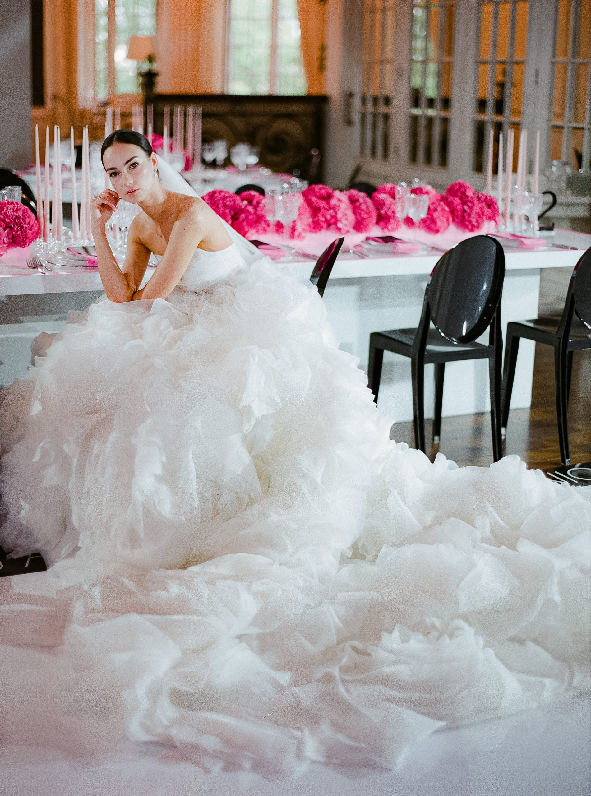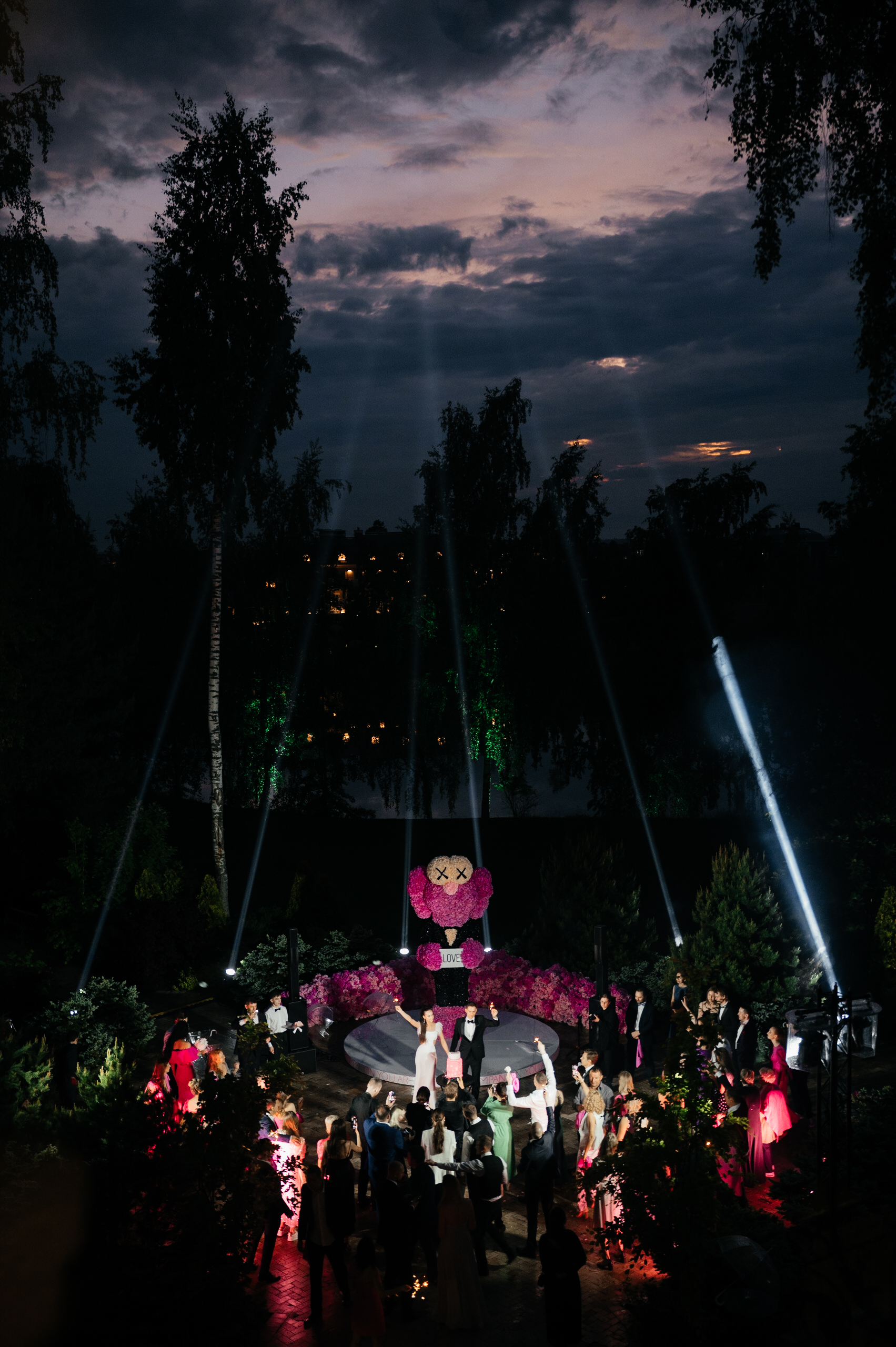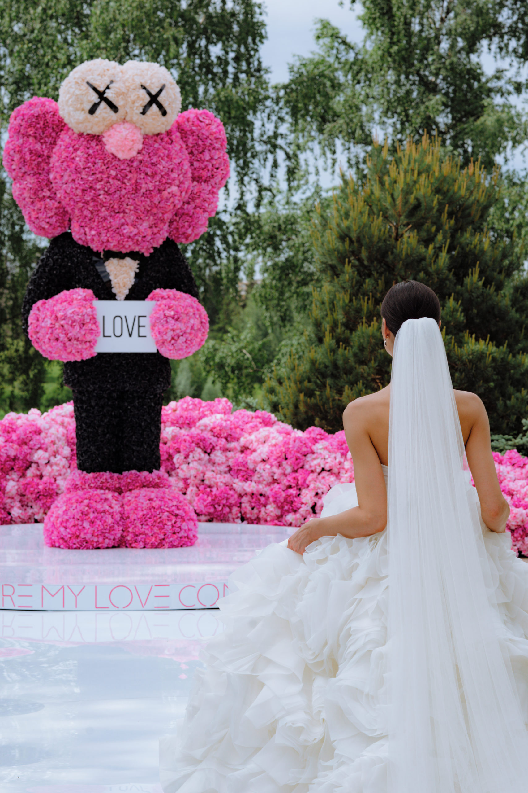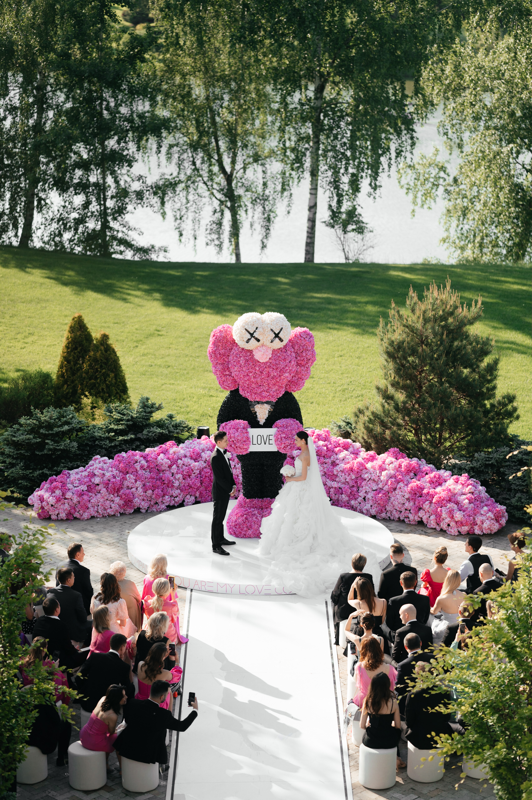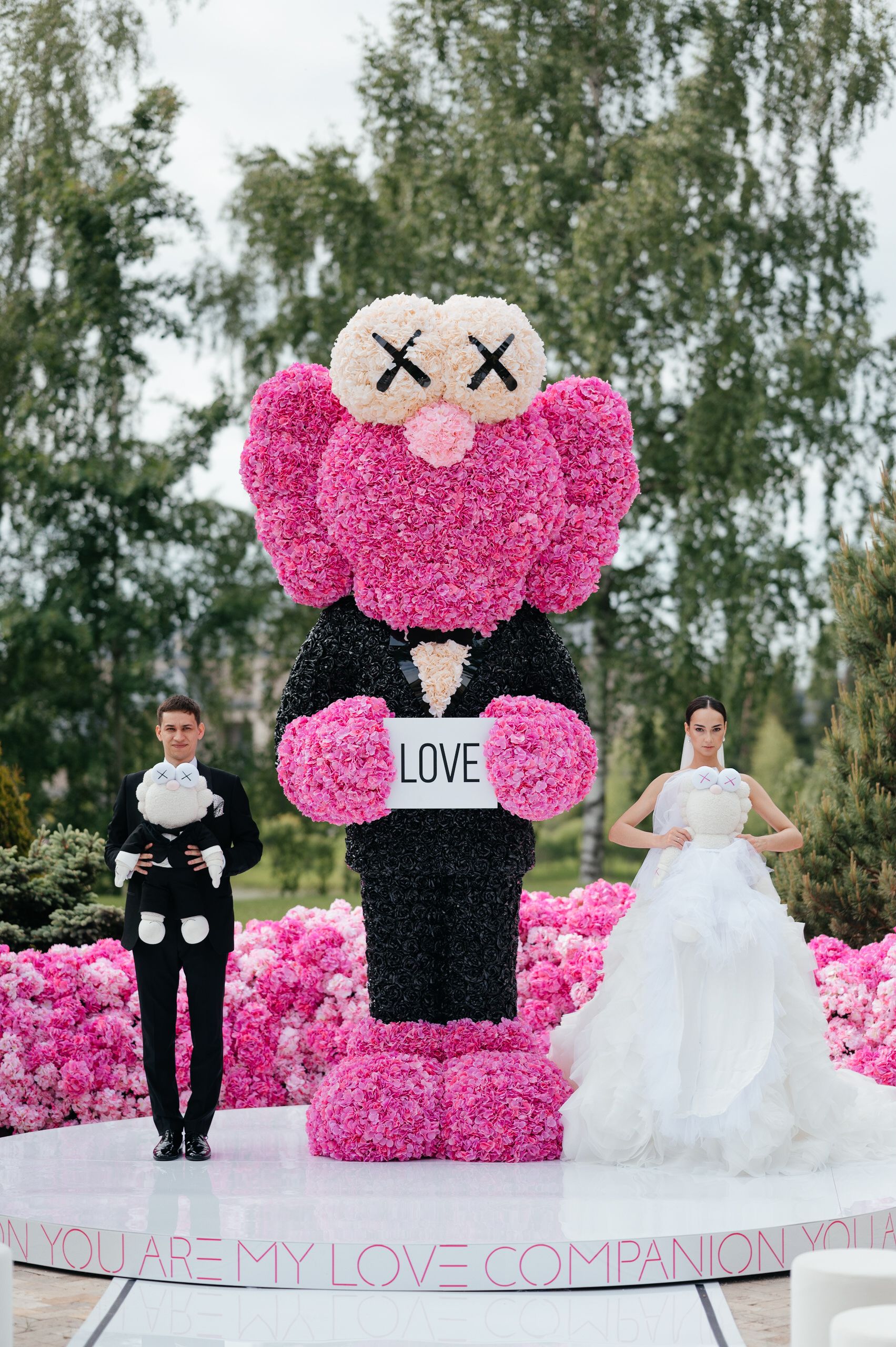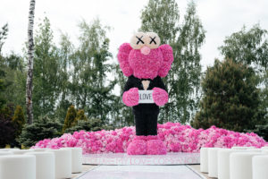 Несмотря на нестандартную концепцию, Даша, как любая девочка, хотела видеть красивую цветочную свадьбу. Ее любимый цветок — гортензия, в этом мы и нашли точку соприкосновения двух, на первый взгляд абсолютно разных, желаний. Главным арт-объектом церемонии стала четырехметровая фигура Сompanion BFF из гортензий, а зал, утопающий в цветах, стал настоящей розовой мечтой невесты.