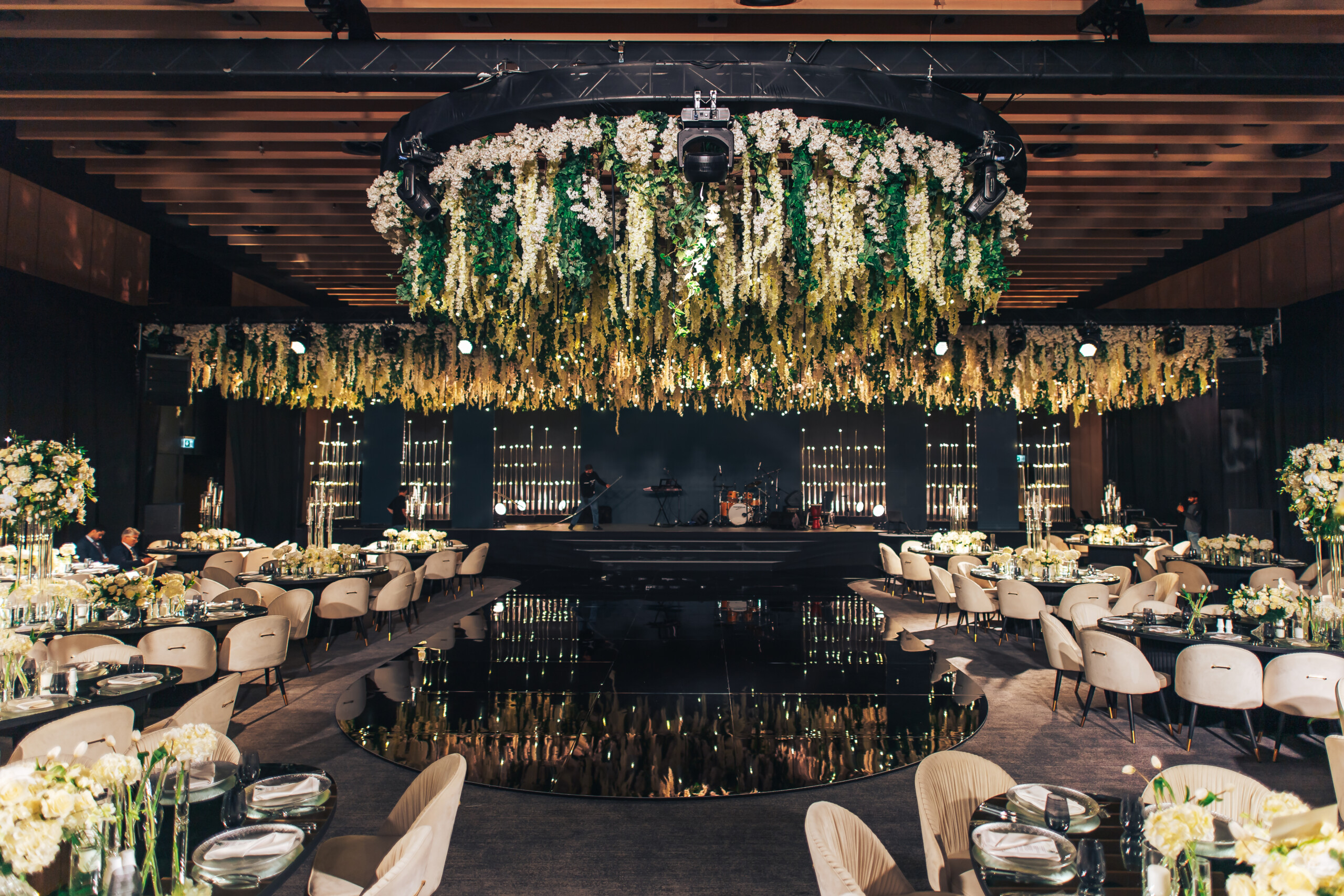 Лаконичное и чистое пространство удачно подстраиваться под самые разные тематики мероприятий. Также для гостей доступны терраса, откуда открывается потрясающий вид на Дубай. Стоит отметить, что банкетный зала отеля Banyan Tree расположен в отдельном здании, в отдалении от корпусов, где проживают гости, что позволяет проводить свадьбу в атмосфере приватности и уединения.