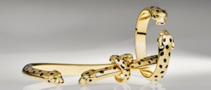 Новая коллекция Cartier La Panthere отдает дань уважения традиции Cartier создавать украшения с подвижными элементами. La Panthere состоит из шести предметов: кольца, браслета и колье с двумя головами пантер из желтого золота с цаворитами и из белого золота с бриллиантовым паве, ониксом и изумрудами. За естественный окрас отвечают геометрические черные пятнышки из лака или оникса, игриво расположенные по всей поверхности украшений.