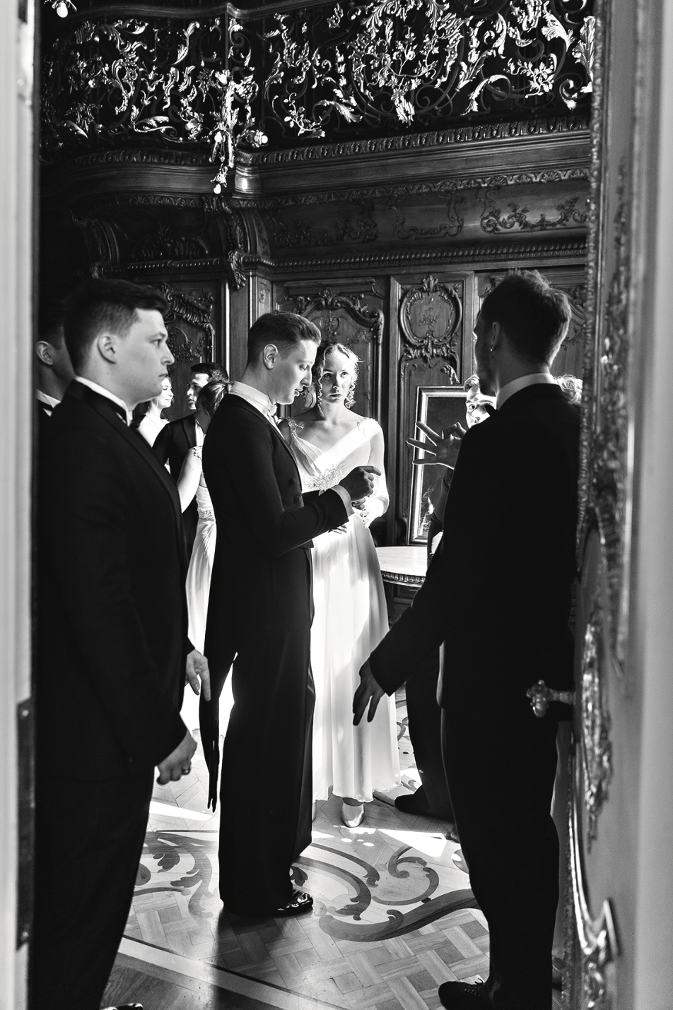 Этот формат становится все более популярным, у нас уже было несколько свадеб-балов. Они требуют некоторой подготовки для всех участников, но опыт показывает, что гости с удовольствием включаются в предложенную им историю, готовы строго соблюдать дресс-код и вообще в восторге от такой идеи. Один из устроенных нами балов был совсем небольшим, на четырнадцать человек, а другой, наоборот, вполне масштабным. Гости танцевали кадриль, галоп, вальс — и все это под чутким руководством танцмейстера. Ничего слишком сложного в этих танцах нет, и все очень удивляются и радуются, когда у них получается. А уж картинка в результате остается необычайной красоты.