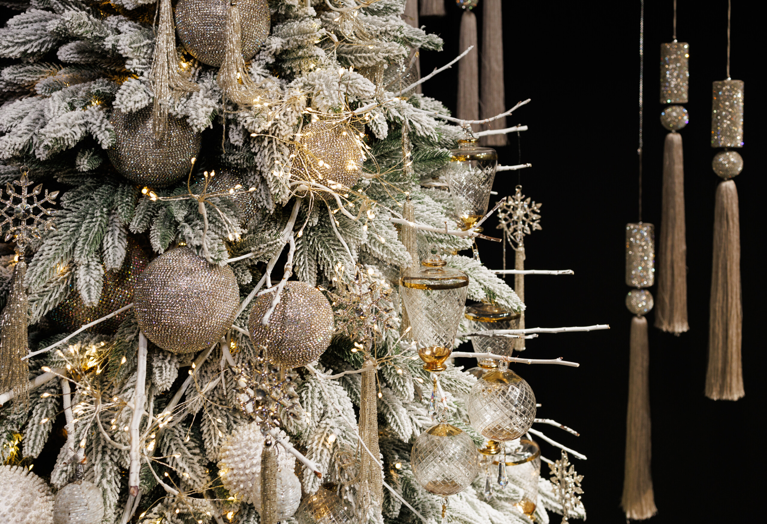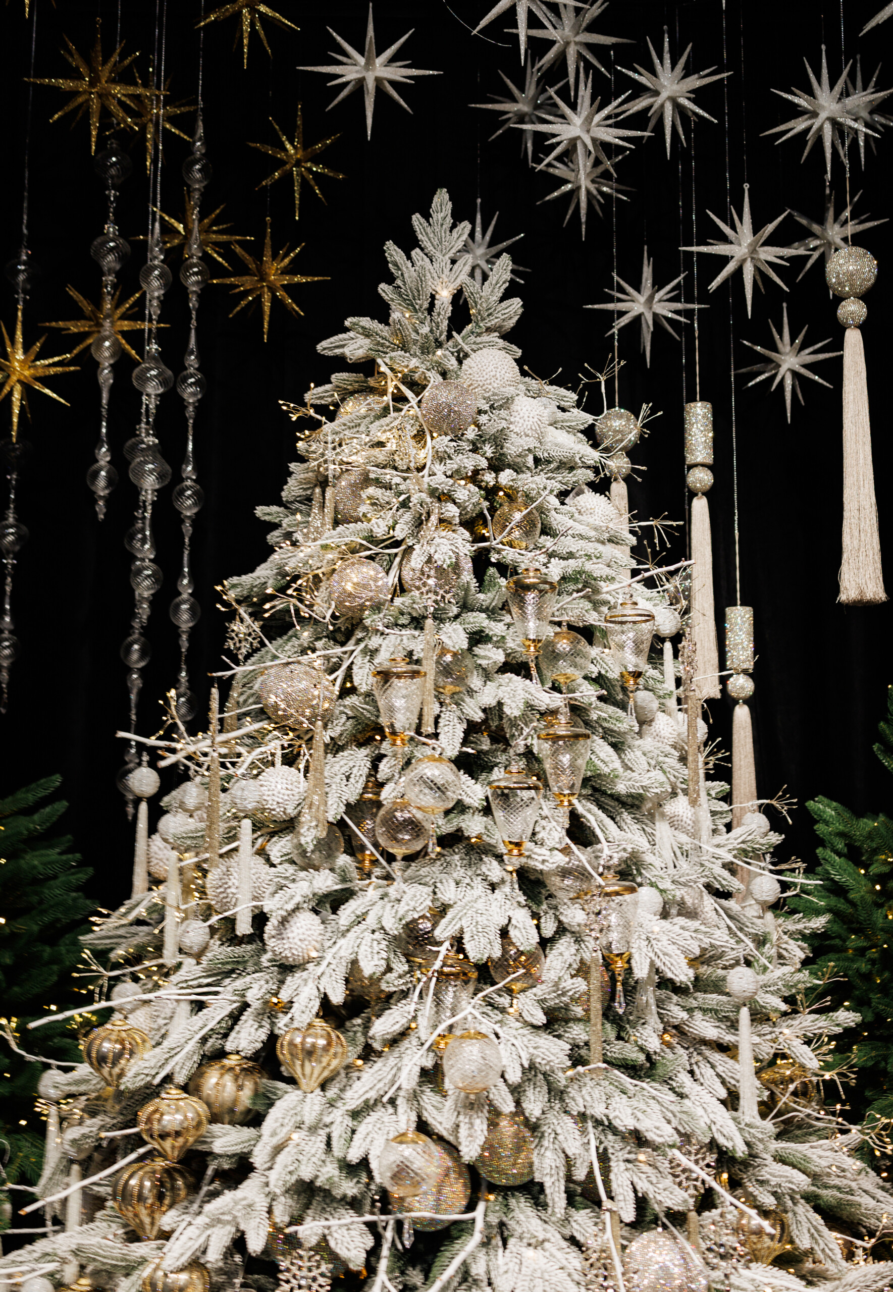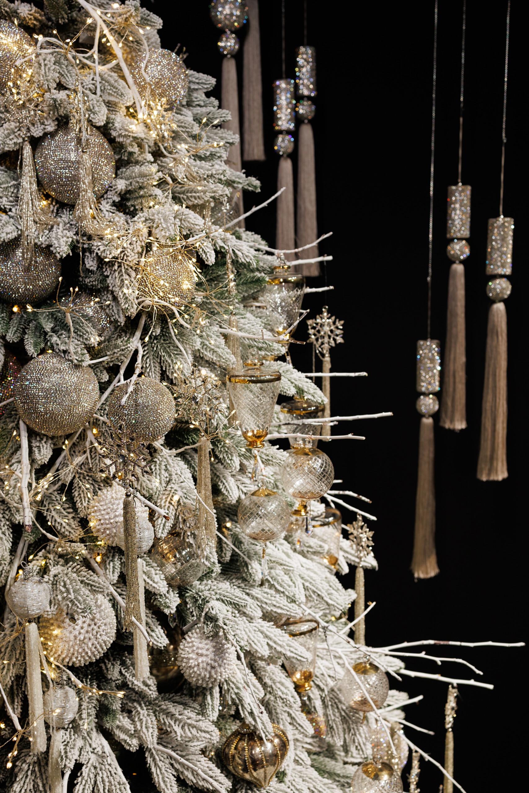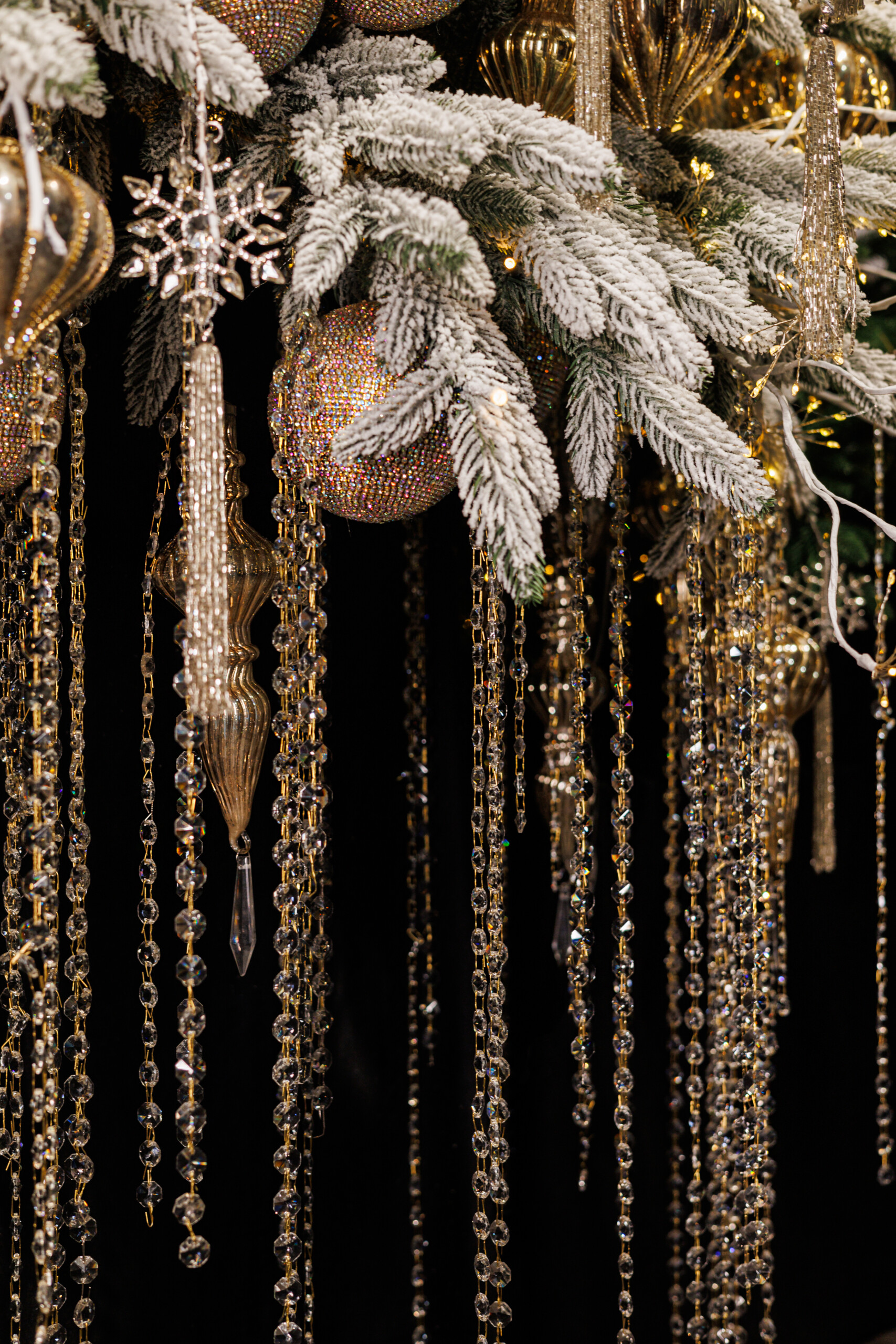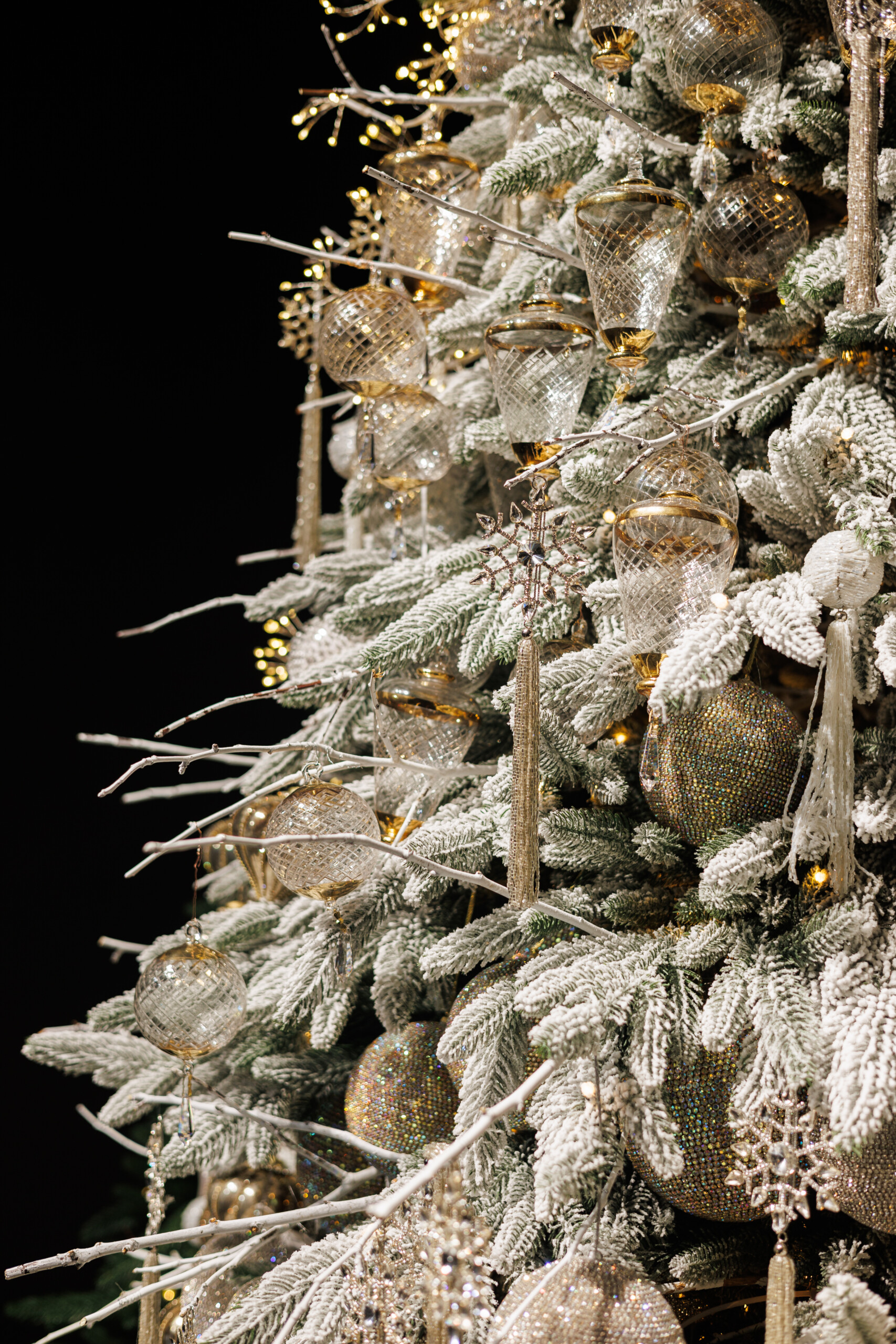 В декоре елки каскады елочных украшений и хрустальные подвесы гармонируют с сиянием белоснежных кристаллических шаров. В декоре елки WEDDING MAGAZINE x BEST DECOR PLACE используются хрустальные украшения ручной работы по авторским эскизам BEST DECOR PLACE, гирлянды с теплым белом светом и белоснежные шары со сверкающими кристаллами.