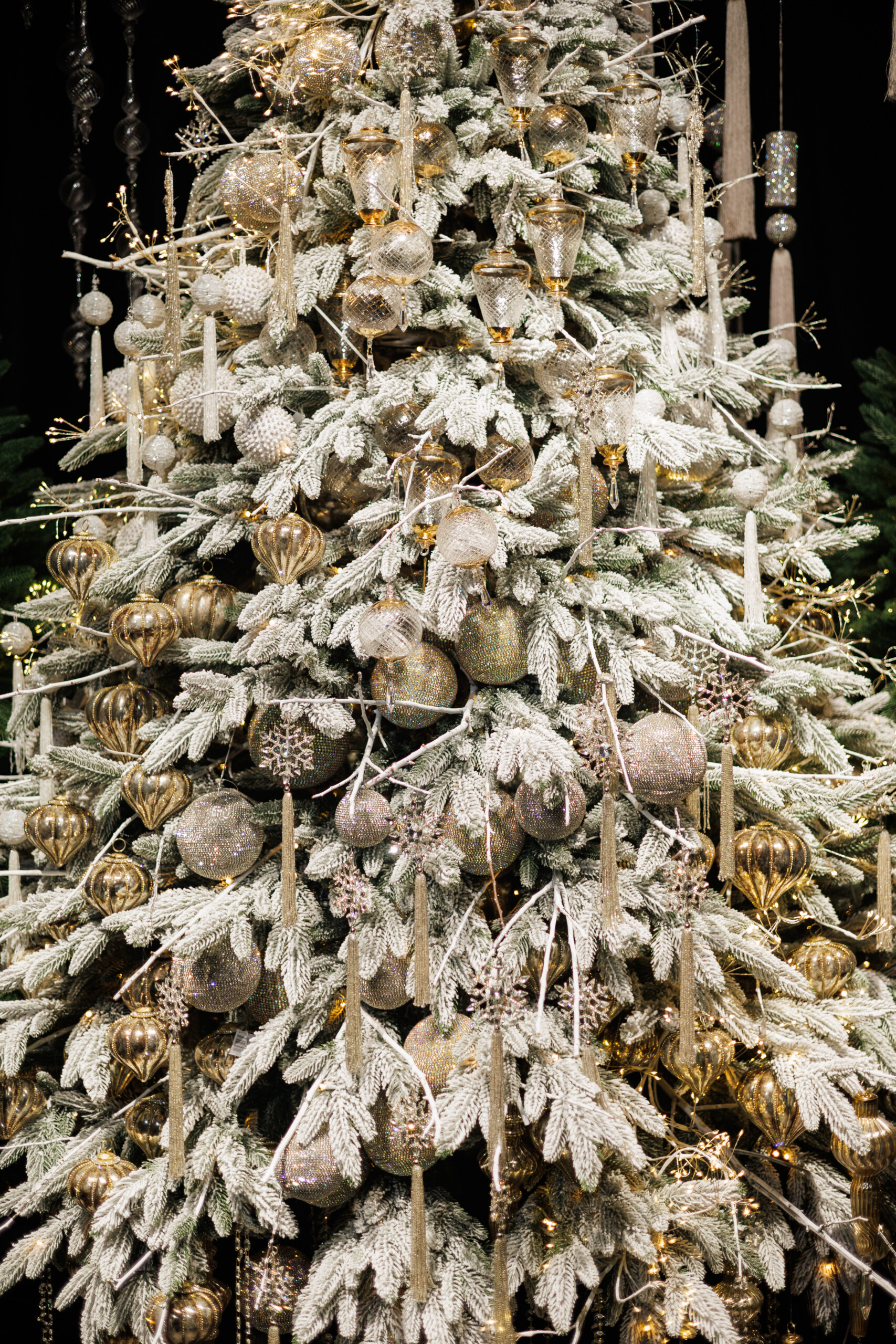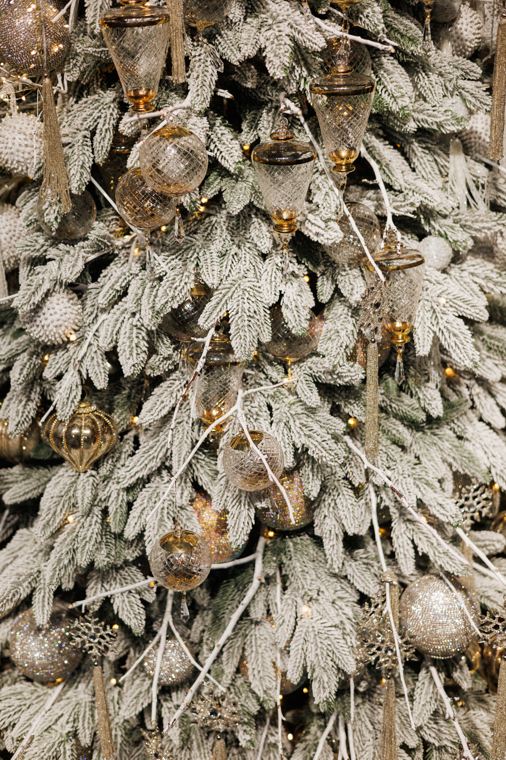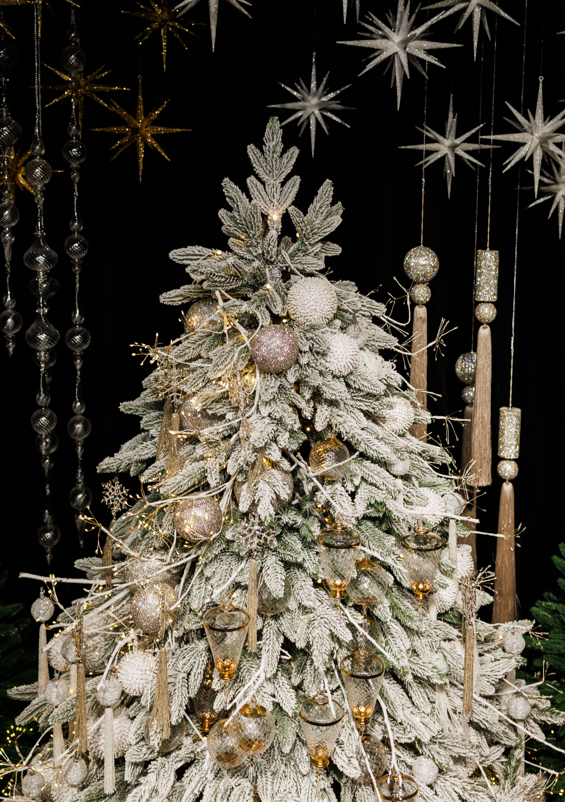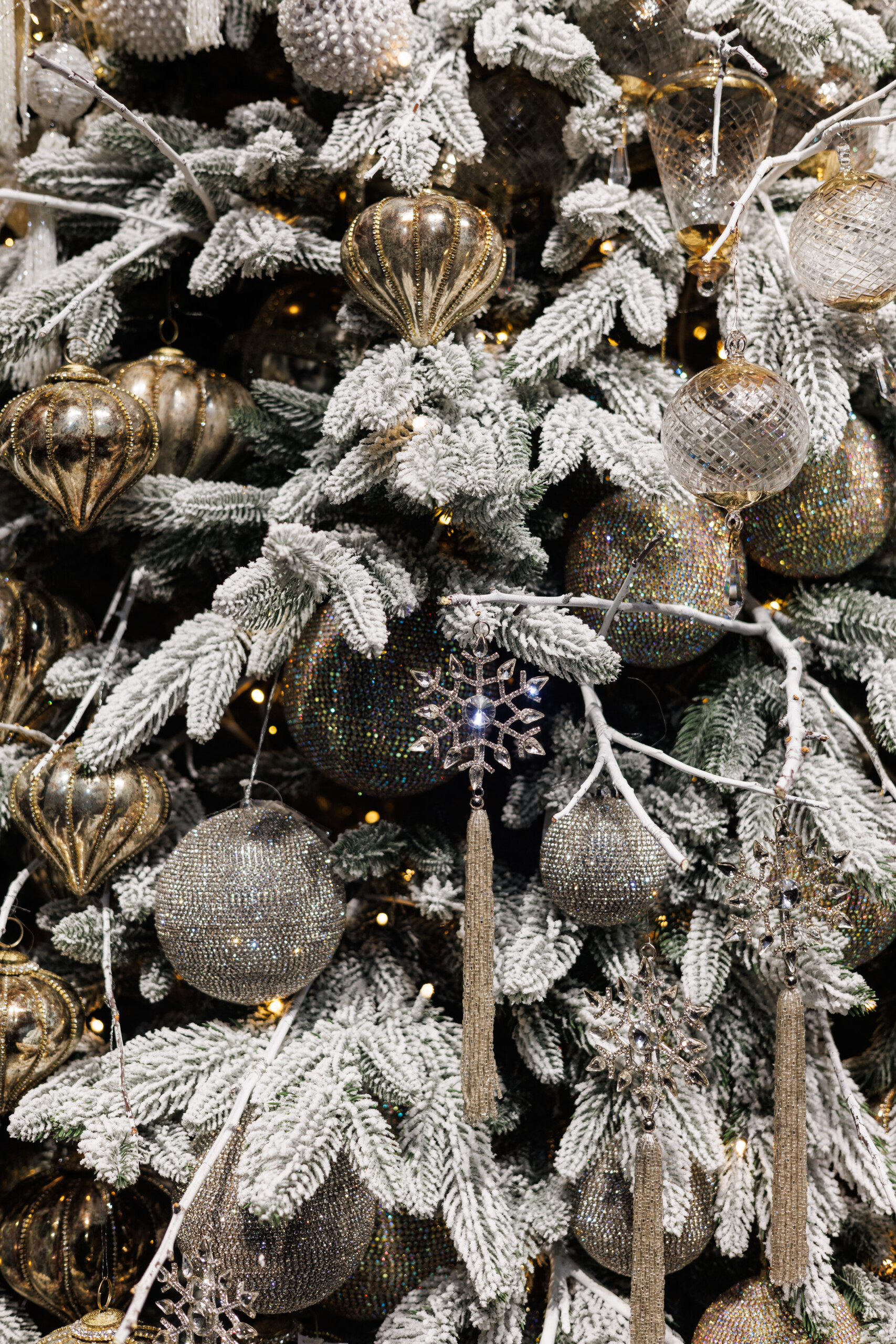 В декоре елки каскады елочных украшений и хрустальные подвесы гармонируют с сиянием белоснежных кристаллических шаров. В декоре елки WEDDING MAGAZINE x BEST DECOR PLACE используются хрустальные украшения ручной работы по авторским эскизам BEST DECOR PLACE, гирлянды с теплым белом светом и белоснежные шары со сверкающими кристаллами.
